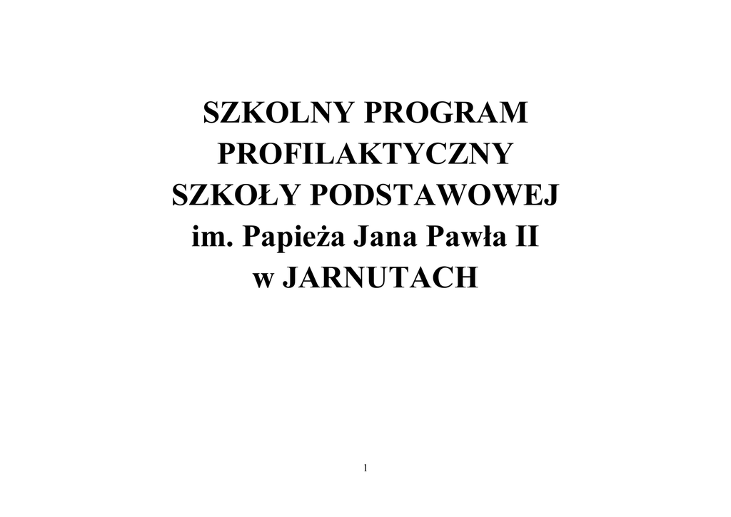 SZKOLNY PROGRAM PROFILAKTYCZNY SZKOŁY PODSTAWOWEJ im. Papieża Jana Pawła II w JARNUTACH 1 „ Wychowanie i profilaktyka mogą i powinny się wspomagać, ale trzeba pamiętać, że nie są tym samym.” Wprowadzenie Profilaktyka to ogół działań zapobiegających niepożądanym zjawiskom w rozwoju i zachowaniu się ludzi, a także wspomaganie człowieka w radzeniu sobie z trudnościami zagrażającymi prawidłowemu rozwojowi i zdrowemu stylowi życia, dlatego też w poniższym programie profilaktyka nastawiona jest na proces przeciwdziałania destrukcyjnym czynnikom poprzez eliminowanie lub redukcję czynników ryzyka oraz wzmacnianie czynników chroniących tj. poczucie własnej wartości. Celem programu jest wspomaganie wszechstronnego i harmonijnego rozwoju ucznia, kształtowanie postaw zdrowego i bezpiecznego stylu życia, kształtowanie umiejętności życiowych, jak również zapobieganie sytuacjom i zachowaniom problemowym. Podstawy Prawne Działań Profilaktycznych Szkołę w działaniach dotyczących edukacji prozdrowotnej wspomagają akty prawne takie jak: 1.Konstytucja Rzeczpospolitej Polskie z dnia 2 kwietnia 1997r. (Dz. U. Nr.78, poz.483) 2.Konwencja o Prawach Dziecka z dnia 20 listopada 1989r., ratyfikowana przez Polskę 30 kwietnia 1991r. (Dz. U. z 1991r. Nr 120, poz.526) z późniejszymi zmianami: 02.09.1999r. -Dz.U.2000.2.11 3.Ustawa z dnia 7 września 1991 r.o systemie oświaty z późniejszymi zmianami (tekst jednolity) 4.Ustawa z dnia 19 sierpnia 1994 r. o ochronie zdrowia psychicznego (Dz. U. 1994 nr 111 poz. 535)z późniejszymi zmianami 5.Rozporządzenie MENiS z dnia 31 stycznia 2003 roku w sprawie szczegółowych form działalności wychowawczej i zapobiegawczej wśród dzieci i młodzieży zagrożonych uzależnieniem 6.Rozporządzenie MEN w sprawie warunków i trybu dopuszczenia do użytku szkolnego programów nauczania 7.Rozporządzenie MEN rozporządzenie w sprawie ramowych statutów publicznego przedszkola oraz publicznych szkół 8.Ustawa z dnia 9 listopada 1995 roku o ochronie zdrowia przed następstwami używania tytoniu i wyrobów tytoniowych. 9.Ustawa z dnia 26 października 1982 roku o wychowaniu w trzeźwości i przeciw działaniu alkoholizmowi. 10.Rozporządzenie MEN z dnia 18 sierpnia 2015r. w sprawie zakresu i form prowadzenia w szkołach i placówkach systemu oświaty działalności wychowawczej, edukacyjnej, informacyjnej i profilaktycznej w celu przeciwdziałania narkomanii 11.Rozporządzenie MEN z dnia 17 czerwca 2016 r. zmieniające rozporządzenie w sprawie podstawy programowej wychowania przedszkolnego oraz kształcenia ogólnego w poszczególnych typach szkół 2 Cel ogólny programu: Planowanie i wdrażanie oddziaływań profilaktycznych na ucznia i jego środowisko w celu przygotowania uczniów do bezpiecznego stylu życia, zminimalizowania negatywnych wpływów środowiska oraz niepokojących zachowań jak agresja, przemoc, niska motywacja do nauki, absencja szkolna itp Cele szczegółowe programu: Eliminowanie agresywnych zachowań uczniów i stosowanej przez nich przemocy. Wdrażanie uczniów do przestrzegania norm zachowań dotyczących kultury osobistej. Uczenie rozwiązywania konfliktów w sposób konstruktywny, zapobieganie powstawaniu zachowań agresywnych oraz dążenie do panowania nad własnymi emocjami. Kształtowanie u uczniów umiejętności właściwego zachowania się w różnych sytuacjach życiowych. Dbałość uczniów o własne zdrowie i sprawność fizyczną, umiejętne planowanie i wykorzystywanie czasu wolnego. Wykształcenie właściwej postawy wobec problemów uzależnień. Pomoc uczniom mającym trudności w nauce, sprawiającym problemy wychowawcze. Motywowanie uczniów do nauki. Przygotowanie oferty zajęć rozwijających zainteresowania i uzdolnienia, jako alternatywnej pozytywnej formy działalności zaspakajającej ważne potrzeby, w szczególności potrzebę podniesienia samooceny, sukcesu, przynależności i satysfakcji życiowej. Kształtowanie i wzmacnianie postaw przeciwnych używaniu środków i substancji przez uczniów i wychowanków, a także postaw przeciwnych podejmowaniu innych zachowań ryzykownych. Zasady stosowane podczas realizacji programu: dostosowanie treści do wieku uczestników respektowanie podmiotowości uczestników programu zapewnienie prywatności uwzględnienie stopnia wrażliwości umożliwienie swobody wypowiedzi zachęcanie uczniów do dyskusji na proponowane tematy 3 Metody prowadzenia zajęć: 1. 2. 3. 4. 5. 6. miniwykład –wskazany ,gdy trzeba przekazać nowe, trudne treści burza mózgów –dzielenie się pomysłami, zbieranie najciekawszych propozycji i rozwiązań, rozwija twórcze myślenie, integruje grupę, odgrywanie ról i scenek- inscenizacja na tematy związane z treścią zajęć, konkursy, ćwiczenia praktyczne, zabawy. Realizacja tematyki jest wspierana przez: • wystrój szkoły, • działania Samorządu Szkolnego, • lekcje godzin wychowawczych (tematyka profilaktyczna uwzględniana w planach pracy poszczególnych wychowawców), • realizację tematów profilaktycznych na innych przedmiotach, • zajęcia warsztatowe dla uczniów, • szkolenia dla nauczycieli, • działania rodziców, • spotkania uczniów np.: z policjantem, • konkursy, festyny, ulotki, gazetki szkolne, • zajęcia profilaktyczne dla uczniów prowadzone przez pedagoga szkolnego, Ewaluacja programu: Uczeń w wyniku realizacji programu: zna normy i zasady zachowania i stara się ich przestrzegać, posiada podstawowe informacje o istniejących zagrożeniach, radzi sobie z przejawami przemocy, minimalizuje zachowania agresywne, zna swoją wartość, decyduje o sobie, potrafi ponieść konsekwencje własnych decyzji, 4 porozumiewać się z ludźmi bez barier komunikacyjnych, jest otwarty na siebie i innych. Uwagi o realizacji : Treści programu będą realizowane w kl. I-III na zajęciach kształcenia zintegrowanego w kl. IV-VI na godzinach do dyspozycji wychowawcy klasy. Ze względ