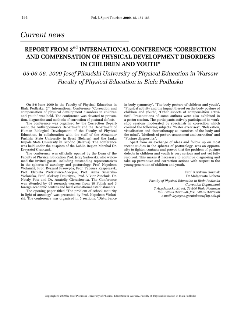 184 Pol. J. Sport Tourism 2009, 16, 184-185 Current news REPORT FROM 2nd INTERNATIONAL CONFERENCE “CORRECTION AND COMPENSATION OF PHYSICAL DEVELOPMENT DISORDERS IN CHILDREN AND YOUTH” 05-06.06. 2009 Josef Pilsudski University of Physical Education in Warsaw Faculty of Physical Education in Biała Podlaska On 5-6 June 2009 in the Faculty of Physical Education in Biała Podlaska, 2nd International Conference “Correction and compensation of physical development disorders in children and youth” was held. The conference was devoted to prevention, diagnostics and methods of correction of postural defects. The conference was organised by the Correction Department, the Anthropomorics Department and the Department of Human Biological Development of the Faculty of Physical Education, in collaboration with the staff of the Alexander Pushkin State University in Brest (Belarus) and the Janka Kupala State University in Grodno (Belarus). The conference was held under the auspices of the Lublin Region Marshal Dr. Krzysztof Grabczuk. The conference was officially opened by the Dean of the Faculty of Physical Education Prof. Jerzy Sadowski, who welcomed the invited guests, including outstanding representatives in the spheres of auxology and posturology: Prof. Napoleon Wolański, Prof. Ryszard Przewęda, Prof. Tadeusz Kasperczyk, Prof. Elżbieta Prętkiewicz-Abacjew, Prof. Anna SiniarskaWolańska, Prof. Aleksey Dmitriyev, Prof. Viktor Zinchuk, Dr. Nataly Pats and Dr. Anatoliy Gierasiewicz. The Conference was attended by 65 research workers from 18 Polish and 3 foreign academic centres and local educational establishments. The opening paper titled “The problem of school maturity in light of auxology” was presented by Prof. Napoleon Wolański. The conference was organised in 5 sections: “Disturbance in body symmetry”, “The body posture of children and youth”, “Physical activity and the impact thereof on the body posture of children and youth”, “Other aspects of compensation activities”. Presentations of some authors were also exhibited in a poster session. The participants actively participated in workshop sessions moderated by specialists in correction which covered the following subjects: “Water exercises”, “Relaxation, visualisation and choreotherapy as exercises of the body and the mind”, “Methods of posture assessment and correction” and “Posture diagnostics”. Apart from an exchange of ideas and follow up on most recent studies in the spheres of posturology, was an opportunity to tighten contacts and proved that the problem of posture defects in children and youth is very serious and not yet fully resolved. This makes it necessary to continue diagnosing and take up preventive and correction actions with respect to the young generation of children and youth. Prof. Krystyna Górniak Dr Małgorzata Lichota Faculty of Physical Education in Biała Podlaska Correction Department 2 Akademicka Street, 21-200 Biała Podlaska tel.: +48 83 3428750, fax: +48 83 3428800 e-mail: [email protected] Copyright © 2009 by Josef Piłsudski University of Physical Education in Warsaw, Faculty of Physical Education in Biala Podlaska