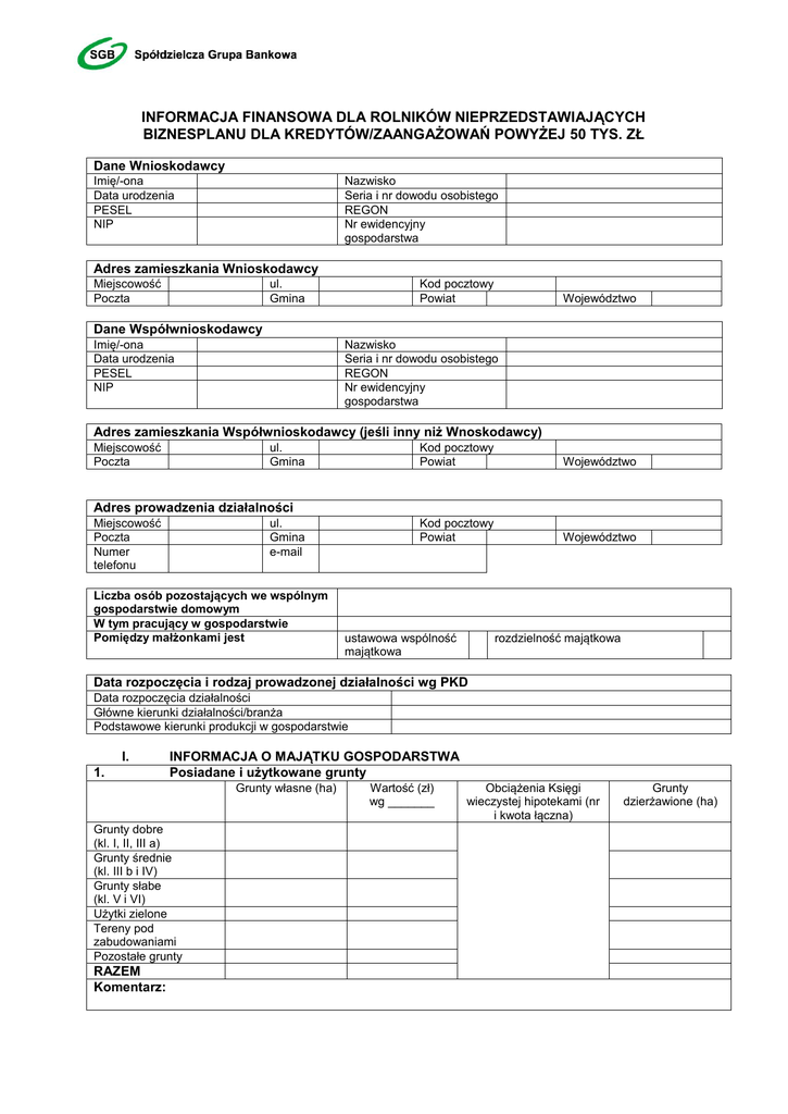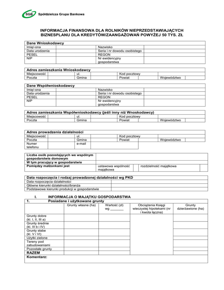 INFORMACJA FINANSOWA DLA ROLNIKÓW NIEPRZEDSTAWIAJĄCYCH BIZNESPLANU DLA KREDYTÓW/ZAANGAŻOWAŃ POWYŻEJ 50 TYS. ZŁ Dane Wnioskodawcy Imię/-ona Data urodzenia PESEL NIP Nazwisko Seria i nr dowodu osobistego REGON Nr ewidencyjny gospodarstwa Adres zamieszkania Wnioskodawcy Miejscowość Poczta ul. Gmina Kod pocztowy Powiat Województwo Dane Współwnioskodawcy Imię/-ona Data urodzenia PESEL NIP Nazwisko Seria i nr dowodu osobistego REGON Nr ewidencyjny gospodarstwa Adres zamieszkania Współwnioskodawcy (jeśli inny niż Wnoskodawcy) Miejscowość Poczta ul. Gmina Kod pocztowy Powiat Województwo Kod pocztowy Powiat Województwo Adres prowadzenia działalności Miejscowość Poczta Numer telefonu ul. Gmina e-mail Liczba osób pozostających we wspólnym gospodarstwie domowym W tym pracujący w gospodarstwie Pomiędzy małżonkami jest ustawowa wspólność majątkowa rozdzielność majątkowa Data rozpoczęcia i rodzaj prowadzonej działalności wg PKD Data rozpoczęcia działalności Główne kierunki działalności/branża Podstawowe kierunki produkcji w gospodarstwie I. 1. INFORMACJA O MAJĄTKU GOSPODARSTWA Posiadane i użytkowane grunty Grunty własne (ha) Grunty dobre (kl. I, II, III a) Grunty średnie (kl. III b i IV) Grunty słabe (kl. V i VI) Użytki zielone Tereny pod zabudowaniami Pozostałe grunty RAZEM Komentarz: Wartość (zł) wg _______ Obciążenia Księgi wieczystej hipotekami (nr i kwota łączna) Grunty dzierżawione (ha) 2. Budynki i budowle Rodzaj budynku RAZEM Komentarz: Rok budowy Aktualna wartość rynkowa w /zł/ wg polisy ubezpieczeniowej/wyceny rzeczoznawcy* Księga wieczysta i jej obciążenia X Posiadane maszyny i urządzenia rolnicze oraz pojazdy samochodowe 3. Rodzaj Rok produkcji Aktualna wartość rynkowa w /zł/ wg polisy ubezpieczeniowej/wyceny rzeczoznawcy* Obciążenia/ prawa osób trzecich RAZEM Komentarz: Jeśli nie zaznaczono inaczej, wypełniając dalszą część, rok bieżący rozumiany jest jako cały bieżący rok czyli dotychczasowe wykonanie + prognoza do końca roku a w przypadku prognozy podać należy dane wg roku planowanego największego obciążenia w okresie kredytowania 4. Stado podstawowe/aktywa obrotowe Wyszczególnienie Rok bieżący/stan na dzień__________ Ilość (ha, q, szt.) Wartość Stado podstawowe Produkcja roślinna w toku Zapasy ogółem, w tym: pasze środki do produkcji zboża Stado obrotowe Strona 2 z 5 Należności, w tym: dopłaty bezpośrednie Pozostałe, w tym: 5. Środki pieniężne Wyszczególnienie Prognoza na okres kredytowania (zł) Rok bieżący/kwota na dzień ____________________ Posiadana gotówka Środki pieniężne na rachunkach Lokaty Papiery wartościowe Jednostki uczestnictwa TFI Komentarz: 6. Pozostały majątek (np. działki budowlane) Aktualna wartość rynkowa w /zł/ Rodzaj Obciążenia/ prawa osób trzecich Komentarz: II. Prowadzona produkcja a) Produkcja zwierzęca Wyszczególnienie Dwa lata wstecz wartość /zł/ Rok ubiegły wartość /zł/ Rok bieżący ilość cena A. Sprzedaż produkcji zwierzęcej (wymienić poniżej) RAZEM SPRZEDAŻ B. Koszty produkcji zwierzęcej Zakup zwierząt ……………………. Zakup pasz Koszty weterynaryjne Pozostałe koszty RAZEM KOSZTY Dochód z produkcji zwierzęcej (A - B) Komentarz: x x x x x x x b) Produkcja roślinna Wyszczególnienie Dwa lata Rok ubiegły Strona 3 z 5 Rok bieżący wartość /zł/ wstecz wartość ** /zł/ Wartość** /zł/ ilość cena wartość ** /zł/ A. Struktura zasiewów i sprzedaż produkcji roślinnej (wymienić poniżej) RAZEM SPRZEDAŻ B. Koszty produkcji roślinnej Zakup nasion Zakup nawozów mineralnych Zakup środków ochrony roślin Pozostałe koszty RAZEM KOSZTY Dochód z produkcji roślinnej (A - B) Komentarz: x x x x x x x x x x **Wartość „0” jeśli produkcja na paszę III. Pozostałe przychody: Rodzaj Dwa lata wstecz /zł/ Rok ubiegły /zł/ Rok bieżący /zł/ Dopłaty bezpośrednie Przychody spoza gospodarstwa Inne ……………………… RAZEM IV. Koszty pośrednie Pozostałe koszty prowadzenia gospodarstw (koszty pośrednie) Wyszczególnienie Dwa lata wstecz /zł/ Rok ubiegły /zł/ Czynsz dzierżawny Zakup oleju, paliwa Remonty, naprawy Opał, gaz Koszty transportu Podatki Ubezpieczenia KRUS Płace i ZUS Inne, w tym: RAZEM Koszty finansowe w tym: kredytów krótkoterminowych kredytów długoterminowych Koszty utrzymania rodziny Komentarz: Strona 4 z 5 Rok bieżący /zł/ V. VI. VII. BILANS MAJĄTKOWY- załącznik nr 1 do niniejszej informacji RACHUNEK WYNIKÓW – załącznik nr 2 do niniejszej informacji PRZEPŁYWY GOTÓWKI – załącznik nr 3 do niniejszej informacji Oświadczam(y), iż w okresie kredytowania utrzymany zostanie trend działalności określony w powyższym dokumencie jako prognoza. Oświadczam(y), iż gospodarstwo spełnia/nie spełnia* kryteria ubiegania się o dopłaty bezpośrednie w tym: dobrej kultury rolnej, ochrony środowiska oraz identyfikacji i rejestracji zwierząt. *Niepotrzebne skreślić Świadom(i) odpowiedzialności karnej, wynikającej m.in. z art. 297 § 1 ustawy z dn.6.04.1997r (Dz.U. nr 88 poz. 553 z późn. zm.) kodeksu karnego, oświadczam(y), że wszystkie informacje podane w niniejszym dokumencie są prawdziwe , miejscowość, data pieczęć i podpis wnioskodawcy/-ów Strona 5 z 5