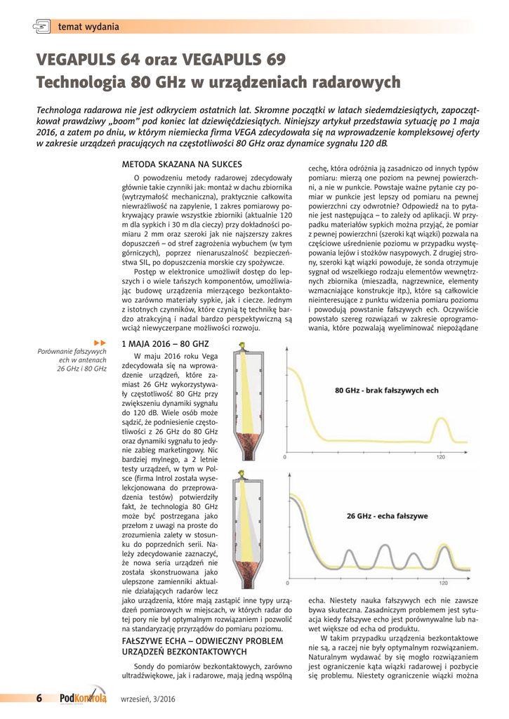 temat wydania VEGAPULS 64 oraz VEGAPULS 69 Technologia 80 GHz w urządzeniach radarowych Technologa radarowa nie jest odkryciem ostatnich lat. Skromne początki w latach siedemdziesiątych, zapoczątkował prawdziwy „boom” pod koniec lat dziewięćdziesiątych. Niniejszy artykuł przedstawia sytuację po 1 maja 2016, a zatem po dniu, w którym niemiecka firma VEGA zdecydowała się na wprowadzenie kompleksowej oferty w zakresie urządzeń pracujących na częstotliwości 80 GHz oraz dynamice sygnału 120 dB. METODA SKAZANA NA SUKCES O powodzeniu metody radarowej zdecydowały głównie takie czynniki jak: montaż w dachu zbiornika (wytrzymałość mechaniczna), praktycznie całkowita niewrażliwość na zapylenie, 1 zakres pomiarowy pokrywający prawie wszystkie zbiorniki (aktualnie 120 m dla sypkich i 30 m dla cieczy) przy dokładności pomiaru 2 mm oraz szeroki jak nie najszerszy zakres dopuszczeń – od stref zagrożenia wybuchem (w tym górniczych), poprzez nienaruszalność bezpieczeństwa SIL, po dopuszczenia morskie czy spożywcze. Postęp w elektronice umożliwił dostęp do lepszych i o wiele tańszych komponentów, umożliwiając budowę urządzenia mierzącego bezkontaktowo zarówno materiały sypkie, jak i ciecze. Jednym z istotnych czynników, które czynią tę technikę bardzo atrakcyjną i nadal bardzo perspektywiczną są wciąż niewyczerpane możliwości rozwoju. XX Porównanie fałszywych ech w antenach 26 GHz i 80 GHz 1 MAJA 2016 – 80 GHZ W maju 2016 roku Vega zdecydowała się na wprowadzenie urządzeń, które zamiast 26 GHz wykorzystywały częstotliwość 80 GHz przy zwiększeniu dynamiki sygnału do 120 dB. Wiele osób może sądzić, że podniesienie częstotliwości z 26 GHz do 80 GHz oraz dynamiki sygnału to jedynie zabieg marketingowy. Nic bardziej mylnego, a 2 letnie testy urządzeń, w tym w Polsce (firma Introl została wyselekcjonowana do przeprowadzenia testów) potwierdziły fakt, że technologia 80 GHz może być postrzegana jako przełom z uwagi na proste do zrozumienia zalety w stosunku do poprzednich serii. Należy zdecydowanie zaznaczyć, że nowa seria urządzeń nie została skonstruowana jako ulepszone zamienniki aktualnie działających radarów lecz jako urządzenia, które mają zastąpić inne typy urządzeń pomiarowych w miejscach, w których radar do tej pory nie był optymalnym rozwiązaniem i pozwolić na standaryzację przyrządów do pomiaru poziomu. FAŁSZYWE ECHA – ODWIECZNY PROBLEM URZĄDZEŃ BEZKONTAKTOWYCH Sondy do pomiarów bezkontaktowych, zarówno ultradźwiękowe, jak i radarowe, mają jedną wspólną 6 cechę, która odróżnia ją zasadniczo od innych typów pomiaru: mierzą one poziom na pewnej powierzchni, a nie w punkcie. Powstaje ważne pytanie czy pomiar w punkcie jest lepszy od pomiaru na pewnej powierzchni czy odwrotnie? Odpowiedź na to pytanie jest następująca – to zależy od aplikacji. W przypadku materiałów sypkich można przyjąć, że pomiar z pewnej powierzchni (szeroki kąt wiązki) pozwala na częściowe uśrednienie poziomu w przypadku występowania lejów i stożków nasypowych. Z drugiej strony, szeroki kąt wiązki powoduje, że sonda otrzymuje sygnał od wszelkiego rodzaju elementów wewnętrznych zbiornika (mieszadła, nagrzewnice, elementy wzmacniające konstrukcje itp.), które są całkowicie nieinteresujące z punktu widzenia pomiaru poziomu i powodują powstanie fałszywych ech. Oczywiście powstało szereg rozwiązań w zakresie oprogramowania, które pozwalają wyeliminować niepożądane wrzesień, 3/2016 echa. Niestety nauka fałszywych ech nie zawsze bywa skuteczna. Zasadniczym problemem jest sytuacja kiedy fałszywe echo jest porównywalne lub nawet większe od echa od produktu. W takim przypadku urządzenia bezkontaktowe nie są, a raczej nie były optymalnym rozwiązaniem. Naturalnym wydawać by się mogło rozwiązaniem jest ograniczenie kąta wiązki radarowej i pozbycie się problemu. Niestety ograniczenie wiązki można temat wydania było uzyskać do tej pory głównie przez zwiększenie rozmiarów anteny, co bardzo często natrafiało na uzasadniony opór użytkowników, z uwagi na konieczność przygotowania króćców o średnicy nawet 250 mm dla urządzeń pracujących na 26 GHz. Alternatywą metodą jest właśnie podniesienie częstotliwości modułu mikrofalowego z 26 GHz do 80 GHz – w takim przypadku zamiast przykładowo anteny DN250 wystarczy nam zaledwie DN80, a zamiast przyłącza kołnierzowego DN50 – gwintowe G ¾. Praktyczny przykład pomiaru w zbiorniku oleju z nagrzewnicami widać na 2 poniższych echach: serwis urządzenia i możliwość montażu na ruchu niczym nie różni się od standardowego przetwornika ciśnienia. DYNAMIKA SYGNAŁU 120 dB, CZYLI PO CO NAM DODATKOWE 24 dB Jak widać, o ile w przypadku urządzenia pracującego na 26 GHz pewność pomiaru budzi uzasadnione wątpliwości (3 podobne echa), tak w przypadku sondy VEGAPULS 64 pracującej na 80 GHz temat ech fałszywych w praktyce nie występuje (nie ma sensu nawet ich eliminować). KRÓĆCE POMIAROWE – NOWE MOŻLIWOŚCI Zastosowanie 80 GHz powinno również zainteresować osoby odpowiedzialne za montaż mechaniczny sond. Po pierwsze, duże zdziwienie towarzyszy zazwyczaj najmniejszej antenie, która wymaga króćca G ¾ cala. Zazwyczaj w pierwszym momencie radar jest mylony z … przetwornikiem ciśnienia VEGABAR. Co ciekawe, z uwagi na duże skupienie wiązki, największa dostępna antena o kącie 3,5 stopnia ma rozmiar tylko DN80. Drugą zauważalną zmianą jest wysokość króćców. Przeprowadzone testy dowiodły, że wysokość króćców dla technologii 80 GHz może być minimum 2 razy większa niż dla tradycyjnych sond. Na zdjęciu obok widać jeden z przykładów montażu na króćcu o wysokości 700 mm i średnicy 50 mm, co jeszcze niedawno były nieakceptowalne dla radarów. Ciekawą uwagą są nowe możliwości dotyczące montażu na zbiornikach z pod/nadciśnieniem, 
