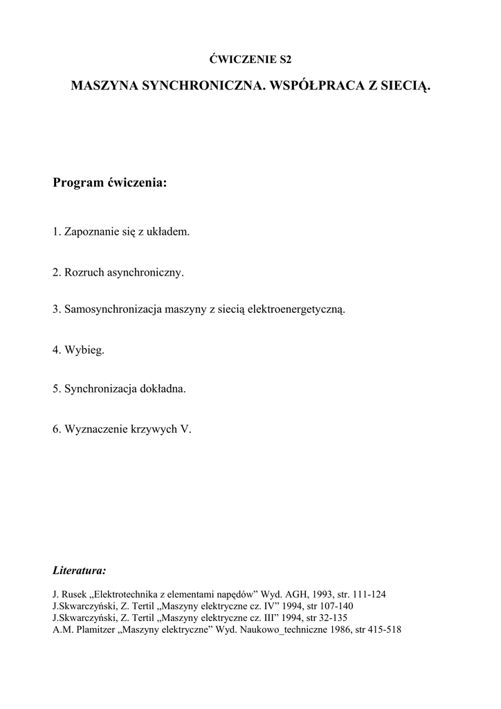 ĆWICZENIE S2 MASZYNA SYNCHRONICZNA. WSPÓŁPRACA Z SIECIĄ. Program ćwiczenia: 1. Zapoznanie się z układem. 2. Rozruch asynchroniczny. 3. Samosynchronizacja maszyny z siecią elektroenergetyczną. 4. Wybieg. 5. Synchronizacja dokładna. 6. Wyznaczenie krzywych V. Literatura: J. Rusek „Elektrotechnika z elementami napędów” Wyd. AGH, 1993, str. 111-124 J.Skwarczyński, Z. Tertil „Maszyny elektryczne cz. IV” 1994, str 107-140 J.Skwarczyński, Z. Tertil „Maszyny elektryczne cz. III” 1994, str 32-135 A.M. Plamitzer „Maszyny elektryczne” Wyd. Naukowo_techniczne 1986, str 415-518 1. Cel ćwiczenia. Ćwiczenie ma na celu zapoznanie studentów z własnościami dynamicznymi maszyn synchronicznych oraz zbadanie podstawowych własności ruchowych tych maszyn. Dane znamionowe maszyny: PN = 4 kW UN = 380 V IN = 7 A nN = 1500 obr/min fN = 50 Hz cosϕN = 0,86 If0N = 1,15 A J = 0,249 kgm2 (cały zespół) ΔPmech = 300 W ΔPFe = 197 W ΔPCu = 184 W RS20 = 1,25 Ω Uwaga: Wszystkie czynności związane z załączaniem i regulacją urządzeń znajdujących się na stanowisku mogą być dokonywane wyłącznie przez prowadzącego ćwiczenie lub przez studentów na wyraźne polecenie prowadzącego. Po zakończeniu każdej z serii pomiarów przewidzianych w programie ćwiczenia studenci powinni czekać na dalsze instrukcje prowadzącego. Absolutnie niedozwolone jest samodzielne zatrzymywanie zespołu lub wyłączanie jakichkolwiek urządzeń bez zgody prowadzącego ćwiczenie. 2. Rozruchu asynchroniczny silnika synchronicznego. Rozruch asynchroniczny maszyny możliwy jest dzięki litym biegunom wirnika i pierścieniom je zwierającym spełniającym rolę klatki rozruchowej. Ze względu na duże napięcia indukujące się w obwodzie wzbudzenia maszyny przy poślizgu bliskim jedności (gdy maszyna rusza) wymagane jest zwarcie tego obwodu opornicą R3 (załączaną przełącznikiem W3). Aby dokonać pełnego rozruchu, wartość rezystancji tej opornicy musi być odpowiednio duża, w przeciwnym wypadku może dojść do utknięcia wirnika w okolicy połowy prędkości synchronicznej (efekt Gorgesa). Należy dokonać rozruchu w dwóch przypadkach: pierwszy dla mniejszej wartości rezystancji opornicy – widoczny efekt Gorgesa, drugi przypadek dla większej wartości - rozruch płynny. Aby dokonać rozruchu należy wykonać następujące czynności: 1. uruchomić program LABMOT, a w nim wybrać Start, 2. w menu Kanały ustawić wzmocnienia kanałów, na których mierzone są wielkości tak, aby wskaźniki pod mierzonymi wielkościami w oknie głównym programu miały kolor zielony, 3. z menu Próby wybrać Rejestracja przebiegów czasowych, 4. w oknie które się otworzy z menu Dane należy wybrać Zacznij nową próbę, następnie w oknie, które się otworzy należy wpisać dane znamionowe maszyny i nacisnąć OK, 5. w oknie Wybór wielkości do rejestracji należy zaznaczyć Uab, Ia, nt, I1, 6. w oknie Pomiar ciągły... należy ustawić częstość na 1000 Hz, liczbę próbek na 10000, a ilość wykresów na 4, 7. przełącznik W3 ustawić w pozycji 1 ROZRUCH (zwarcie obwodu wzbudzenia opornicą R3), 8. suwak opornicy R3 ustawić w położeniu min, 9. załączyć stycznik ST1 przyciskiem ZAŁ (zielonym), 10. w oknie Pomiar ciągły... nacisnąć przycisk Start co powinno rozpocząć rejestrację i około sekundę później załączyć wyłącznik W2 w ten sposób uruchamiając maszynę, 11. po zakończeniu rejestracji należy wyłączyć wyłącznik W2, przycisnąć przycisk OK i z menu Wyniki wybrać Wykresy czasowe, 12. w otwartym oknie z rozwijanych menu Kanał wybrać kolejno Uab, Ia, I1, nt, dla Uab, Ia, I1, zaznaczyć Skut (wartość skuteczna) i wybrać filtry dolnoprzepustowe odpowiednio dla Uab, Ia, I1, 20 Hz, a dla nt 5 Hz; następnie należy nacisnąć przycisk Zrób wykres, 13. na wykresach, które się pojawią po przyciśnięciu prawego przycisku myszy z rozwijanego menu wybrać opcję Kopiuj dane do schowka, a następnie przycisnąć przycisk Wyjście; wyniki należy umieścić w arkuszu programu Excel poprzez komendę Wklej. Aby dokonać rejestracji dla drugiego przypadku należy ustawić suwak opornicy R3 w pozycji max, w oknie Pomiary czasowe wybrać opcję Pomiary, w oknie Pomiar ciągły... należy ustawić częstość na 1000 Hz, liczbę próbek na 10000, a ilość wykresów na 4. Następnie należy powtórzyć kroki 9 do 12, przy czym po dokonaniu drugiej rejestracji należy pozostawić załączony wyłącznik W2. 3. Samosynchronizacja maszyny z siecią elektroenergetyczną. Samosynchronizacja polega na załączeniu do sieci niewzbudzonej maszyny, a następnie po dokonaniu rozruchu i zbliżeniu się prędkości obrotowej wirnika do prędkości okołosynchronicznej, załączeniu wzbudzenia, przez co maszyna zostaje wciągnięta w synchronizm. Aby dokonać samosynchronizacji należy wykonać następujące czynności: 1. po dokonaniu rozruchu w poprzednim punkcie maszyna powinna być już uruchomiona, jeśli tak nie jest należy ją uruchomić załączając wyłącznik W2 (przełącznik W3 powinien być w położeniu 1 ROZRUCH), 2. w oknie Pomiary czasowe programu LABMOT wybrać opcję Pomiary, 3. w oknie Pomiar ciągły... należy ustawić częstość na 1000 Hz, liczbę próbek na 10000, a ilość wykresów na 4, 4. upewnić się, czy przełącznik W3 znajduje się w pozycji 1 ROZRUCH i za pomocą autotransformatora ustawić napięcie wzbudzenia na wartość około 20 V, 5. po odczekaniu kilku sekund w oknie Pomiar ciągły... nacisnąć przycisk Start i około sekundę później załączyć napięcie wzbudzenia poprzez przełączenie przełącznika W3 w pozycję 2 PRACA, 6. po zakończeniu rejestracji należy zostawić uruchomiony napęd (nie wyłączać niczego) i przycisnąć przycisk OK, 7. z menu Wyniki należy wybrać Wykresy czasowe, 8. w otwartym oknie z rozwijanych menu Kanał wybrać kolejno Uab, Ia, I1, nt, dla Uab, Ia, I1, zaznaczyć Skut (wartość skuteczna