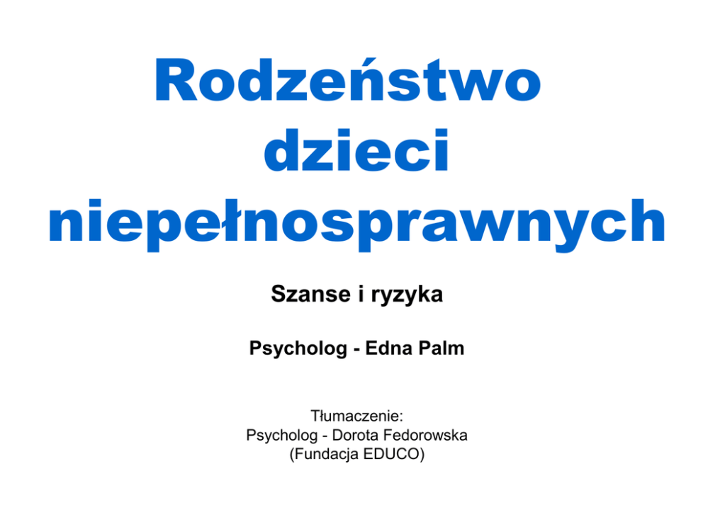 Rodzeństwo dzieci niepełnosprawnych Szanse i ryzyka Psycholog - Edna Palm Tłumaczenie: Psycholog - Dorota Fedorowska (Fundacja EDUCO) Czynniki obciążające rodziny posiadające niepełnosprawne dziecko Obciążenie emocjonalne Dodatkowe obciążenie materialne i organizacyjne Nagła konfrontacja z istniejącymi normami społecznymi Dezorientacja we wzajemnych relacjach rodzinnych / zaburzenie równowagi wewnątrz rodziny Możliwe zasoby rodziny Przekonania (wewnętrzne nastawienie, religia) Związki społeczne (satysfakcja ze związku małżeńskiego, rodzina, przyjaciele) Zasoby zewnętrzne (dochody, poziom wykształcenia, warunki mieszkaniowe) Zdrowie, energia, obyczajowość (wiek matki, dobre samopoczucie psychiczne i fizyczne, poziom zadowolenia w codziennym życiu) Istnieją zasadnicze różnice w procesach przepracowywania pomiędzy rodzicami i rodzeństwem dzieci niepełnosprawnych Rodzice Rodzeństwo • Kryzys życiowy, prowadzący do relatywnie dojrzałej osobowości • Zmiana dotychczasowej koncepcji życia • Przewlekły proces stale zachodzącej adaptacji • Obciążanie rodziców zaistniałą sytuacją • Brak zmiany orientacji celów rozwojowych: Odejście od rodziny i budowanie samodzielnego życia • Często pozbawiony uprzedzeń kontakt z niepełnosprawnym rodzeństwem Co oznacza niepełnosprawne dziecko w rodzinie dla jego rodzeństwa ? Wczesną konfrontację z cierpieniem Zakaz rywalizacji z chorym dzieckiem Często występujący rozwój poczucia winy Mniejszy dostęp do rodziców Ograniczone możliwości zawierania przyjaźni Doświadczanie zamiany ról w stosunku do kolejności urodzeń (np. młodsze w roli starszego) Częste pojawianie się lęków Życie w rodzinie odmiennej od innych Jakie czynniki sprzyjają pozytywnemu rozwojowi rodzeństwa? Osobowość rodziców Atmosfera w rodzinie • • • • Wzorce rodzicielskie Adaptacja rodziny do niepełnosprawności Postawa rodziców wobec siebie nawzajem Sposób komunikowania się w rodzinie Kontakty zewnętrzne Podział czasu Rodzaj i stopień niepełnosprawności Sytuacja społeczno-ekonomiczna Rodzeństwo rozwija się prawidłowo, gdy: Ma przeważnie pozytywny stosunek do niepełnosprawnego dziecka Umie odgraniczyć siebie od niepełnosprawnego rodzeństwa Odczuwa również negatywne emocje, do których umie się przyznać, i wolno mu je wyrażać Nie wstydzi się (już) niepełnosprawnego dziecka w kontaktach ze światem zewnętrznym, środowiskiem Posiada przeważnie pozytywny obraz siebie Planuje swoją przyszłość niezależnie od niepełnosprawnego dziecka („Ma odwagę być w pewien sposób egoistyczne”) Oznaki niepomyślnego rozwoju : Nadmierne dostosowanie społeczne Depresyjność; agresja Wyraźny dystans rodzeństwa do chorego dziecka Doświadczanie własnej bezsilności w kontakcie z niepełnosprawnym rodzeństwem Pomocne dla rodzeństwa są: Otwarte rozmowy oraz dostosowane do wieku informacje na temat niepełnosprawności, wsparcia, planów na przyszłość Kontakt z wychowawcami i nauczycielami zdrowych dzieci Obecność życzliwych osób spoza rodziny Społeczno-ekonomiczne wsparcie dla rodzeństwa, ze szczególnym uwzględnienie rodzeństwa pochodzącego z rodzin zaniedbanych społecznie Wyuczenie efektywnych strategii radzenia sobie: • w kontaktach z trudnymi, agresywnymi dziećmi niepełnosprawnymi • w sytuacjach konfliktowych w środowisku społecznym Pomocne dla rodziny jest: Poważne potraktowanie subiektywnej perspektywy dotkniętej problemem rodziny oraz współdecydowanie o doradztwie i działaniach terapeutycznych Działania doradcze i/lub terapeutyczne powinny być starannie dostosowane do dynamiki związków panujących w rodzinie oraz budowane na istniejących kompetencjach i zasobach W planowaniu terapii dziecka niepełnosprawnego należy uwzględnić sytuację rodziny oraz możliwe problemy rodzeństwa Podsumowanie: Rodzeństwo dzieci niepełnosprawnych bardzo wcześnie doświadcza znacznego dodatkowego obciążenia Rozwój w towarzystwie dziecka niepełnosprawnego może być również bodźcem sprzyjającym rozwojowi i kształtowaniu charakteru Dużej części rodzeństwa udaje się osiągnąć z wiekiem stabilną osobowość Wiele z tych osób charakteryzuje w późniejszym okresie szczególna dojrzałość, tolerancja, wrażliwość, zdolność radzenia sobie z obciążeniem oraz zaangażowanie społeczne Pokonanie „krytycznych wydarzeń życiowych” jest w dużej mierze możliwe dzięki wpływowi rodziny Rodzeństwo potrzebuje wsparcia ze strony społeczeństwa
