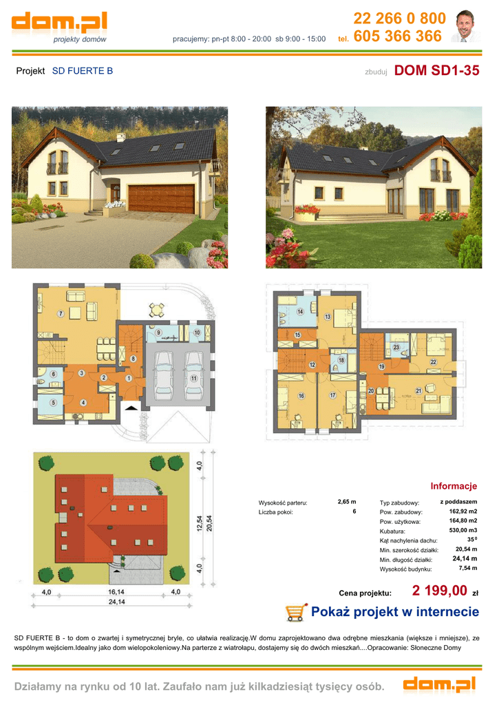 pracujemy: pn-pt 8:00 - 20:00 sb 9:00 - 15:00 22 266 0 800 tel. 605 366 366 Projekt SD FUERTE B zbuduj DOM SD1-35 Informacje Wysokość parteru: Liczba pokoi: 2,65 m 6 Typ zabudowy: z poddaszem Pow. zabudowy: 162,92 m2 Pow. użytkowa: 164,80 m2 Kubatura: 530,00 m3 Kąt nachylenia dachu: 35 0 Min. szerokość działki: 20,54 m Min. długość działki: 24,14 m Wysokość budynku: 7,54 m Cena projektu: 2 199,00 zł Pokaż projekt w internecie SD FUERTE B - to dom o zwartej i symetrycznej bryle, co ułatwia realizację.W domu zaprojektowano dwa odrębne mieszkania (większe i mniejsze), ze wspólnym wejściem.Idealny jako dom wielopokoleniowy.Na parterze z wiatrołapu, dostajemy się do dwóch mieszkań....Opracowanie: Słoneczne Domy Działamy na rynku od 10 lat. Zaufało nam już kilkadziesiąt tysięcy osób.