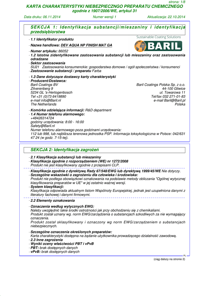 39.6.1 strona: 1/8 KARTA CHARAKTERYSTYKI NIEBEZPIECZNGO PREPARATU CHEMICZNEGO zgodnie z 1907/2006/WE, artykul 31 Data druku: 06.11.2014 Numer wersji 1 Aktualizacja: 22.10.2014 S E KCJ A 1 : I de n ty f i k a c j a s ubs ta n c j i / m i e s z a n i n y i i de nty fi k a c j a przedsiębiorstwa · 1.1 Identyfikator produktu · Nazwa handlowa: DEV AQUA NP FINISH MAT GA · Numer artykułu: 86052 · 1.2 Istotne zidentyfikowane zastosowania substancji lub mieszaniny oraz zastosowania odradzane · Sektor zastosowania SU21 Zastosowania konsumenckie: gospodarstwa domowe / ogół społeczeństwa / konsumenci · Zastosowanie substancji / preparatu Farba · 1.3 Dane dotyczące dostawcy karty charakterystyki · Producent/Dostawca: Baril Coatings BV Zilverenberg 9 5234 GL 's-Hertogenbosch Tel +31 (0)73 6419890 e-mail [email protected] The Netherlands Baril Coatings Polska Sp. z o.o. 44-100 Gliwice ul. Towarowa 11 Tel/fax 032 271-01-83 e-mail [email protected] Polska · Komórka udzielająca informacji: R&D department · 1.4 Numer telefonu alarmowego: +48426314724 godziny urzędowania: 8:00 - 16:00 [email protected] Numer telefonu alarmowego poza godzinami urzędowania: 112 lub 998, lub najbliższa terenowa jednostka PSP. Informacja toksykologiczna w Polsce: 042/631 47 24 (w godz. 7-15-tej). SEKCJA 2: Identyfikacja zagrożeń · 2.1 Klasyfikacja substancji lub mieszaniny · Klasyfikacja zgodnie z rozporządzeniem (WE) nr 1272/2008 Produkt nie jest klasyfikowany zgodnie z przepisami CLP. · Klasyfikacja zgodnie z dyrektywą Rady 67/548/EWG lub dyrektywą 1999/45/WE Nie dotyczy. · Szczególne wskazówki o zagrożeniu dla człowieka i środowiska: Produkt nie podlega obowiązkowi oznakowania na podstawie metody obliczania "Ogólnej wytycznej klasyfikowania preparatów w UE" w jej ostatnio ważnej wersji. · System klasyfikacji: Klasyfikacja odpowiada aktualnym listom Wspólnoty Europejskiej, jednak jest uzupełniona danymi z literatury fachowej i danymi firmowymi. · 2.2 Elementy oznakowania · Oznaczenia według wytycznych EWG: Należy uwzględnić takie środki ostrożności jak przy obchodzeniu się z chemikaliami. Produkt został uznany wg. norm EWG/zarządzenia o substancjach szkodliwych za nie wymagający oznaczenia. Produkt został sklasyfikowany i oznaczony wg norm EWG/zarządzeniem o substancjach niebezpiecznych. · Szczególne oznaczenia określonych preparatów: Karta charakterystyki dostępna na żądanie użytkownika prowadzącego działalność zawodową. · 2.3 Inne zagrożenia · Wyniki oceny właściwości PBT i vPvB · PBT: brak dostępnych danych · vPvB: brak dostępnych danych PL (ciąg dalszy na stronie 2) 39.6.1 strona: 2/8 KARTA CHARAKTERYSTYKI NIEBEZPIECZNGO PREPARATU CHEMICZNEGO zgodnie z 1907/2006/WE, artykul 31 Data druku: 06.11.2014 Numer wersji 1 Aktualizacja: 22.10.2014 Nazwa handlowa: DEV AQUA NP FINISH MAT GA (ciąg dalszy od strony 1) SEKCJA 3: Skład/informacja o składnikach · 3.2 Charakterystyka chemiczna: Mieszaniny · Opis: Mieszanka żywiczna · Składniki niebezpieczne: brak · Wskazówki dodatkowe: Pełna treść przytoczonych wskazówek dotyczących zagrożeń znajduje się w rozdziale 16. SEKCJA 4: Środki pierwszej pomocy · 4.1 Opis środków pierwszej pomocy · Wskazówki ogólne: Środki specjalne nie są konieczne. · Po wdychaniu: Dostarczyć świeże powietrze, w razie dolegliwości wezwać lekarza. · Po styczności ze skórą: Ogólnie produkt nie działa drażniąco na skórę. · Po styczności z okiem: Płukać oczy z otwartą powieką przez kilka minut pod bieżącą wodą. · Po przełknięciu: Przy trwałych dolegliwościach porozumieć się z lekarzem. · 4.2 Najważniejsze ostre i opóźnione objawy oraz skutki narażenia Brak dostępnych dalszych istotnych danych · 4.3 Wskazania dotyczące wszelkiej natychmiastowej pomocy lekarskiej i szczególnego postępowania z poszkodowanym Brak dostępnych dalszych istotnych danych SEKCJA 5: Postępowanie w przypadku pożaru · 5.1 Środki gaśnicze · Przydatne środki gaśnicze: CO2, proszek gaśniczy lub strumień wody. Większy pożar zwalczać strumieniem wody lub pianą odporną na działanie alkoholu. · 5.2 Szczególne zagrożenia związane z substancją lub mieszaniną Brak dostępnych dalszych istotnych danych · 5.3 Informacje dla straży pożarnej · Specjalne wyposażenie ochronne: Środki specjalne nie są konieczne. SEKCJA 6: Postępowanie w przypadku niezamierzonego uwolnienia do środowiska · 6.1 Indywidualne środki ostrożności, wyposażenie ochronne i procedury w sytuacjach awaryjnych Nie konieczne. · 6.2 Środki ostrożności w zakresie ochrony środowiska: Rozcieńczyć dużą ilością wody. Nie dopuścić do przeniknięcia do kanalizacji /wód powierzchniowych /wód gruntowych. · 6.3 Metody i materiały zapobiegające rozprzestrzenianiu się skażenia i służące do usuwania skażenia: Zebrać za pomocą materiału wiążącego ciecze (piasek, ziemia okrzemkowa, materiał wiążący kwasy, materiał wiążący uniwersalny, trociny). · 6.4 Odniesienia do innych sekcji Informacje na temat bezpiecznej obsługi patrz rozdział 7. Informacje na temat osobistego wyposażenia ochronnego patrz rozdział 8. Informacje na temat utylizacji patrz rozdział 13. PL (ciąg dalszy na stronie 3) 39.6.1 strona: 3/8 KARTA CHARAKTERYSTYKI NIEBEZPIECZNGO PREPARATU CHEMICZNEGO zgodnie z 1907/2006/WE, artykul 31 Data druku: 06.11.2014 Numer wersji 1 Aktualizacja: 22.10.2014 Nazwa handlowa: DEV AQUA NP FINISH MAT GA (ciąg dalszy od strony 2) SEKCJA 7: Postępowanie z substancjami i mieszaninami oraz ich magazynowanie · 7.1 Środki ostrożności dotyczące bezpiecznego postępowania Środki specjalne nie są konieczne. · Wskazówki dla ochrony przeciwpożarowej i przeciwwybuchowej: Nie są potrzebne szczególne zabiegi. · 7.2 Warunki bezpiecznego magazynowania, łącznie z informacjami dotyczącymi wszelkich wzajemnych niezgodności · Magazynowanie: · Wymagania w stosunku do pomieszczeń sk