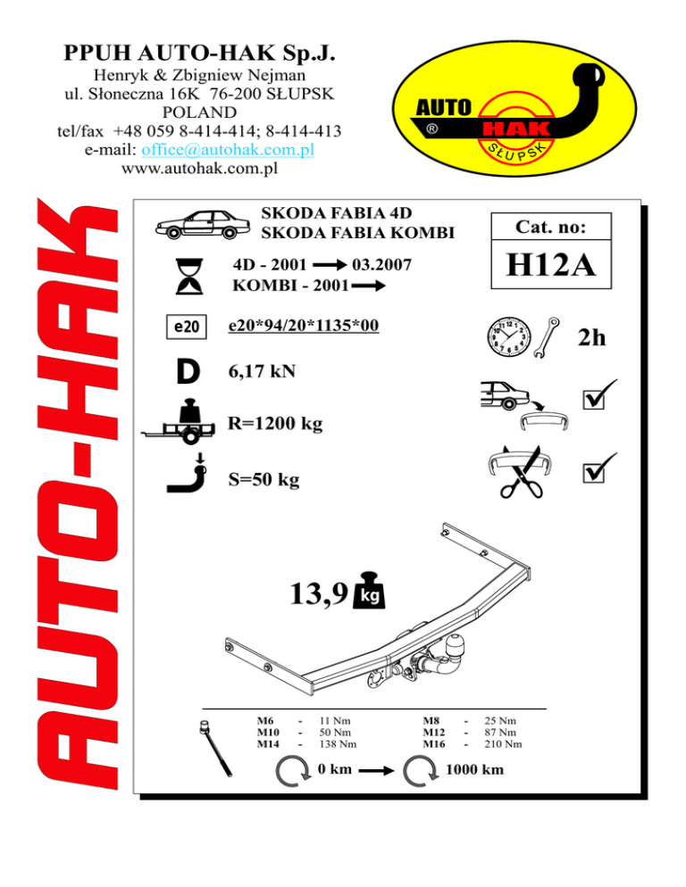 PPUH AUTO-HAK Sp.J. Henryk & Zbigniew Nejman ul. Słoneczna 16K 76-200 SŁUPSK POLAND tel/fax +48 059 8-414-414; 8-414-413 e-mail: [email protected] www.autohak.com.pl AUTO HAK ® SKODA FABIA 4D SKODA FABIA KOMBI H12A 4D - 2001 03.2007 KOMBI - 2001 e 20 e20*94/20*1135*00 D 6,17 kN 2h R=1200 kg S=50 kg 13,9 M6 M10 M14 - 11 Nm 50 Nm 138 Nm 0 km kg M8 M12 M16 - 25 Nm 87 Nm 210 Nm 1000 km OD PRODUCENTA: PL Dziękujemy za wybór produkowanego przez naszą firmę zaczepu kulowego. Jego niezawodność została potwierdzona licznymi testami oraz opiniami zadowolonych klientów. Jednakże niezawodność zaczepów kulowych jest zależna również od prawidłowego montażu oraz prawidłowej eksploatacji. Z tego powodu prosimy Państwa o staranne przeczytanie niniejszej instrukcji montażu oraz przestrzeganie właściwych wskazówek. Zaczep należy zamontować w miejscach do tego celu przeznaczonych przez producenta samochodu. FROM MANUFACTURER: GB Thank you for buying our product. Their reliability has been confirmed in many tests. Reliability of towbar depends also on correct assembly and right operation. For this reasons we kindly ask to read carefully this instruction and apply to hints. The towbar should be install in points described by a car producer. VON DEM HERSTELLER: D Die Zuverlässigkeit der Anhängekupplung ist jedoch auch von der ordnungsgemäßen Montage und der richtigen Nutzung abhängig. Daher werden Sie gebeten, sorgfältig die folgende Montageanleitung zu lesen und sich an die entsprechenden Anweisungen zu halten. Die Anhängekupplung muss an den vom Fahrzeughersteller vorgeschriebenen Befestigungsstellen montiert werden. DE LA PART DU FABRICANT: F Merci d'avoir choisi le dispositif d'attelage à boule produit par notre société. Son fiabilité a été confirmée dans de nombreux tests et par les opinions des clients satisfaits. Toutefois, la fiabilité des dispositifs d'attelage à boule dépend aussi d'installation et d'exploitation correcte. Pour cette raison, nous vous demandons de lire attentivement cette instruction de montage et de respecter les conseils. Le dispositif d'attelage à boule doit être monté dans des emplacements prévus a ce but par le fabricant de voiture. FRA PRODUCENTEN: DK Tak fordi De har valgt vores anhængertræk. Dets pålidelighed er blevet bekræftet i mange undersøgelser samt af tilfredse kunder. Vores anhængertræks pålidelighed er også afhængig af korrekt montering og korrekt betjening. Af denne grund beder vi Dem at læse denne instruktion grundigt og overholde de korrekte anvisninger. DE PRODUCTOR: E Gracias por la elección del enganche de bola producido por nuestra empresa. Su fiabilidad fue confirmada por numerosos testos y opiniones de los clientes quienes estuvieron contentos. Sin embargo la fiabilidad de enganche de bola depende también de un montaje adecuado y su explotación adecuada. Por esa causa por favor leer atentamente la instrucción del montaje y observar adecuadas indicadoras. VAN DE FABRIKANT: NL Bedankt voor de aanschaf van onze kogeltrekhaak. Hoe betrouwbaar die is blijkt wel uit vele tests en meningen van tevreden klanten. Toch is de betrouwbaarheid van een kogeltrekhaak er mede van afhankelijk dat deze correct gemonteerd is en op de juiste manier wordt gebruikt. Daarom wordt u verzocht deze montagehandleiding zorgvuldig te lezen en de aanwijzingen te volgen. FRA PRODUSENTEN: N Takk for at dere har valgt kulefestet produsert av vårt firma. Driftssikkerheten på kulefestet har blitt bekreftet av flere tester og tilbakemeldinger fra fornøyde kunder. Allikevel er driftssikkerheten også avhengig av en korrekt montering og riktig bruk. Derfor ber vi dere om å lese denne monteringsinstruksen nøye og anbefaler at dere følger veiledningen. ETT BUDSKAP FRÅN TILLVERKAREN: S Vi skulle vilja tacka er för ert val och inköp. Våra dragkrokars pålitlighet har bevisats av olika tester samt referenser från nöjda kunder. Man får inte glömma att dragkrokars pålitlighet beror också på rätt installation och rätt bruk. Därför skulle vi vilja be att ni läser noga denna installationsanvisning och följer alla regler och tips som den anger. Dragkroken ska installeras i ett ställe som blivit påpekade av biltillverkaren. DAL FABBRICANTE: IT -2- Vi ringraziamo per aver scelto il gancio di traino a sfera prodotto dalla nostra azienda. La sua affidabilità è stata confermata da numerosi test e dalle opinioni positive dei clienti. Tuttavia, il perfetto funzionamento dei ganci di traino a sfera dipende anche dalla correttezza del montaggio e dall'utilizzo appropriato. Per questo motivo, Vi preghiamo di leggere attentamente le presenti istruzioni di montaggio e di attenervi alle indicazioni in esse contenute. Il gancio di traino deve essere montato nei punti predisposti a tal fine dal fabbricante del veicolo. PL GB D F Należy zagwarantować przestrzeń swobodną według załącznika VII, ilustracja 30 wytycznej 94/20/WE przy dopuszczalnym ciężarze całkowitym pojazdu. The clearance specified in appendix VII, diagram 30 of guideline 94/20/EC must be guaranteed at laden weight of the vehicle. Der Freiraum nach Anhang VII,Abbildung 30 der Richtlinie94/20/EG ist zu gewährleistenbei zulässigem Gesamtgewichtdes Fahrzeuges. L’ e s p a c e l i b r e d o i t ê t r e garanticonformément à l’annexe VII,illustration 30 de la directive94/20/CE pour poids total encharge autorisé du véhicule. A-A DK I overensstemmelse med bilag VII, figur 30 til retningslinie 94/20/EF for køretøjets tilladte totalvægt skal der garanteres en friplads. E Hay que garantizar un espacio suelto según archivo adjunto VII, ilustración 30 trazado 94/20/WE de peso admisible y total del vehículo. NL N Det skal sørges for fritt rom ifølge vedlegget VII, illustrasjon 30 retningslinjen 94/20/WE ved den tillatte totale vekten av fartøyet. S Man ska garantera ett fritt tillgängligt utrymme - se bilaga VII, diagram 30 enligt riktlinjer 94/20/WE v