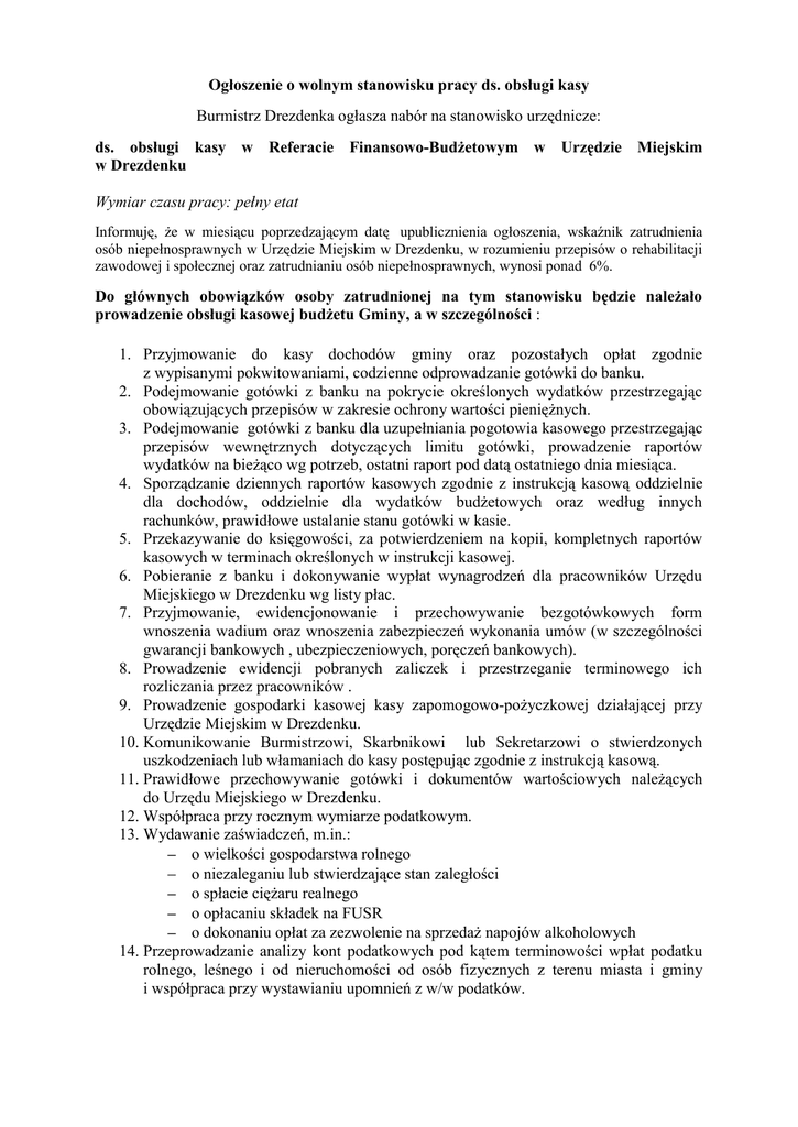 Ogłoszenie o wolnym stanowisku pracy ds. obsługi kasy Burmistrz Drezdenka ogłasza nabór na stanowisko urzędnicze: ds. obsługi kasy w Referacie Finansowo-Budżetowym w Urzędzie Miejskim w Drezdenku Wymiar czasu pracy: pełny etat Informuję, że w miesiącu poprzedzającym datę upublicznienia ogłoszenia, wskaźnik zatrudnienia osób niepełnosprawnych w Urzędzie Miejskim w Drezdenku, w rozumieniu przepisów o rehabilitacji zawodowej i społecznej oraz zatrudnianiu osób niepełnosprawnych, wynosi ponad 6%. Do głównych obowiązków osoby zatrudnionej na tym stanowisku będzie należało prowadzenie obsługi kasowej budżetu Gminy, a w szczególności : 1. Przyjmowanie do kasy dochodów gminy oraz pozostałych opłat zgodnie z wypisanymi pokwitowaniami, codzienne odprowadzanie gotówki do banku. 2. Podejmowanie gotówki z banku na pokrycie określonych wydatków przestrzegając obowiązujących przepisów w zakresie ochrony wartości pieniężnych. 3. Podejmowanie gotówki z banku dla uzupełniania pogotowia kasowego przestrzegając przepisów wewnętrznych dotyczących limitu gotówki, prowadzenie raportów wydatków na bieżąco wg potrzeb, ostatni raport pod datą ostatniego dnia miesiąca. 4. Sporządzanie dziennych raportów kasowych zgodnie z instrukcją kasową oddzielnie dla dochodów, oddzielnie dla wydatków budżetowych oraz według innych rachunków, prawidłowe ustalanie stanu gotówki w kasie. 5. Przekazywanie do księgowości, za potwierdzeniem na kopii, kompletnych raportów kasowych w terminach określonych w instrukcji kasowej. 6. Pobieranie z banku i dokonywanie wypłat wynagrodzeń dla pracowników Urzędu Miejskiego w Drezdenku wg listy płac. 7. Przyjmowanie, ewidencjonowanie i przechowywanie bezgotówkowych form wnoszenia wadium oraz wnoszenia zabezpieczeń wykonania umów (w szczególności gwarancji bankowych , ubezpieczeniowych, poręczeń bankowych). 8. Prowadzenie ewidencji pobranych zaliczek i przestrzeganie terminowego ich rozliczania przez pracowników . 9. Prowadzenie gospodarki kasowej kasy zapomogowo-pożyczkowej działającej przy Urzędzie Miejskim w Drezdenku. 10. Komunikowanie Burmistrzowi, Skarbnikowi lub Sekretarzowi o stwierdzonych uszkodzeniach lub włamaniach do kasy postępując zgodnie z instrukcją kasową. 11. Prawidłowe przechowywanie gotówki i dokumentów wartościowych należących do Urzędu Miejskiego w Drezdenku. 12. Współpraca przy rocznym wymiarze podatkowym. 13. Wydawanie zaświadczeń, m.in.: o wielkości gospodarstwa rolnego o niezaleganiu lub stwierdzające stan zaległości o spłacie ciężaru realnego o opłacaniu składek na FUSR o dokonaniu opłat za zezwolenie na sprzedaż napojów alkoholowych 14. Przeprowadzanie analizy kont podatkowych pod kątem terminowości wpłat podatku rolnego, leśnego i od nieruchomości od osób fizycznych z terenu miasta i gminy i współpraca przy wystawianiu upomnień z w/w podatków. 15. Przeprowadzanie analizy zadłużeń i współpraca przy wystawianiu tytułów wykonawczych z zaległości w podatku rolnym leśnym i od nieruchomości od osób fizycznych z terenu miasta i gminy. 16. Współpraca przy prowadzeniu korespondencji związanej z windykacją w/w należności. Wymagania konieczne: posiadania obywatelstwa polskiego, posiadanie pełnej zdolności do czynności prawnych oraz korzystanie z pełni praw publicznych, niekaralność za umyślne przestępstwo ścigane z oskarżenia publicznego lub umyślne przestępstwo skarbowe, co najmniej wykształcenie średnie. Wymagania pożądane: preferowane wykształcenie wyższe. dokładność, skrupulatność, dyspozycyjność, samodzielność i kreatywność w działaniu, znajomość: ustawy o samorządzie gminnym, ustawy o finansach publicznych, ustawy o rachunkowości, przepisów prawa samorządowego, dobra znajomość obsługi komputera w zakresie środowiska Windows (pakiet MS Office), znajomość obsługi urządzeń biurowych, gotowość podjęcia pracy z dniem 11 kwietnia 2016r.. Warunki pracy na stanowisku: Pomieszczenie przeznaczone dla stanowiska objętego naborem spełnia wymogi określone przepisami bezpieczeństwa i higieny pracy. Stanowisko pracy mieści się na parterze budynku Urzędu Miejskiego w Drezdenku przy ul. Warszawskiej nr 1. W budynku jest winda osobowa. Zainteresowane osoby prosimy o złożenie listu motywacyjnego oraz życiorysu (CV) z następującymi dokumentami: kopia dowodu osobistego, oświadczenie kandydata o posiadaniu pełnej zdolności do czynności prawnych oraz korzystaniu z pełni praw publicznych, oświadczenie kandydata o niekaralności za umyślne przestępstwo ścigane z oskarżenia publicznego lub umyślne przestępstwo skarbowe ( w przypadku zatrudnienia, kandydat zobowiązany zostanie do dostarczenia zaświadczenia z Krajowego Rejestru Karnego), kopie dokumentów potwierdzających wykształcenie, kopie dokumentów potwierdzających doświadczenie zawodowe ( świadectwa pracy, zaświadczenia o zatrudnieniu), kopie dokumentów potwierdzające dodatkowe kwalifikacje (ukończone studia, kursy, certyfikaty umiejętności), oświadczenie kandydata o stanie zdrowia pozwalającym na pracę na wskazanym stanowisku ( w przypadku zatrudnienia, kandydat zostanie skierowany na badania lekarskie do wskazanego lekarza medycyny pracy ). W przypadku zatrudnienia, kandydat zobowiązany będzie do przedłożenia do wglądu pracodawcy oryginałów dokumentów. Komplet dokumentów w zamkniętej kopercie z dopiskiem „stanowisko ds. obsługi kasy” należy składać osobiście w siedzibie Urzędu Miejskiego w Drezdenku ul. Warszawska 1 lub drogą pocztową na adres: Urząd Miejski w Drezdenku Referat Administracyjny ul. Warszawska 1 66-530 Drezdenko W terminie do 12.02.2016r. (liczy się data wpływu do Urzędu Miejskiego) Aplikacje, które wpłyną do Urzędu Miejskiego niekompletne lub po określonym terminie nie będą rozpatrywane. Informacja o wynikach konkursu będzie umieszczona na tablicy informacyjn