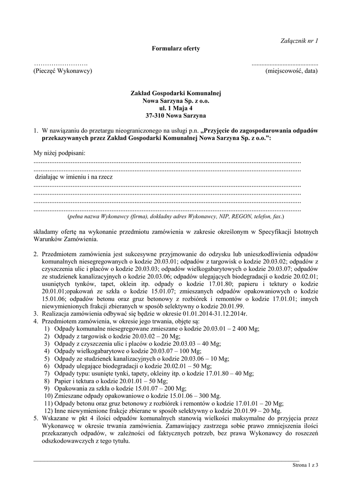 Załącznik nr 1 Formularz oferty ……………………. (Pieczęć Wykonawcy) ......................................... (miejscowość, data) Zakład Gospodarki Komunalnej Nowa Sarzyna Sp. z o.o. ul. 1 Maja 4 37-310 Nowa Sarzyna 1. W nawiązaniu do przetargu nieograniczonego na usługi p.n. „Przyjęcie do zagospodarowania odpadów przekazywanych przez Zakład Gospodarki Komunalnej Nowa Sarzyna Sp. z o.o.”: My niżej podpisani: ....................................................................................................................................................... ....................................................................................................................................................... działając w imieniu i na rzecz ....................................................................................................................................................... ....................................................................................................................................................... ....................................................................................................................................................... ....................................................................................................................................................... (pełna nazwa Wykonawcy (firma), dokładny adres Wykonawcy, NIP, REGON, telefon, fax.) składamy ofertę na wykonanie przedmiotu zamówienia w zakresie określonym w Specyfikacji Istotnych Warunków Zamówienia. 2. Przedmiotem zamówienia jest sukcesywne przyjmowanie do odzysku lub unieszkodliwienia odpadów komunalnych niesegregowanych o kodzie 20.03.01; odpadów z targowisk o kodzie 20.03.02; odpadów z czyszczenia ulic i placów o kodzie 20.03.03; odpadów wielkogabarytowych o kodzie 20.03.07; odpadów ze studzienek kanalizacyjnych o kodzie 20.03.06; odpadów ulegających biodegradacji o kodzie 20.02.01; usuniętych tynków, tapet, oklein itp. odpady o kodzie 17.01.80; papieru i tektury o kodzie 20.01.01;opakowań ze szkła o kodzie 15.01.07; zmieszanych odpadów opakowaniowych o kodzie 15.01.06; odpadów betonu oraz gruz betonowy z rozbiórek i remontów o kodzie 17.01.01; innych niewymienionych frakcji zbieranych w sposób selektywny o kodzie 20.01.99. 3. Realizacja zamówienia odbywać się będzie w okresie 01.01.2014-31.12.2014r. 4. Przedmiotem zamówienia, w okresie jego trwania, objęte są: 1) Odpady komunalne niesegregowane zmieszane o kodzie 20.03.01 – 2 400 Mg; 2) Odpady z targowisk o kodzie 20.03.02 – 20 Mg; 3) Odpady z czyszczenia ulic i placów o kodzie 20.03.03 – 40 Mg; 4) Odpady wielkogabarytowe o kodzie 20.03.07 – 100 Mg; 5) Odpady ze studzienek kanalizacyjnych o kodzie 20.03.06 – 10 Mg; 6) Odpady ulegające biodegradacji o kodzie 20.02.01 – 50 Mg; 7) Odpady typu: usunięte tynki, tapety, okleiny itp. o kodzie 17.01.80 – 40 Mg; 8) Papier i tektura o kodzie 20.01.01 – 50 Mg; 9) Opakowania za szkła o kodzie 15.01.07 – 200 Mg; 10) Zmieszane odpady opakowaniowe o kodzie 15.01.06 – 300 Mg. 11) Odpady betonu oraz gruz betonowy z rozbiórek i remontów o kodzie 17.01.01 – 20 Mg; 12) Inne niewymienione frakcje zbierane w sposób selektywny o kodzie 20.01.99 – 20 Mg. 5. Wskazane w pkt 4 ilości odpadów komunalnych stanowią wielkości maksymalne do przyjęcia przez Wykonawcę w okresie trwania zamówienia. Zamawiający zastrzega sobie prawo zmniejszenia ilości przekazanych odpadów, w zależności od faktycznych potrzeb, bez prawa Wykonawcy do roszczeń odszkodowawczych z tego tytułu. ___________________________________________________________________________ Strona 1 z 3 6. Załadunek przedmiotu zamówienia oraz transport do punktu przyjęcia odbywać się będzie przy pomocy środków i na koszt Zamawiającego. Transport do miejsca przyjęcia odpadów jest dogodny dla pojazdu ciężarowego. 7. Wykonawca zobowiązuje się przyjmować odpady od poniedziałku do piątku, za wyjątkiem dni ustawowo wolnych od pracy, w godzinach od 8.00 do 15.00. 8. Dostawa odpadów dokumentowana będzie przez Wykonawcę. Każdy wjazd będzie zarejestrowany i potwierdzony dokumentem zawierającym datę przywozu, rodzaj, kod i wagę odpadów, nr rejestracyjny pojazdu i dane identyfikacyjne przewoźnika. W/w dokument otrzymuje kierowca Zamawiającego podczas dostawy każdej partii odpadów. 9. Przyjmowane odpady będą każdorazowo ważone na legalizowanej wadze przy udziale pracownika Zamawiającego. Ważenie musi być potwierdzone wystawieniem kwitu wagowego, podpisanego przez obie strony. 10. Wykaz pojazdów (marka, nr rejestracyjny) oraz osób (imię i nazwisko, dokument tożsamości) upoważnionych do przekazywania odpadów w ramach realizacji przedmiotowego zamówienia Zamawiający przedstawi wybranemu Wykonawcy w terminie 5 dni roboczych od daty udzielenia zamówienia (zawarcia umowy). 11. Karta Przekazania Odpadu, z danego miesiąca zawierająca dane poszczególnych dostaw, dołączona do faktury, będzie stanowiła podstawę do obciążenia Zamawiającego. 12. Oświadczamy, że wyrażamy zgodę na zapłatę faktur w terminie 21 dni od daty ich wpływu do siedziby Zamawiającego. 13. Oświadczamy, że uważamy się związani ofertą, co najmniej 30 dni licząc od ostatecznego terminu składania ofert. 14. Oświadczamy, że zapoznaliśmy się z SIWZ oraz załącznikami do niej i akceptujemy je bez zastrzeżeń oraz zobowiązujemy się do zawarcia umowy na warunkach określonych w projekcie umowy (załącznik nr 6 do SIWZ). 15. Oferujemy wykonanie usług objętych przedmiotem zamówienia za cenę: Stawka podatku VAT [%] Kwota podatki VAT [zł] Cena jednostkowa brutto [zł/Mg] Zakładana ilość odpadów do przyjęcia [Mg] Wartość netto [zł] Wartość podatku VAT [zł] Wartość brutto D E=CxD F=C+E G H=CxG I=ExG J = H+I Lp Kod odpadu Cena jednostkowa netto [zł/Mg] A B C 1 20.03.01 2 400 2 20.03.02. 20 3 