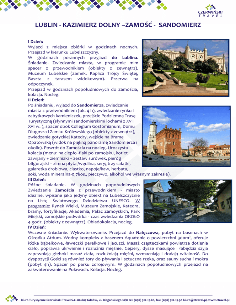 LUBLIN - KAZIMIERZ DOLNY –ZAMOŚĆ - SANDOMIERZ I Dzień: Wyjazd z miejsca zbiórki w godzinach nocnych. Przejazd w kierunku Lubelszczyzny. W godzinach porannych przyjazd do Lublina. Śniadanie. Zwiedzanie miasta, w programie min: spacer z przewodnikiem (obiekty z zewnątrz), Muzeum Lubelskie (Zamek, Kaplica Trójcy Świętej, Baszta z tarasem widokowym). Przerwa na odpoczynek. Przejazd w godzinach popołudniowych do Zamościa, kolacja. Nocleg. II Dzień: Po śniadaniu, wyjazd do Sandomierza, zwiedzanie miasta z przewodnikiem (ok. 4 h), zwiedzanie rynku i zabytkowych kamieniczek, przejście Podziemną Trasą Turystyczną (słynnymi sandomierskimi lochami z XV i XVI w. ), spacer obok Collegium Gostomianum, Domu Długosza i Zamku Królewskiego (obiekty z zewnątrz), zwiedzanie gotyckiej Katedry, wejście na Bramę Opatowską (widok na piękną panoramę Sandomierza i okolic). Powrót do Zamościa na nocleg. Uroczysta kolacja (menu: na ciepło -flaki po zamojsku, kotlet zawijany + ziemniaki + zestaw surówek, pieróg biłgorajski + zimna płyta /wędlina, sery/,trzy sałatki, galaretka drobiowa, ciastko, napoje/kaw, herbata, soki, woda mineralna-0,7l/os., pieczywo, alkohol we własnym zakresie). III Dzień: Późne śniadanie. W godzinach popołudniowych Zwiedzanie Zamościa z przewodnikiem - miasto idealne, wpisane jako jedyny obiekt na Lubelszczyźnie na Listę Światowego Dziedzictwa UNESCO. W programie: Rynek Wielki, Muzeum Zamojskie, Katedra, bramy, fortyfikacje, Akademia, Pałac Zamoyskich, Park Miejski, zamojskie podwórka - czas zwiedzania OKOŁO 4 godz. (obiekty z zewnątrz). Obiadokolacja, nocleg. IV Dzień: Wczesne śniadanie. Wykwaterowanie. Przejazd do Nałęczowa, pobyt na basenach w Ośrodku Atrium. Wodny kompleks z basenem Aquatonic o powierzchni 300m2, oferuje łóżka bąbelkowe, ławeczki perełkowe i jacuzzi. Masaż cząsteczkami powietrza dotlenia ciało, poprawia ukrwienie i rozluźnia mięśnie. Gejzery, dysze masujące i łabędzia szyja zapewniają głęboki masaż ciała, rozluźniają mięśni, wzmacniają i dodają witalność. Do dyspozycji Gości są również tory do pływania i sztuczna rzeka, oraz sauny sucha i mokra (pobyt 4h). Spacer po parku zdrojowym. W godzinach popołudniowych przejazd na zakwaterowanie na Puławach. Kolacja. Nocleg. LUBLIN - KAZIMIERZ DOLNY –ZAMOŚĆ - SANDOMIERZ V Dzień: Wykwaterowanie po śniadaniu, przejazd do Kazimierza Dolnego, zwiedzanie miasta z przewodnikiem (miasteczka powstałego w XIII wieku): Rynek, Fara, Zamek i Baszta, Góra Trzech Krzyży, ul. Lubelska, kościół i klasztor OO Reformatów, ul. Senatorska. Obiad. Powrót w godzinach popołudniowych. Zakończenie wycieczki w godzinach nocnych. Cena od 819 zł/os. – cena uzależniona od liczby uczestników, terminu realizacji itp. Cena zawiera: Przejazd autokarem na w/w trasie Zakwaterowanie: 3 x noclegi w Zamościu w Hotelu 2*. Pokoje: 2, 3 os.; 1 x nocleg w okolicach Nałęczowa Wyżywienie: 5 x śniadanie, 3 x obiadokolację, 1 x uroczysta kolacja 1 x obiad (w drodze powrotnej) Opiekę pilota podczas trwania całej wycieczki Ubezpieczenie NNW na czas trwania wycieczki Podatek VAT Cena nie zawiera: • Biletów wstępu do zwiedzanych obiektów oraz usługi przewodników wg programu, na bilety wstępu należy dodatkowo przeznaczyć – ok. 97 zł/os. – obowiązkowo Kolejność zwiedzanych obiektów może ulec zmianie. Podany program jest programem ramowym. Jesteśmy elastyczni pod kątem cenowym jak i programowym. Program nie stanowi oferty handlowej ze względu na brak dokładnego terminu.