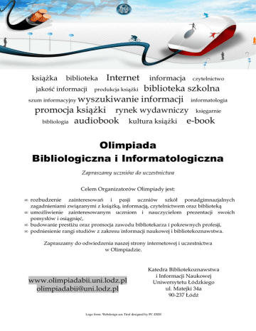 książka biblioteka Internet informacja czytelnictwo biblioteka szkolna szum informacyjny wyszukiwanie informacji informatologia promocja książki rynek wydawniczy księgarnie kultura książki e-book bibliologia audiobook jakość informacji produkcja książki Olimpiada Bibliologiczna i Informatologiczna Zapraszamy uczniów do uczestnictwa Celem Organizatorów Olimpiady jest: • rozbudzenie zainteresowań i pasji uczniów szkół ponadgimnazjalnych zagadnieniami związanymi z książką, informacją, czytelnictwem oraz biblioteką • umożliwienie zainteresowanym uczniom i nauczycielom prezentacji swoich pomysłów i osiągnięć, • budowanie prestiżu oraz promocja zawodu bibliotekarza i pokrewnych profesji, • podniesienie rangi studiów z zakresu informacji naukowej i bibliotekoznawstwa. Zapraszamy do odwiedzenia naszej strony internetowej i uczestnictwa w Olimpiadzie. www.olimpiadabii.uni.lodz.pl [email protected] Katedra Bibliotekoznawstwa i Informacji Naukowej Uniwersytetu Łódzkiego ul. Matejki 34a 90-237 Łódź Logo from: Webdesign aus Tirol designed by PC-DIDI
