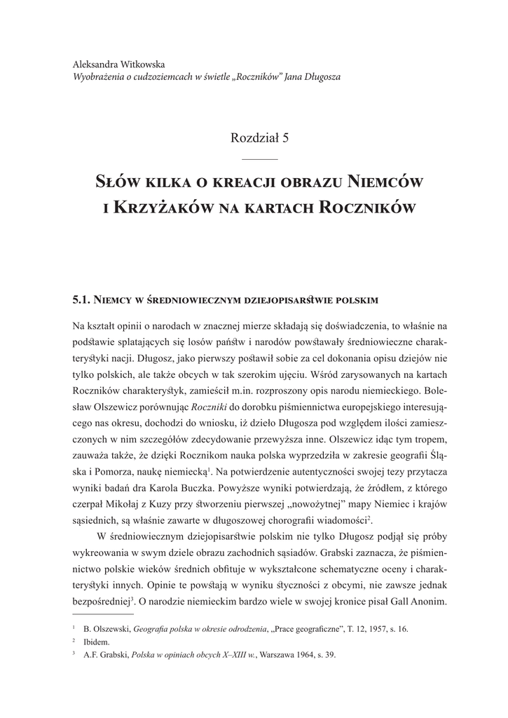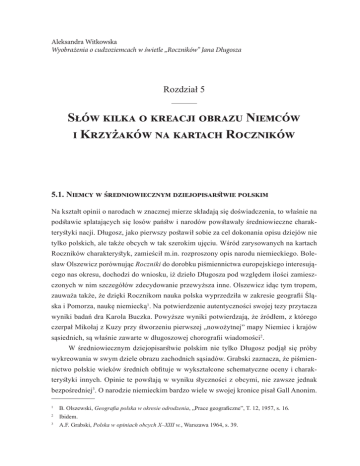 Aleksandra Witkowska Wyobrażenia o cudzoziemcach w świetle „Roczników” Jana Długosza Rozdział 5 Słów kilka o kreacji obrazu Niemców i Krzyżaków na kartach Roczników 5.1. Niemcy w średniowiecznym dziejopisarstwie polskim Na kształt opinii o narodach w znacznej mierze składają się doświadczenia, to właśnie na podstawie splatających się losów państw i narodów powstawały średniowieczne charakterystyki nacji. Długosz, jako pierwszy postawił sobie za cel dokonania opisu dziejów nie tylko polskich, ale także obcych w tak szerokim ujęciu. Wśród zarysowanych na kartach Roczników charakterystyk, zamieścił m.in. rozproszony opis narodu niemieckiego. Bolesław Olszewicz porównując Roczniki do dorobku piśmiennictwa europejskiego interesującego nas okresu, dochodzi do wniosku, iż dzieło Długosza pod względem ilości zamieszczonych w nim szczegółów zdecydowanie przewyższa inne. Olszewicz idąc tym tropem, zauważa także, że dzięki Rocznikom nauka polska wyprzedziła w zakresie geografii Śląska i Pomorza, naukę niemiecką1. Na potwierdzenie autentyczności swojej tezy przytacza wyniki badań dra Karola Buczka. Powyższe wyniki potwierdzają, że źródłem, z którego czerpał Mikołaj z Kuzy przy stworzeniu pierwszej „nowożytnej” mapy Niemiec i krajów sąsiednich, są właśnie zawarte w długoszowej chorografii wiadomości2. W średniowiecznym dziejopisarstwie polskim nie tylko Długosz podjął się próby wykreowania w swym dziele obrazu zachodnich sąsiadów. Grabski zaznacza, że piśmiennictwo polskie wieków średnich obfituje w wykształcone schematyczne oceny i charakterystyki innych. Opinie te powstają w wyniku styczności z obcymi, nie zawsze jednak bezpośredniej3. O narodzie niemieckim bardzo wiele w swojej kronice pisał Gall Anonim. B. Olszewski, Geografia polska w okresie odrodzenia, „Prace geograficzne”, T. 12, 1957, s. 16. Ibidem. 3 A.F. Grabski, Polska w opiniach obcych X–XIII w., Warszawa 1964, s. 39. 1 2 Aleksandra Witkowska Krytykował on politykę Niemiec wobec Polski, jednakże niewyczuwalna jest szczególna niechęć kronikarza wobec sąsiadów zza zachodniej granicy4. Tematykę tę podjął także Wincenty Kadłubek. Kronikarz dopatrywał się upadku moralnego Niemców, relacjonując wydarzenia przemycał swój wyraźnie negatywny stosunek do Niemców. Dostrzegał w nich źródło zagrożenia, zarówno wewnętrznego jak i zewnętrznego dla Polski5. Stąd najprawdopodobniej tak pejoratywne sądy dotyczące Niemców. Negatywne nacechowanie opisów Niemców wzrastało wraz z zaogniającą się sytuacją polsko-niemiecką. Wzrost świadomości na temat zagrożenia ze strony Niemiec, nie pozostał bez wpływu na kształt kreowanych charakterystyk w polskim piśmiennictwie. Problem wzajemnych polsko-niemieckich opinii budzi zainteresowanie badaczy. W literaturze znaleźć możemy wiele pozycji traktujących o stosunkach polsko-niemieckich w średniowieczu. Kwestie ocen zachodnich sąsiadów poruszał między innymi Jerzy Kłoczkowski6, Benedykt Zientara7, Andrzej Feliks Grabski8 i Teodor Tyc9. O problemie kształtowania się wizerunku Niemca w średniowiecznej mentalności społecznej pisała także Jadwiga Krzyżaniakowa10 (która podjęła się również analizy Annales pod kątem zawartych w nich informacji o Niemcach11) oraz Maria Koczerska12. W tym miejscu na wskazanie zasługuje także artykuł Sławomira Gawlasa, gdzie autor skupia się na analizie poczucia narodowego Jana Długosza oraz przedstawia w dość ogólnym zarysie stosunek dziejopisa do Niemców13. Jak widać tematyka wzajemnych stosunków polsko niemieckich jest popularna, doczekała się licznych opracowań. Warto zaznaczyć, że przytoczone przeze mnie powyżej pozycje stanowią jedynie przykłady opracowań traktujących o opiniach i sądach. Jednakże mimo tak bogatego zasobu publikacji oscylujących wokół interesującego nas zagadnienia, kwestia opinii o Niemcach w Rocznikach wymaga skrupulatniejszej analizy. Dlatego też w tej części pracy postaram się, abstrahując od błędów i zniekształceń zarzucanych Długoszowi w relacjonowaniu dziejów, dokonać zsyntetyzowanego obrazu Ibidem, s. 41–41. Ibidem, s. 57–59. 6 J. Kłoczowski, Polacy a cudzoziemcy w XV wieku, [w:] Swojskość i cudzoziemszczyzna w dziejach kultury polskiej, red. Zofia Stefanowska, Warszawa 1974. 7 B. Zientara, Cudzoziemcy w Polsce X–XV wieku: ich rola w zwierciadle polskiej opinii średniowiecznej, [w:] Swojskość i cudzoziemszczyzna w dziejach kultury polskiej, red. Zofia Stefanowska, Warszawa 1974. 8 A. F. Grabski, op.cit. 9 T. Tyc, Niemcy w świetle poglądów Polski piastowskiej, „Strażnica Zachodnia”, R. IV, nr 7–12, 1925. 10 J. Krzyżaniakowa, Regnum Poloniae w XIV wieku. Perspektywy badań, [w:] Sztuka i ideologia XIV wieku, Warszawa 1975. 4 5 J. Krzyżaniakowa, Niemcy w opinii Jana Długosza, [w:] eadem, Nie ma historii bez człowieka; studia z dziejów średniowiecza, Poznań 2011. 12 M. Koczerska, Mentalność Jana Długosza w świetle jego twórczości, „Studia Źródłoznawcze”, T. 15, 1971. 13 S. Gawlas, Świadomość narodowa Jana Długosza, „Studia Źródłoznawcze”, T. 27, 1983. 11 Wyobrażenia o cudzoziemcach w świetle „Roczników” Jana Długosza Niemców na podstawie dość swobodnie zamieszczanych informacji na kartach Annales. Ponadto pragnę zwrócić uwagę na fakt, jakie czynniki mogły determinować stosunek dziejopisa do zachodnich sąsiadów oraz, jak Niemcy przedstawiały się na tle innych narodowości w oczach Długosza. 5.2. Obraz Niemca w Annales W polskiej historiografii ugruntował się pogląd, dotyczący kształtowania się świadomości narodowej Polaków w atmosferze antagonizmów z Niemcami oraz wszechobecnego poczucia zagrożenia ze strony niemieckiej14. Jak wskazuje Krzyżaniakowa, na szczęście ten punkt widzenia jest ostatnimi czasy modyfikowany15. Przeglądając przeddługoszowe kroniki, stan
