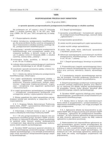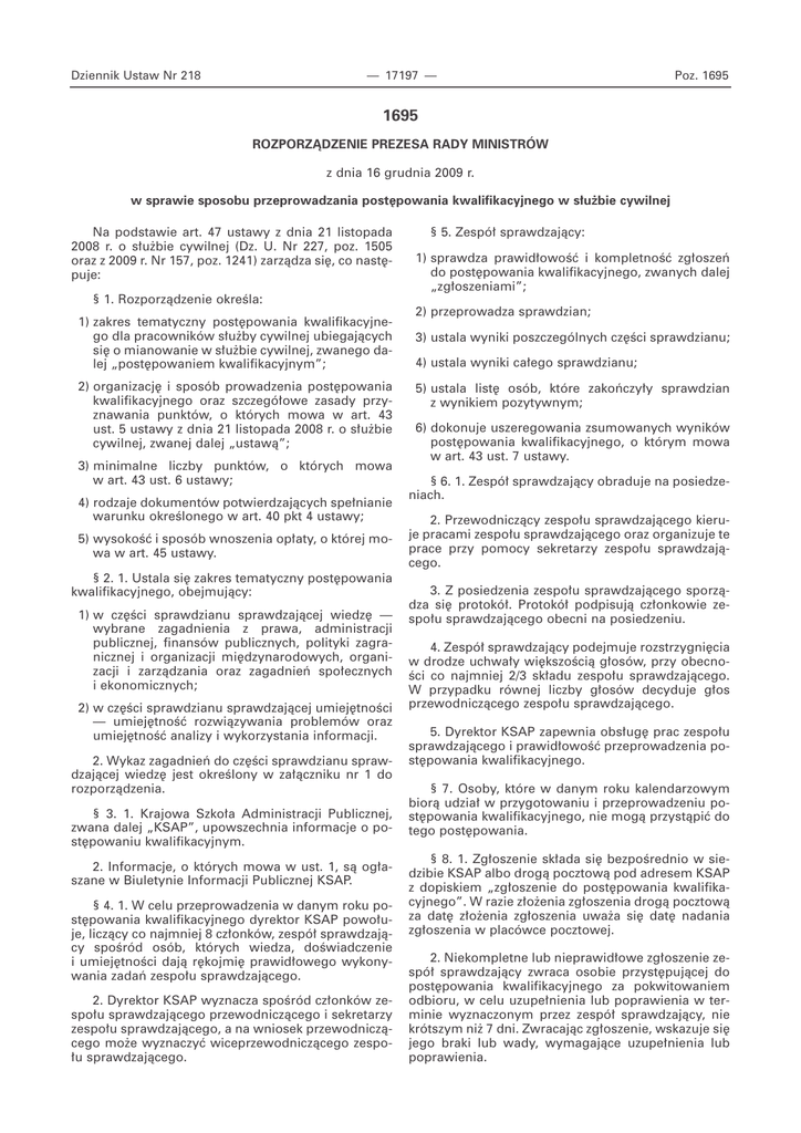Dziennik Ustaw Nr 218 — 17197 — Poz. 1695 1695 ROZPORZÑDZENIE PREZESA RADY MINISTRÓW z dnia 16 grudnia 2009 r. w sprawie sposobu przeprowadzania post´powania kwalifikacyjnego w s∏u˝bie cywilnej Na podstawie art. 47 ustawy z dnia 21 listopada 2008 r. o s∏u˝bie cywilnej (Dz. U. Nr 227, poz. 1505 oraz z 2009 r. Nr 157, poz. 1241) zarzàdza si´, co nast´puje: § 5. Zespó∏ sprawdzajàcy: 1) sprawdza prawid∏owoÊç i kompletnoÊç zg∏oszeƒ do post´powania kwalifikacyjnego, zwanych dalej „zg∏oszeniami”; § 1. Rozporzàdzenie okreÊla: 1) zakres tematyczny post´powania kwalifikacyjnego dla pracowników s∏u˝by cywilnej ubiegajàcych si´ o mianowanie w s∏u˝bie cywilnej, zwanego dalej „post´powaniem kwalifikacyjnym”; 2) organizacj´ i sposób prowadzenia post´powania kwalifikacyjnego oraz szczegó∏owe zasady przyznawania punktów, o których mowa w art. 43 ust. 5 ustawy z dnia 21 listopada 2008 r. o s∏u˝bie cywilnej, zwanej dalej „ustawà”; 3) minimalne liczby punktów, o których mowa w art. 43 ust. 6 ustawy; 4) rodzaje dokumentów potwierdzajàcych spe∏nianie warunku okreÊlonego w art. 40 pkt 4 ustawy; 5) wysokoÊç i sposób wnoszenia op∏aty, o której mowa w art. 45 ustawy. § 2. 1. Ustala si´ zakres tematyczny post´powania kwalifikacyjnego, obejmujàcy: 1) w cz´Êci sprawdzianu sprawdzajàcej wiedz´ — wybrane zagadnienia z prawa, administracji publicznej, finansów publicznych, polityki zagranicznej i organizacji mi´dzynarodowych, organizacji i zarzàdzania oraz zagadnieƒ spo∏ecznych i ekonomicznych; 2) w cz´Êci sprawdzianu sprawdzajàcej umiej´tnoÊci — umiej´tnoÊç rozwiàzywania problemów oraz umiej´tnoÊç analizy i wykorzystania informacji. 2. Wykaz zagadnieƒ do cz´Êci sprawdzianu sprawdzajàcej wiedz´ jest okreÊlony w za∏àczniku nr 1 do rozporzàdzenia. § 3. 1. Krajowa Szko∏a Administracji Publicznej, zwana dalej „KSAP”, upowszechnia informacje o post´powaniu kwalifikacyjnym. 2. Informacje, o których mowa w ust. 1, sà og∏aszane w Biuletynie Informacji Publicznej KSAP. § 4. 1. W celu przeprowadzenia w danym roku post´powania kwalifikacyjnego dyrektor KSAP powo∏uje, liczàcy co najmniej 8 cz∏onków, zespó∏ sprawdzajàcy spoÊród osób, których wiedza, doÊwiadczenie i umiej´tnoÊci dajà r´kojmi´ prawid∏owego wykonywania zadaƒ zespo∏u sprawdzajàcego. 2. Dyrektor KSAP wyznacza spoÊród cz∏onków zespo∏u sprawdzajàcego przewodniczàcego i sekretarzy zespo∏u sprawdzajàcego, a na wniosek przewodniczàcego mo˝e wyznaczyç wiceprzewodniczàcego zespo∏u sprawdzajàcego. 2) przeprowadza sprawdzian; 3) ustala wyniki poszczególnych cz´Êci sprawdzianu; 4) ustala wyniki ca∏ego sprawdzianu; 5) ustala list´ osób, które zakoƒczy∏y sprawdzian z wynikiem pozytywnym; 6) dokonuje uszeregowania zsumowanych wyników post´powania kwalifikacyjnego, o którym mowa w art. 43 ust. 7 ustawy. § 6. 1. Zespó∏ sprawdzajàcy obraduje na posiedzeniach. 2. Przewodniczàcy zespo∏u sprawdzajàcego kieruje pracami zespo∏u sprawdzajàcego oraz organizuje te prace przy pomocy sekretarzy zespo∏u sprawdzajàcego. 3. Z posiedzenia zespo∏u sprawdzajàcego sporzàdza si´ protokó∏. Protokó∏ podpisujà cz∏onkowie zespo∏u sprawdzajàcego obecni na posiedzeniu. 4. Zespó∏ sprawdzajàcy podejmuje rozstrzygni´cia w drodze uchwa∏y wi´kszoÊcià g∏osów, przy obecnoÊci co najmniej 2/3 sk∏adu zespo∏u sprawdzajàcego. W przypadku równej liczby g∏osów decyduje g∏os przewodniczàcego zespo∏u sprawdzajàcego. 5. Dyrektor KSAP zapewnia obs∏ug´ prac zespo∏u sprawdzajàcego i prawid∏owoÊç przeprowadzenia post´powania kwalifikacyjnego. § 7. Osoby, które w danym roku kalendarzowym biorà udzia∏ w przygotowaniu i przeprowadzeniu post´powania kwalifikacyjnego, nie mogà przystàpiç do tego post´powania. § 8. 1. Zg∏oszenie sk∏ada si´ bezpoÊrednio w siedzibie KSAP albo drogà pocztowà pod adresem KSAP z dopiskiem „zg∏oszenie do post´powania kwalifikacyjnego”. W razie z∏o˝enia zg∏oszenia drogà pocztowà za dat´ z∏o˝enia zg∏oszenia uwa˝a si´ dat´ nadania zg∏oszenia w placówce pocztowej. 2. Niekompletne lub nieprawid∏owe zg∏oszenie zespó∏ sprawdzajàcy zwraca osobie przyst´pujàcej do post´powania kwalifikacyjnego za pokwitowaniem odbioru, w celu uzupe∏nienia lub poprawienia w terminie wyznaczonym przez zespó∏ sprawdzajàcy, nie krótszym ni˝ 7 dni. Zwracajàc zg∏oszenie, wskazuje si´ jego braki lub wady, wymagajàce uzupe∏nienia lub poprawienia. Dziennik Ustaw Nr 218 — 17198 — 3. Termin wyznaczony na podstawie ust. 2 uwa˝a si´ za zachowany, je˝eli przed jego up∏ywem uzupe∏nione lub poprawione zg∏oszenie zosta∏o z∏o˝one bezpoÊrednio w siedzibie KSAP albo nadane w placówce pocztowej. 4. Je˝eli osoba przyst´pujàca do post´powania kwalifikacyjnego nie dokona uzupe∏nienia lub poprawienia zg∏oszenia w wyznaczonym terminie albo uzupe∏nione lub poprawione zg∏oszenie nie potwierdzi spe∏nienia przez t´ osob´ warunków przystàpienia do post´powania kwalifikacyjnego, zespó∏ sprawdzajàcy zawiadamia o tym t´ osob´, za pokwitowaniem odbioru. § 9. 1. Termin i miejsce przeprowadzenia sprawdzianu ustala dyrektor KSAP w porozumieniu z Szefem S∏u˝by Cywilnej, co najmniej na 30 dni przed sprawdzianem. 2. Informacj´ o terminie i miejscu przeprowadzenia sprawdzianu dyrektor KSAP niezw∏ocznie og∏asza w Biuletynie Informacji Publicznej KSAP. Informacj´ og∏asza si´ równie˝ w Biuletynie Informacji Publicznej Kancelarii Prezesa Rady Ministrów. § 10. 1. Sprawdzian ma form´ pisemnà i sk∏ada si´ z odr´bnych cz´Êci, podczas których sà sprawdzane wiedza i umiej´tnoÊci. 2. Dyrektor KSAP odpowiada za przygotowanie materia∏ów s∏u˝àcych przeprowadzeniu sprawdzianu w sposób gwarantujàcy zapewnienie ich poufnoÊci. 3. Dyrektor KSAP przekazuje przewodniczàcemu zes