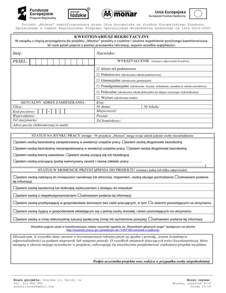 Projekt „Możesz” współfinansowany przez Unię Europejską ze środków Europejskiego Funduszu Społecznego w ramach Regionalnego Programu Operacyjnego Województwa Łódzkiego na lata 2014-2020 KWESTIONARIUSZ REKRUTACYJNY W związku z chęcią przystąpienia do projektu „Możesz” prosimy o czytelne i uważne wypełnienie poniższego kwestionariusza. W razie pytań poproś o pomoc pracownika rekrutacji, wyjaśni wszelkie wątpliwości. Imię: Nazwisko: WYKSZTAŁCENIE (zaznacz odpowiedni kwadrat): PESEL: □ niższe niż podstawowe □ Podstawowe (ukończona szkoła podstawowa) □ Gimnazjalne (ukończone gimnazjum) □ Ponadgimnazjalne (ukończone liceum, technikum, zasadnicza szkoła zawodowa) □ Policealne (ukończona szkoła policealna nie dająca wyższego wykształcenia) □ Wyższe (ukończone studia) AKTUALNY ADRES ZAMIESZKANIA Ulica: Kod pocztowy: │ │ │-│ │ │ │ Województwo: Tel stacjonarny: Adres poczty elektronicznej (e-mail): Kraj: Nr domu: Miejscowość: Powiat: Tel komórkowy: Nr lokalu: STATUS NA RYNKU PRACY uwaga - W projekcie „Możesz” mogą wziąć udział jedynie osoby niezatrudnione □jestem osobą bezrobotną zarejestrowaną w ewidencji urzędów pracy □jestem osobą długotrwale bezrobotną □jestem osobą bezrobotną niezarejestrowaną w ewidencji urzędów pracy □jestem osobą długotrwale bezrobotną □jestem osobą bierną zawodowo □jestem osobą uczącą się lub kształcącą □jestem osobą pracującą (podaj wykonywany zawód i nazwę zakładu pracy …………………………………………………….… …………………………………………………………………………………………………………………………………………………….) STATUS W MOMENCIE PRZYSTĄPIENIA DO PROJEKTU (zaznacz jedną lub kilka odpowiedzi) □jestem osobą należącą do mniejszości narodowej lub etnicznej, migrantem, osobą obcego pochodzenia □odmawiam podania tej informacji □jestem osobą bezdomną lub dotkniętą wykluczeniem z dostępu do mieszkań □jestem osobą z niepełnosprawnościami □odmawiam podania tej informacji □jestem osobą przebywającą w gospodarstwie domowym bez osób pracujących, w tym □z dziećmi pozostającymi na utrzymaniu □jestem osobą żyjącą w gospodarstwie składającym się z jednej osoby dorosłej i dzieci pozostających na utrzymaniu □jestem osobą w innej niekorzystnej sytuacji społecznej (innej niż wymienione powyżej) □odmawiam podania tej informacji Wszelkie pojęcia użyte w kwestionariuszu należy rozumieć zgodnie ze „Słownikiem głównych pojęć” dostępnym na stronie http://wuplodz.praca.gov.pl/web/rpo-wl/-/1457182-wniosek-o-platnosc Oświadczam, iż wszystkie dane zawarte w kwestionariuszu rekrutacyjnym są zgodne z prawdą, jestem świadomy/a odpowiedzialności za podanie nieprawdy lub zatajenie prawdy. O wszelkich zmianach dotyczących treści kwestionariusza, które nastąpią w okresie mojego uczestnictw w projekcie, zobowiązuję się niezwłocznie poinformować realizatora projektu na piśmie. …………………………………………………………………………….……………. Podpis uczestnika projektu oraz rodzica w przypadku osoby niepełnoletniej. Biuro projektu: Ozorków ul. Żwirki 1a Tel. 511 865 862 [email protected] Biuro czynne: Wtorek, czwartek 9-14 Środa 14-19