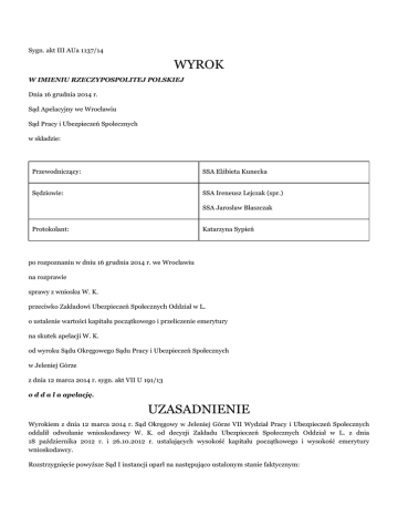 Sygn. akt III AUa 1137/14 WYROK W IMIENIU RZECZYPOSPOLITEJ POLSKIEJ Dnia 16 grudnia 2014 r. Sąd Apelacyjny we Wrocławiu Sąd Pracy i Ubezpieczeń Społecznych w składzie: Przewodniczący: SSA Elżbieta Kunecka Sędziowie: SSA Ireneusz Lejczak (spr.) SSA Jarosław Błaszczak Protokolant: Katarzyna Sypień po rozpoznaniu w dniu 16 grudnia 2014 r. we Wrocławiu na rozprawie sprawy z wniosku W. K. przeciwko Zakładowi Ubezpieczeń Społecznych Oddział w L. o ustalenie wartości kapitału początkowego i przeliczenie emerytury na skutek apelacji W. K. od wyroku Sądu Okręgowego Sądu Pracy i Ubezpieczeń Społecznych w Jeleniej Górze z dnia 12 marca 2014 r. sygn. akt VII U 191/13 o d d a l a apelację. UZASADNIENIE Wyrokiem z dnia 12 marca 2014 r. Sąd Okręgowy w Jeleniej Górze VII Wydział Pracy i Ubezpieczeń Społecznych oddalił odwołanie wnioskodawcy W. K. od decyzji Zakładu Ubezpieczeń Społecznych Oddział w L. z dnia 18 października 2012 r. i 26.10.2012 r. ustalających wysokość kapitału początkowego i wysokość emerytury wnioskodawcy. Rozstrzygnięcie powyższe Sąd I instancji oparł na następująco ustalonym stanie faktycznym: Decyzją z dnia 7 kwietnia 1999 r. przyznano wnioskodawcy prawo do renty z tytułu częściowej niezdolności do pracy. Wnioskodawca miał prawo do renty, najpierw z tytułu częściowej, a następnie z tytułu całkowitej niezdolności do pracy do dnia 31 lipca 2012 r. Decyzją z dnia 12 września 2012 r. przyznano wnioskodawcy zaliczkę na poczet emerytury przysługującej od dnia 27 lipca 2012 r. tj. od osiągnięcia wieku emerytalnego. Następnie decyzją z dnia 26 października 2012 r. ustalono wysokość emerytury na kwotę 2.119,95 zł. Do ustalenia wysokości emerytury Zakład uwzględnił 36 lat, miesiąc i 14 dni okresów składkowych oraz rok, 10 miesięcy i 24 dni okresów nieskładkowych. Nie uwzględnił okresów: od 15 czerwca 1972 r. do 19 czerwca 1972 r. z uwagi na nieopłacenie składki na ubezpieczenia społeczne oraz od 17 sierpnia 1974 r. do 22 sierpnia 1974 r., od 3 listopada 1989 r. do 4 listopada 1989 r. oraz 22 września 1989 r. jako okresy urlopów bezpłatnych. Świadczenie zostało wyliczone na podstawie art. 183 ustawy z dnia 17 grudnia 1998 r. o emeryturach i rentach z Funduszu Ubezpieczeń Społecznych (tj. Dz. U. z 2009 r., nr 153, poz. 1227 ze zm.) na kwotę 2119,95 zł. Kapitał początkowy wnioskodawcy został ustalony decyzją z dnia 18 października 2012 r. na kwotę 154363,22 zł. Do ustalenia kapitału początkowego Zakład nie uwzględnił okresu od 15 czerwca 1972 r. do 19 czerwca 1972 r., ponieważ za ten okres nie została opłacona składka na ubezpieczenie społeczne. Nie uwzględniono okresów przebywania przez wnioskodawcę na urlopach bezpłatnych: od 18 sierpnia 1974 r. do 22 sierpnia 1974 r., od 22 września 1989 r. do 22 września 1989 r. i od 3 listopada 1989 r. do 4 listopada 1989 r. Ponadto nie uwzględniono okresu od 1 września 1998 r. do 31 grudnia 1998 r., ponieważ zasiłek chorobowy po ustaniu zatrudnienia nie został wypłacony. W związku z przejściem wnioskodawcy na emeryturę, decyzją z dnia 18 października 2012 r. przeliczono kapitał początkowy wnioskodawcy, ustalając jego wysokość po uwzględnieniu dodanego okresu składkowego, na kwotę 172523,23 zł. Zakład Ubezpieczeń Społecznych nie wypłacił wnioskodawcy zasiłku chorobowego za okres od 1 września 1998 r. do 8 stycznia 1999 r. Do ustalenia wysokości emerytury Zakład Ubezpieczeń Społecznych uwzględnił wynagrodzenie m.in. z lat 1980 – 1989. Do wyliczenia wskaźnika wysokości podstawy wymiaru przyjęto 20 lat kalendarzowych, wybranych z całego okresu zatrudnienia. Sąd I instancji, opierając się na ustalonym w sprawie stanie faktycznym uznał, że odwołanie wnioskodawcy jest niezasadne. Wnioskodawca ostatecznie kwestionował nie uwzględnienie do okresów ubezpieczenia okresu zasiłkowego od 1 września 1998 r. do 31 grudnia 1998 r. Ponadto domagał się wyliczenie wysokości emerytury z 10 kolejnych lat od 1980 r. do 1989 r. W zakresie nie uwzględnienia okresu zasiłkowego od 1 września 1998 r. do 31 grudnia 1998 r. Sąd Okręgowy zważył, że decyzją z dnia 7 kwietnia 1999 r. przyznano wnioskodawcy prawo do renty z tytułu częściowej niezdolności do pracy, od dnia 1 czerwca 1998 r. świadczenie przyznano na podstawie wyroku Sądu Okręgowego we Wrocławiu z dnia 29 stycznia 1999 r., sygn. akt VIIIU 4515/98. Wyrok wpłynął do ZUS w dniu 22 marca 1999 r. Okoliczności powyższe wskazują, że w okresie od 1 września 1998 r. do 31 grudnia 1998 r. wnioskodawca miał przyznane prawo do renty z tytułu niezdolności do pracy mimo, że faktycznie świadczenie zostało mu przyznane dopiero wyżej powołanym wyrokiem Sądu Okresowego we Wrocławiu. Zgodnie z treścią art. 13 ust. 1 pkt. 1 ustawy z dnia 25 czerwca 1999 r. o świadczeniach pieniężnych z ubezpieczenia społecznego w razie choroby i macierzyństwa (tj. Dz. U. z 2014 r., poz. 156), obowiązującej w dacie przyznania wnioskodawcy prawa do emerytury i ustalania wysokości kapitału początkowego, zasiłek chorobowy z tytułu niezdolności do pracy powstałej w czasie trwania ubezpieczenia chorobowego, jak i z tytułu niezdolności do pracy powstałej po ustaniu tytułu ubezpieczenia nie przysługuje za okres po ustaniu tytułu ubezpieczenia chorobowego, jeżeli osoba niezdolna do pracy ma ustalone prawo do emerytury lub renty z tytułu niezdolności do pracy. Okres zasiłkowy nie może zatem zostać wnioskodawcy zaliczony do okresów ubezpieczenia niezależnie od tego, czy w tym okresie świadczenie było wypłacone czy też nie. Faktem jest, że w spornym okresie toczyło się postępowanie o przyznanie prawa do renty z tytułu niezdolności do pracy, ale nie ma żadnych dowodów na to, że świadczenie zostało wnioskodawcy wypłacone. Okoliczność ta nie ma jednak znaczenia w kontekście powołanej wyżej ustawy o świadczeniach 
