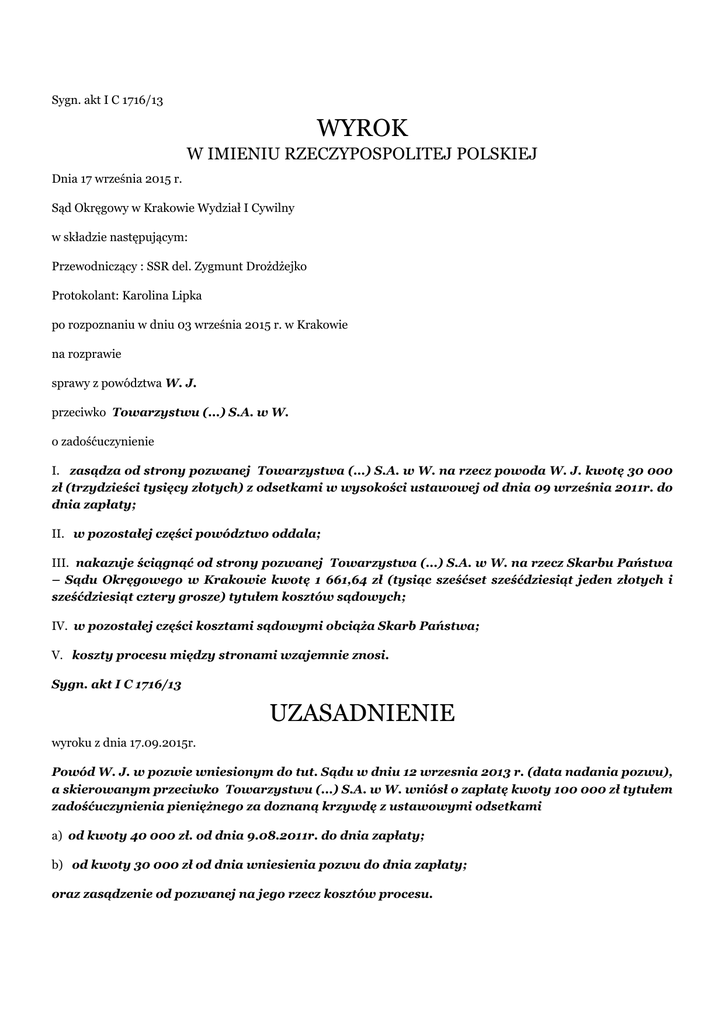 Sygn. akt I C 1716/13 WYROK W IMIENIU RZECZYPOSPOLITEJ POLSKIEJ Dnia 17 września 2015 r. Sąd Okręgowy w Krakowie Wydział I Cywilny w składzie następującym: Przewodniczący : SSR del. Zygmunt Drożdżejko Protokolant: Karolina Lipka po rozpoznaniu w dniu 03 września 2015 r. w Krakowie na rozprawie sprawy z powództwa W. J. przeciwko Towarzystwu (...) S.A. w W. o zadośćuczynienie I. zasądza od strony pozwanej Towarzystwa (...) S.A. w W. na rzecz powoda W. J. kwotę 30 000 zł (trzydzieści tysięcy złotych) z odsetkami w wysokości ustawowej od dnia 09 września 2011r. do dnia zapłaty; II. w pozostałej części powództwo oddala; III. nakazuje ściągnąć od strony pozwanej Towarzystwa (...) S.A. w W. na rzecz Skarbu Państwa – Sądu Okręgowego w Krakowie kwotę 1 661,64 zł (tysiąc sześćset sześćdziesiąt jeden złotych i sześćdziesiąt cztery grosze) tytułem kosztów sądowych; IV. w pozostałej części kosztami sądowymi obciąża Skarb Państwa; V. koszty procesu między stronami wzajemnie znosi. Sygn. akt I C 1716/13 UZASADNIENIE wyroku z dnia 17.09.2015r. Powód W. J. w pozwie wniesionym do tut. Sądu w dniu 12 wrzesnia 2013 r. (data nadania pozwu), a skierowanym przeciwko Towarzystwu (...) S.A. w W. wniósł o zapłatę kwoty 100 000 zł tytułem zadośćuczynienia pieniężnego za doznaną krzywdę z ustawowymi odsetkami a) od kwoty 40 000 zł. od dnia 9.08.2011r. do dnia zapłaty; b) od kwoty 30 000 zł od dnia wniesienia pozwu do dnia zapłaty; oraz zasądzenie od pozwanej na jego rzecz kosztów procesu. Na uzasadnienie wskazał, że w dniu 1.10.2010r. uległ wypadkowi, przejechał go wózek elektryczny widłowy w czasie naprawy. Odpowiedzialność cywilną za ten wypadek ponosi Towarzystwo (...) S.A. w W.. Powód doznał wielu urazów. Był również hospitalizowany. Przyznał, ze nie miał uprawnień do prowadzenia wózka, ale fakt prowadzenia wózka przez niego był akceptowany przez kierownictwo zakładu. Strona pozwana Towarzystwo (...) S.A. w W. wniosła o oddalenie powództwa i zasądzenie od powoda na rzecz pozwanego kosztów procesu. Przyznała, że co do zasady ponosi odpowiedzialność za wypadek. Podstawą oddalenia roszczenia jest jednak okoliczność, że powód ponosi wyłączną odpowiedzialność za wypadek. Po pierwsze jeździł wózkiem bez uprawnień, a po drugie naprawiał wózek w sposób naruszający wszelkie zasady bezpieczeństwa. Podniesiono również, że wysokość roszczenia nie jest udowodniona. Odsetki mogą zostać zasądzone co najwyżej od dnia uprawomocnienia się wyroku. Sąd ustalił stan faktyczny: Powód W. J. był pracownikiem (...) spółka z o.o. w A.. W dniu 1.10.2010r. na terenie W. T.w A. doszło do wypadku. Było to przedsiębiorstwo wprowadzane w ruch za pomocą sił przyrody. Spółka była ubezpieczona od odpowiedzialności cywilnej w Towarzystwie (...) S.A. w W.. dowód: okoliczność bezsporna Przebieg wypadku był następujący: Powód jechał ciągnikiem akumulatorowym będącym własnością zakładu pracy. W pewnym momencie ciągnik akumulatorowy zatrzymał się. Powód wysiadł. Pedał gazu zablokował deseczką, nie zaciągnął hamulca ręcznego, nie wyłączył silnika. Poszedł z przodu naprawiać ciągnik. Prawdopodobnie próbował włożyć zawleczkę dźwigni sterującej pedału przyspieszenia. W pewnym momencie ciągnik ruszył do tyłu. Powód chcąc go zatrzymać doskoczył do niego i coś przestawił. Wtedy wózek ruszył do przodu. Powód stracił równowagę i wózek najechał na niego. dowód: protokół ustalenia okoliczności i przyczyn wypadku k.55-56, opinia biegłego k.68-79 w aktach Prokuratury Rejonowej w (...) Powód nie miał uprawnień do prowadzenia ciągnika akumulatorowego. Pracownicy – nie tylko powód - jeździli nim. Pracodawca wiedział o tym i tolerował ten stan rzeczy. Organizacja pracy była taka, że wymuszało to jazdę ciągnikiem przez osoby bez uprawnień. Czasami na zmianie nie było osoby, która miała uprawnienia do jazdy wózkiem. Każdy pracował przy maszynie i aby osoba z uprawnieniami miała jechać ciągnikiem musiałaby wyłączyć ją. To mogło spowodować zniszczenie materiału. Nie było osoby do zadań której należałaby tylko jazda ciągnikiem. Czasami zdarzało się, że pracownicy bez uprawnień dostawali polecenie jazdy ciągnikiem od przełożonego mistrza. dowód: zeznania świadka P. K. k. 104, zeznania świadka S. T. k. 105 zeznania świadka W. W. k. 105-106, zeznania powoda W. J. k. 110-112 W chwili wypadku stan ciągnika uniemożliwiał bezpieczne użytkowanie go. Brak było kluczyka do stacyjki. Obwód stacyjki został połączony trwale co umożliwiało korzystanie z niego. Włączenie i wyłączenie ciągnika dokonywano przez złączenie lub rozłączenie gniazda akumulatorowego. Niesprawne było cięgło pedału przyspieszenia. Brak było zabezpieczenia uniemożliwiającego odłączenie się dźwigni od pedału przyspieszenia. Brak oświetlenia (w tym pedału stop), zdeformowane koło kierownicy- popękane w kilku miejscach, brak kontrolek. Samoczynne przemieszczenie się ciągnika było możliwe przy wciśniętym pedale przyspieszenia i zwolnionym hamulcu ręcznym. Hamulec ręczny był sprawny. Częstą praktyką było, że pracownicy sami naprawiali ciągnik. Naprawa czasami polegała na uderzeniu go deską. Dopiero jak nie byli w stanie sami tego zrobić to wzywano osobę do naprawy ciągników. Na stanie zakładu było kilka ciągników akumulatorowych. Wszystkie były w bardzo złym stanie. Co chwila się psuły. W zasadzie to cały czas któryś z ciągników był w naprawie. Jak jeden naprawiono to drugi się psuł. Naprawy miały charakter prowizoryczny. dowód: opinia biegłego k.68-79 w aktach Prokuratury Rejonowej w Wadowicach 2Ds 1321/10/D, zeznania świadka S. T. k. 105, zeznania świadka W. W. k. 105-106 W wyniku wypadku powód doznał ciężkiego uszkodzenia ciała. Doszło do wieloodłamowego złamania miednic