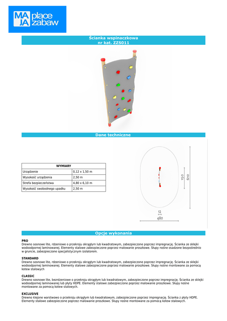 Ścianka wspinaczkowa nr kat. ZZS011 Dane techniczne WYMIARY Urządzenie 0,12 x 1,50 m Wysokość urządzenia 2,50 m Strefa bezpieczeństwa 4,80 x 6,10 m Wysokość swobodnego upadku 2,50 m Opcje wykonania PRO Drewno sosnowe lite, rdzeniowe o przekroju okrągłym lub kwadratowym, zabezpieczone poprzez impregnację. Ścianka ze sklejki wodoodpornej laminowanej. Elementy stalowe zabezpieczone poprzez malowanie proszkowe. Słupy nośne osadzone bezpośrednio w gruncie, zabezpieczone specjalistycznym izolatorem. STANDARD Drewno sosnowe lite, rdzeniowe o przekroju okrągłym lub kwadratowym, zabezpieczone poprzez impregnację. Ścianka ze sklejki wodoodpornej laminowanej. Elementy stalowe zabezpieczone poprzez malowanie proszkowe. Słupy nośne montowane za pomocą kotew stalowych CLASSIC Drewno sosnowe lite, bezrdzeniowe o przekroju okrągłym lub kwadratowym, zabezpieczone poprzez impregnację. Ścianka ze sklejki wodoodpornej laminowanej lub płyty HDPE. Elementy stalowe zabezpieczone poprzez malowanie proszkowe. Słupy nośne montowane za pomocą kotew stalowych. EXCLUSIVE Drewno klejone warstwowo o przekroju okrągłym lub kwadratowym, zabezpieczone poprzez impregnację. Ścianka z płyty HDPE. Elementy stalowe zabezpieczone poprzez malowanie proszkowe. Słupy nośne montowane za pomocą kotew stalowych.