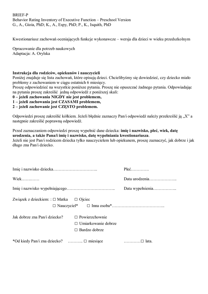 BRIEF-P Behavior Rating Inventory of Executive Function – Preschool Version G., A., Gioia, PhD; K., A., Espy, PhD; P., K., Isquith, PhD Kwestionariusz zachowań oceniających funkcje wykonawcze – wersja dla dzieci w wieku przedszkolnym Opracowanie dla potrzeb naukowych Adaptacja: A. Orylska Instrukcja dla rodziców, opiekunów i nauczycieli Poniżej znajduje się lista zachowań, które opisują dzieci. Chcielibyśmy się dowiedzieć, czy dziecko miało problemy z zachowaniem w ciągu ostatnich 6 miesięcy. Proszę odpowiedzieć na wszystkie poniższe pytania. Proszę nie opuszczać żadnego pytania. Odpowiadając na pytania proszę zakreślić jedną odpowiedź z poniższej skali: 0 – jeżeli zachowania NIGDY nie jest problemem, 1 – jeżeli zachowania jest CZASAMI problemem, 2 – jeżeli zachowanie jest CZĘSTO problemem. Odpowiedzi proszę zakreślić kółkiem. Jeżeli błędnie zaznaczy Pan/i odpowiedź należy przekreślić ją „X” a następnie zakreślić poprawną odpowiedź. Przed zaznaczaniem odpowiedzi proszę wypełnić dane dziecka: imię i nazwisko, płeć, wiek, datę urodzenia, a także Pana/i imię i nazwisko, datę wypełniania kwestionariusza. Jeżeli nie jest Pan/i rodzicem dziecka tylko nauczycielem lub opiekunem, proszę zaznaczyć, jak dobrze i jak długo zna Pan/i dziecko. Imię i nazwisko dziecka………………………….. Płeć…………. Wiek…….…… Data urodzenia……………….. Imię i nazwisko wypełniającego…………………………….. Data wypełnienia…………….. Związek z dzieckiem: : □ Matka □ Ojciec □ Nauczyciel* □ Inna osoba*……………………………….. Jak dobrze zna Pan/i dziecko? *Od kiedy Pan/i zna dziecko? □ Powierzchownie □ Umiarkowanie dobrze □ Bardzo dobrze ……….. □ miesiące …………□ lata. CZĘSTO 1. Dziecko reaguje nadmiernie na małe problemy. 0 1 2 2. Gdy dziecko ma wykonać dwie rzeczy, pamięta tylko jedną z nich. 0 1 2 3. Dziecko nie zdaje sobie sprawy z tego, że jego zachowanie przeszkadza innym. 0 1 2 4. Kiedy dziecko ma posprzątać robi to w niezorganizowany sposób, rzeczy odkłada w przypadkowe miejsca. 5. Dziecko robi się niespokojne/poddenerwowane w nowych sytuacjach. 0 1 2 0 1 2 6. Dziecko ma wybuchy złości. 0 1 2 7. Dziecko ma problem z wykonywaniem czynności niezbędnych do zrobienia zadania (takich jak znalezienia pojedynczego puzzla, posprzątania w zamian za nagrodę). 8. Dziecko nie przestaje się śmiać z zabawnych rzeczy lub wydarzeń, kiedy inni już skończyli się śmiać. 9. Dziecku trzeba kazać rozpocząć zadanie nawet wtedy, gdy ma ochotę je wykonać. 10. Dziecko ma problem z dostosowaniem się do nowych osób (takich jak: opiekun, nauczyciel, przyjaciel lub inna osoba). 11. Dziecko zbyt łatwo traci humor. 0 1 2 0 1 2 0 1 2 0 1 2 0 1 2 12. Dziecko ma problem ze skoncentrowaniem się na grach, układankach i innych zabawach. 13. Dziecko wymaga większej kontroli niż jego rówieśnicy. 14. Kiedy dziecko wysyła się po coś, zapomina co powinno wziąć, kiedy jest poproszone, że ma coś zrobić to zapomina co ma zrobić. 15. Dziecko źle znosi zmiany planów czy codziennej rutyny (np. zaburzenia porządku codziennych czynności, zmiany w ostatniej minucie wcześniej ustalonego planu, zmiany trasy/drogi do sklepu lub w inne miejsce). 16. Dziecko ma wybuchy złości z byle powodu. 0 1 2 0 0 1 1 2 2 0 1 2 0 1 2 17. Dziecko popełnia wciąż te same błędy, nawet gdy ma wsparcie i pomoc. 0 1 2 18. Dziecko zachowuje się bardziej prowokująco i infantylne niż rówieśnicy (np. na urodzinach kolegi lub koleżanki, podczas zabaw grupowych). 19. Dziecko ma problem ze znalezieniem ubrań, butów, książki lub innych rzeczy nawet wtedy, gdy otrzyma dokładną instrukcję, gdzie dana rzecz się znajduje. 20. Dziecko potrzebuje dużo czasu, żeby poczuć się dobrze w nowych miejscach czy sytuacjach (takich jak odwiedziny dalekich krewnych czy nowych znajomych). 0 1 2 0 1 2 0 1 2 NIGDY CZASAMI Jak często występowało poniższe zachowanie jako problem w ciągu ostatnich 6 miesięcy? CZĘSTO 21. Dziecko ma częste wahania nastroju (np. jest wesoły i nagle staje się rozdrażniony) 22. Dziecko popełnia „głupie” błędy w czynnościach, które potrafi. 0 1 2 0 1 2 23. Dziecko jest niespokojne i nerwowe. 0 1 2 24. Dziecko ma problemy z przestrzeganiem i podążaniem według ustalonych zasad związanych z codzienną rutyną np. kładzeniem się spać, jedzenie posiłku, podczas zabawy. 25. Dziecku przeszkadzają głośne dźwięki, jasne lub zbyt jaskrawe światło czy wybrane zapachy. 26. Małe, drobne wydarzenia/sytuacje wywołują u dziecka nadmierne/nieadekwatne reakcje. 27. Dziecko ma problem z czynnościami lub zadaniami złożonymi z więcej niż jednej czynności. 28. Dziecko jest impulsywne. 0 1 2 0 1 2 0 1 2 0 1 2 0 1 2 29. Dziecko kiedy napotyka trudności ma problem z myśleniem o innych sposobach rozwiązania problemów czy kończenia z zadań. 30. Dziecko rozpraszają zmiany w najbliższym otoczeniu (takie jak nowe meble, przesunięte rzeczy w pokoju, czy nowe ubrania). 31. Wybuchy złości lub płaczu u dziecka są intensywne ale szybko mijają. 0 1 2 0 1 2 0 1 2 32. Dziecko do kontynuowania zadanie potrzebuje wsparcia dorosłego. 33. Dziecko nie zauważa, że jego zachowanie wywołuje u innych negatywne reakcje (np. nie zna umiaru w wygłupach). 34. Dziecko zostawia bałagan, podczas gdy inni sprzątają, nawet po wydanym poleceniu. 35. Dziecko ma problem ze zmianą aktywności. 0 0 1 1 2 2 0 1 2 0 1 2 36. Dziecko reaguje intensywniej na dane sytuacje niż jego rówieśnicy. 0 1 2 37. Dziecko zapomina o tym co ma robić w trakcie danej aktywności czy zadania. 0 1 2 38. Dziecko nie zauważa, że pewne jego działania przeszkadzają innym. 39. Dziecko rozwiązując zadanie lub wykonując daną czynność zapomina o głównym celu, gdyż skupia się na szczegółach lub detalach. 40. Dziecko ma problem z przyłącz