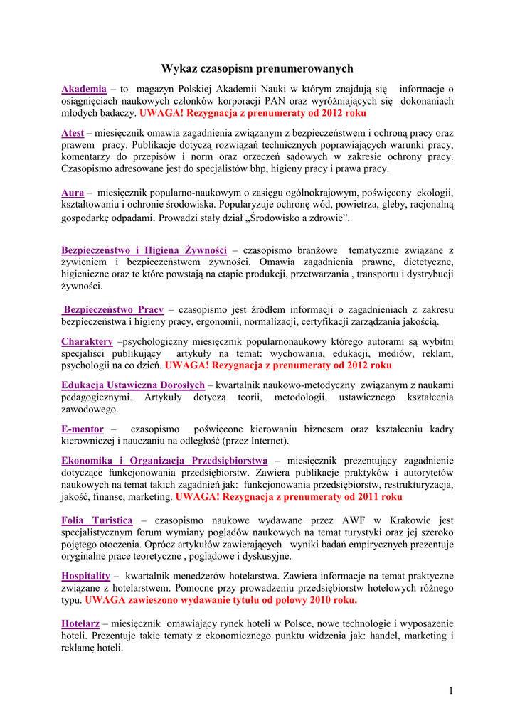 Wykaz czasopism prenumerowanych Akademia – to magazyn Polskiej Akademii Nauki w którym znajdują się informacje o osiągnięciach naukowych członków korporacji PAN oraz wyróżniających się dokonaniach młodych badaczy. UWAGA! Rezygnacja z prenumeraty od 2012 roku Atest – miesięcznik omawia zagadnienia związanym z bezpieczeństwem i ochroną pracy oraz prawem pracy. Publikacje dotyczą rozwiązań technicznych poprawiających warunki pracy, komentarzy do przepisów i norm oraz orzeczeń sądowych w zakresie ochrony pracy. Czasopismo adresowane jest do specjalistów bhp, higieny pracy i prawa pracy. Aura – miesięcznik popularno-naukowym o zasięgu ogólnokrajowym, poświęcony ekologii, kształtowaniu i ochronie środowiska. Popularyzuje ochronę wód, powietrza, gleby, racjonalną gospodarkę odpadami. Prowadzi stały dział „Środowisko a zdrowie”. Bezpieczeństwo i Higiena Żywności – czasopismo branżowe tematycznie związane z żywieniem i bezpieczeństwem żywności. Omawia zagadnienia prawne, dietetyczne, higieniczne oraz te które powstają na etapie produkcji, przetwarzania , transportu i dystrybucji żywności. Bezpieczeństwo Pracy – czasopismo jest źródłem informacji o zagadnieniach z zakresu bezpieczeństwa i higieny pracy, ergonomii, normalizacji, certyfikacji zarządzania jakością. Charaktery –psychologiczny miesięcznik popularnonaukowy którego autorami są wybitni specjaliści publikujący artykuły na temat: wychowania, edukacji, mediów, reklam, psychologii na co dzień. UWAGA! Rezygnacja z prenumeraty od 2012 roku Edukacja Ustawiczna Dorosłych – kwartalnik naukowo-metodyczny związanym z naukami pedagogicznymi. Artykuły dotyczą teorii, metodologii, ustawicznego kształcenia zawodowego. E-mentor – czasopismo poświęcone kierowaniu biznesem oraz kształceniu kadry kierowniczej i nauczaniu na odległość (przez Internet). Ekonomika i Organizacja Przedsiębiorstwa – miesięcznik prezentujący zagadnienie dotyczące funkcjonowania przedsiębiorstw. Zawiera publikacje praktyków i autorytetów naukowych na temat takich zagadnień jak: funkcjonowania przedsiębiorstw, restrukturyzacja, jakość, finanse, marketing. UWAGA! Rezygnacja z prenumeraty od 2011 roku Folia Turistica – czasopismo naukowe wydawane przez AWF w Krakowie jest specjalistycznym forum wymiany poglądów naukowych na temat turystyki oraz jej szeroko pojętego otoczenia. Oprócz artykułów zawierających wyniki badań empirycznych prezentuje oryginalne prace teoretyczne , poglądowe i dyskusyjne. Hospitality – kwartalnik menedżerów hotelarstwa. Zawiera informacje na temat praktyczne związane z hotelarstwem. Pomocne przy prowadzeniu przedsiębiorstw hotelowych różnego typu. UWAGA zawieszono wydawanie tytułu od połowy 2010 roku. Hotelarz – miesięcznik omawiający rynek hoteli w Polsce, nowe technologie i wyposażenie hoteli. Prezentuje takie tematy z ekonomicznego punktu widzenia jak: handel, marketing i reklamę hoteli. 1 Hotelarstwo – czasopismo branżowe prezentuje praktykę hotelarską oraz ludzi związanym z hotelarstwem z którymi przeprowadza obszerne wywiady. Omawia nowe obiekty hotelowe powstające w Polsce. Lider – czasopismo promujące zdrowie i kulturę fizyczną wśród dzieci i młodzieży szkolnej. Adresowane przede wszystkim do nauczycieli wychowania fizycznego. UWAGA! Od 2012 roku przestaje się ukazywać w wersji drukowanej. Bezpłatna wersja elektroniczna na stronie www.lider.szs.pl Marketing w praktyce – miesięcznik dla ekonomistów zajmujących się marketingiem. Prezentuje osiągnięcia tych którzy w warunkach konkurencyjnego rynku zbudowali stabilną pozycję swoich firm i wykreowali markę poszukiwana przez klientów. UWAGA! Rezygnacja z prenumeraty od 2011 roku National Geographic – czasopismo popularnonaukowe, wzbogacające wiedzę o lądach , morzach, atrakcjach turystycznych na świecie oraz kulturze , obyczajach i historii podróżowania. Oświatowiec – biuletyn wydawany jest przez Stowarzyszenie Oświatowców Polskich. Omawia zagadnienia związane z popularyzacją współczesnej wiedzy społecznej i pedagogicznej , kształceniem ustawiczny oraz wymianę doświadczeń pomiędzy członkami i sympatykami SOP. PC Format – magazyn komputerowy dla osób, którzy chcą wiedzieć więcej na temat wykorzystywania sprzętu i oprogramowania, interesują się nowościami rynkowymi, Internetem, zaawansowanymi technologiami do użytku domowego i biurowego. Pedagogika Pracy - czasopismo w takich działach jak: pedagogika pracy, edukacja i praca zawodowa, poradnictwo zawodowe omawia te zagadnienia z pedagogicznego punktu widzenia. Artykuły dotyczą teorii i metodologii szeroko pojętej andragogiki . Personel i zarządzanie – pierwszy polski specjalistyczny poradnik zawodowy. Przekazujący praktyczne informacje i porady ułatwiające kierowanie i zarządzanie pracownikami w przedsiębiorstwach. Upowszechnia nowoczesne metody organizowania pracy oraz tworzenia efektywnych struktur przedsiębiorstw i instytucji. UWAGA! Rezygnacja z prenumeraty od 2011 roku Podróże – magazyn turystyczny dla wszystkich, którzy chcą podróżować. Przekazuje informacje, które w praktyczny sposób pomagają czytelnikom w realizacji podróżniczych planów i zamierzeń, dostarcza inspiracji do nowych podróży. Poradnik bibliotekarza – miesięcznik SBP, skierowany do bibliotekarzy bibliotek publicznych, szkolnych i pedagogicznych. Autorzy artykułów prezentują swoje bibliotek i problemy z nimi związane. Omawiają czytelnictwo, i sposoby aktywizacji czytelnika . Problemy Turystyki – kwartalnik wydawany przez Instytut Turystyki w Warszawie. Prezentuje metody naukowe i wyniki badań związane z turystyką w zakresie : ekonomicznym, społecznym, przestrzennym i organizacyjnym. Przegląd Gastronomiczny – czasopismo gastronomów i hotelarzy, poświęcone zagadnieniom takim jak: żywienie człowieka, kuchnie regionalne, technika i technolog