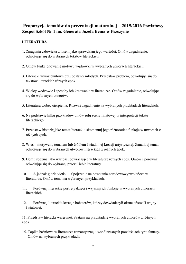 Propozycje tematów do prezentacji maturalnej – 2015/2016 Powiatowy Zespół Szkół Nr 1 im. Generała Józefa Bema w Pszczynie LITERATURA 1. Zmagania człowieka z losem jako sprawdzian jego wartości. Omów zagadnienie, odwołując się do wybranych tekstów literackich. 2. Omów funkcjonowanie motywu wędrówki w wybranych utworach literackich 3. Literacki wyraz buntowniczej postawy młodych. Przedstaw problem, odwołując się do tekstów literackich różnych epok. 4. Wielcy wodzowie i sposoby ich kreowania w literaturze. Omów zagadnienie, odwołując się do wybranych utworów. 5. Literatura wobec cierpienia. Rozważ zagadnienie na wybranych przykładach literackich. 6. Na podstawie kilku przykładów omów rolę sceny finałowej w interpretacji tekstu literackiego. 7. Przedstaw historię jako temat literacki i skomentuj jego różnorodne funkcje w utworach z różnych epok. 8. Wieś – motywem, tematem lub źródłem świadomej kreacji artystycznej. Zanalizuj temat, odwołując się do wybranych utworów literackich z różnych epok. 9. Dom i rodzina jako wartości powracające w literaturze różnych epok. Omów i porównaj, odwołując się do wybranej przez Ciebie literatury. 10. A jednak gloria victis. . . Spojrzenie na powstania narodowowyzwoleńcze w literaturze. Omów temat na wybranych przykładach. 11. Porównaj literackie portrety dzieci i wyjaśnij ich funkcje w wybranych utworach literackich. 12. Porównaj literackie kreacje bohaterów, którzy doświadczyli okrucieństw II wojny światowej. 11. Przedstaw literacki wizerunek Szatana na przykładzie wybranych utworów z różnych epok. 15. Topika baśniowa w literaturze romantycznej i współczesnych powieściach typu fantasy. Omów na wybranych przykładach. 1 16. Motyw arkadii w literaturze. Przedstaw jego różnorodne ujęcia i funkcje w wybranych dziełach literackich. 17. Egzystencjalne i moralne dylematy pisarzy pokolenia Kolumbów. Omów temat na wybranych przykładach literackich. 18. Dialog z tradycją romantyczną w literaturze XX wieku. Zanalizuj wybrane przykłady. 19. Metamorfoza bohatera. Porównaj sposób ujęcia motywu, analizując wybrane utwory literackie z różnych epok. 20. Omów światopoglądowe dylematy w kreacji bohaterów literackich, analizując wybrane utwory literackie. 21. Analizując wybrane przykłady, omów funkcjonowanie naturalizmu w literaturze XIX i XX wieku. 23. Droga do szczęścia . . . Przedstaw koncepcje pisarzy różnych epok. 24. Pokora jako jeden z motywów Biblii i wybranych utworów literackich. Przedstaw i omów jego funkcjonowanie. 25. Artysta jako bohater literacki. Przedstaw i porównaj różne sposoby oraz znaczenie kreacji tej postaci w wybranych utworach różnych epok. 26. „Inny świat” obłąkanych w literaturze. Omów motyw szaleństwa, analizując wybrane utwory literackie. 27. Wpływ domu rodzinnego na kształtowanie się postaw moralnych bohaterów literackich. Przedstaw zagadnienie na wybranych przykładach. 28. Dekadentyzm, afirmacja, ironia – postawy wobec życia, które znalazły odbicie w literaturze. Omów temat na podstawie kilku utworów literackich. 29. Bohater – mąż. Przedstaw literackie wizerunki mężów i oceń sposób kreowania postaci. 30. Portret Żydów polskich w literaturze. Przedstaw różnorodność ujęcia postaci w wybranych dziełach. 31. Porównaj postawy wybranych poetów, odwołując się do utworów literackich z różnych epok. 32. Przedstaw na wybranych przykładach obraz holocaustu w literaturze polskiej. 2 33. Motyw milczenia w dziełach literatury polskiej. Zanalizuj jego ujęcia w wybranych utworach literackich. 34. Motyw kariery w literaturze. Omów różne jego realizacje na wybranych przykładach literackich z różnych epok. 35. Tatry w polskiej literaturze. Omów, odwołując się do wybranych przykładów, różny sposób prezentacji i funkcje tego tematu. 36. Obraz śmierci w literaturze. Porównaj różne ujęcia motywu, odwołując się do wybranych przykładów. 37. Na wybranych przykładach bohaterów literackich zanalizuj różnorodne ujęcia motywu buntownika. 38. Na wybranych przykładach z literatury XX wieku omów postawę człowieka wobec doświadczeń totalitaryzmu. 39. Obrzędy i obyczaje ludowe w literaturze. Omów sposoby ich przedstawienia i funkcje w wybranych utworach literackich. 40. Obraz zaświatów w literaturze. Przedstaw i zanalizuj na przykładzie utworów z różnych epok. 41. Motywy autobiograficzne w literaturze. Omów zagadnienie w odniesieniu do wybranych utworów z różnych epok. 42. Sztuka kulinarna w literaturze. Zaprezentuj i określ funkcję motywu w wybranych utworach. 43. Metody twórcze w literaturze XX wieku. Omów zagadnienie na wybranych przykładach. 44. Współczesna poezja polska wobec dziedzictwa przeszłości. Rozważ na wybranych przykładach. 45. Portret kobiety w literaturze polskiej. Omów zagadnienie na przykładzie wybranych utworów literackich. 46. Mit ikaryjski w literaturze polskiej. Przedstaw na wybranych przykładach funkcjonowanie i różnorodność interpretacyjną mitu. 47. Bóg w literaturze. Porównaj sposób jego kreacji, analizując wybrane utwory literackie z różnych epok. 48. Porównaj różne ujęcia motywu wsi w dziełach twórców Młodej Polski. Omów zagadnienie na wybranych przykładach z literatury. 3 49. Porównaj rożne portrety literackie władców i oceń ich postawę. 50. Analizując wybrane utwory, porównaj słynne małżeństwa literackie. 51. Przedstaw różne oblicza rewolucji w wybranych utworach literackich. 52. Życie w krzywym zwierciadle. Rozważ sens metafory w oparciu o przykłady z epiki i dramatu. 53. Literatura faktu – przedstaw zjawisko na przykładzie współczesnej literatury polskiej. 54. Miłość i radość życia jako powtarzający się motyw w poezji. Zaprezentuj temat, odwołując się do wybranych przykładów z różnych epok literackich. 55. Tytuł, motto, cytat, ostatnia scena jako klucze do interp