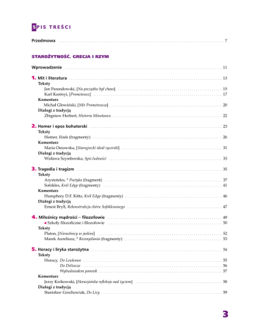 Spis treści Przedmowa . . . . . . . . . . . . . . . . . . . . . . . . . . . . . . . . . . . . . . . . . . . . . . . . . . . . . . . . . . . . . . . . . . . . . . . . . . . . . . . . . . . 7 STAROŻYTNOŚĆ. GRECJA I RZYM Wprowadzenie . . . . . . . . . . . . . . . . . . . . . . . . . . . . . . . . . . . . . . . . . . . . . . . . . . . . . . . . . . . . . . . . . . . . . . . . . . . . . . . 1. Mit i literatura . . . . . . . . . . . . . . . . . . . . . . . . . . . . . . . . . . . . . . . . . . . . . . . . . . . . . . . . . . . . . . . . . . . . . . . . . . . . Teksty Jan Parandowski, [Na początku był chaos] . . . . . . . . . . . . . . . . . . . . . . . . . . . . . . . . . . . . . . . . . . . . . . . . . . . . Karl Kerényi, [Prometeusz] . . . . . . . . . . . . . . . . . . . . . . . . . . . . . . . . . . . . . . . . . . . . . . . . . . . . . . . . . . . . . . . . Komentarz Michał Głowiński, [Mit Prometeusza] . . . . . . . . . . . . . . . . . . . . . . . . . . . . . . . . . . . . . . . . . . . . . . . . . . . . . . . Dialogi z tradycją Zbigniew Herbert, Historia Minotaura . . . . . . . . . . . . . . . . . . . . . . . . . . . . . . . . . . . . . . . . . . . . . . . . . . . . . . . 11 13 15 17 20 22 2. Homer i epos bohaterski . . . . . . . . . . . . . . . . . . . . . . . . . . . . . . . . . . . . . . . . . . . . . . . . . . . . . . . . . . . . . . . . . . 23 Teksty Homer, Iliada (fragmenty) . . . . . . . . . . . . . . . . . . . . . . . . . . . . . . . . . . . . . . . . . . . . . . . . . . . . . . . . . . . . . . . . 26 Komentarz Maria Ossowska, [Starogrecki ideał rycerski] . . . . . . . . . . . . . . . . . . . . . . . . . . . . . . . . . . . . . . . . . . . . . . . . . . 31 Dialogi z tradycją Wisława Szymborska, Spis ludności . . . . . . . . . . . . . . . . . . . . . . . . . . . . . . . . . . . . . . . . . . . . . . . . . . . . . . . . 33 3. Tragedia i tragizm . . . . . . . . . . . . . . . . . . . . . . . . . . . . . . . . . . . . . . . . . . . . . . . . . . . . . . . . . . . . . . . . . . . . . . . . Teksty Arystoteles, * Poetyka (fragment) . . . . . . . . . . . . . . . . . . . . . . . . . . . . . . . . . . . . . . . . . . . . . . . . . . . . . . . . . . . Sofokles, Król Edyp (fragmenty) . . . . . . . . . . . . . . . . . . . . . . . . . . . . . . . . . . . . . . . . . . . . . . . . . . . . . . . . . . . Komentarz Humphrey D.F. Kitto, Król Edyp (fragmenty) . . . . . . . . . . . . . . . . . . . . . . . . . . . . . . . . . . . . . . . . . . . . . . . . Dialogi z tradycją Ernest Bryll, Rekonstrukcja chóru Sofoklesowego . . . . . . . . . . . . . . . . . . . . . . . . . . . . . . . . . . . . . . . . . . . . . . . 35 37 41 46 47 4. Miłośnicy mądrości – filozofowie . . . . . . . . . . . . . . . . . . . . . . . . . . . . . . . . . . . . . . . . . . . . . . . . . . . . . . . . . 49 Szkoły filozoficzne i filozofowie . . . . . . . . . . . . . . . . . . . . . . . . . . . . . . . . . . . . . . . . . . . . . . . . . . . . . . . . . 50 Teksty Platon, [Niewolnicy w jaskini] . . . . . . . . . . . . . . . . . . . . . . . . . . . . . . . . . . . . . . . . . . . . . . . . . . . . . . . . . . . . . . . 52 Marek Aureliusz, * Rozmyślania (fragmenty) . . . . . . . . . . . . . . . . . . . . . . . . . . . . . . . . . . . . . . . . . . . . . . . . . 53 n 5. Horacy i liryka starożytna . . . . . . . . . . . . . . . . . . . . . . . . . . . . . . . . . . . . . . . . . . . . . . . . . . . . . . . . . . . . . . . . . Teksty Horacy, Do Leukonoe . . . . . . . . . . . . . . . . . . . . . . . . . . . . . . . . . . . . . . . . . . . . . . . . . . . . . . . . . . . . . . . . . . . . . Do Deliusza . . . . . . . . . . . . . . . . . . . . . . . . . . . . . . . . . . . . . . . . . . . . . . . . . . . . . . . . . . . . . . . . . . . . . Wybudowałem pomnik . . . . . . . . . . . . . . . . . . . . . . . . . . . . . . . . . . . . . . . . . . . . . . . . . . . . . . . . . . . . . Komentarz Jerzy Krókowski, [Horacjańska refleksja nad życiem] . . . . . . . . . . . . . . . . . . . . . . . . . . . . . . . . . . . . . . . . . . . Dialogi z tradycją Stanisław Grochowiak, Do Licy . . . . . . . . . . . . . . . . . . . . . . . . . . . . . . . . . . . . . . . . . . . . . . . . . . . . . . . . . . . . 54 55 56 57 58 59 Do matury krok po kroku . . . . . . . . . . . . . . . . . . . . . . . . . . . . . . . . . . . . . . . . . . . . . . . . . . . . . . . . . . . . . . . . . . . Rozważamy, podsumowujemy, piszemy . . . . . . . . . . . . . . . . . . . . . . . . . . . . . . . . . . . . . . . . . . . . . . . . . . . . . . Wiadomości z nauki o języku Związki frazeologiczne . . . . . . . . . . . . . . . . . . . . . . . . . . . . . . . . . . . . . . . . . . . . . . . . . . . . . . . . . . . . . . . . . . . Ćwiczymy swój język . . . . . . . . . . . . . . . . . . . . . . . . . . . . . . . . . . . . . . . . . . . . . . . . . . . . . . . . . . . . . . . . . . . . . . 60 62 62 64 STAROŻYTNOŚĆ. ŚWIAT BIBLII Wprowadzenie . . . . . . . . . . . . . . . . . . . . . . . . . . . . . . . . . . . . . . . . . . . . . . . . . . . . . . . . . . . . . . . . . . . . . . . . . . . . . . 1. Sens istnienia – opowieść o początku i końcu . . . . . . . . . . . . . . . . . . . . . . . . . . . . . . . . . . . . . . . . . . . . . Wybrane księgi biblijne . . . . . . . . . . . . . . . . . . . . . . . . . . . . . . . . . . . . . . . . . . . . . . . . . . . . . . . . . . . . . . . . . . . . Teksty Z Księgi Rodzaju,[Stworzenie świata i człowieka] . . . . . . . . . . . . . . . . . . . . . . . . . . . . . . . . . . . . . . . . . . . . . . [Grzech pierworodny i wygnanie z raju] . . . . . . . . . . . . . . . . . . . . . . . . . . . . . . . . . . . . . . Apokalipsa św. Jana (fragmenty) . . . . . . . . . . . . . . . . . . . . . . . . . . . . . . . . . . . . . . . . . . . . . . . . . . . . . . . . . . Komentarz Anna Świderkówna, [Hymn o początku] . . . . . . . . . . . . . . . . . . . . . . . . . . . . . . . . . . . . . . . . . . . . . . . . . . . . .