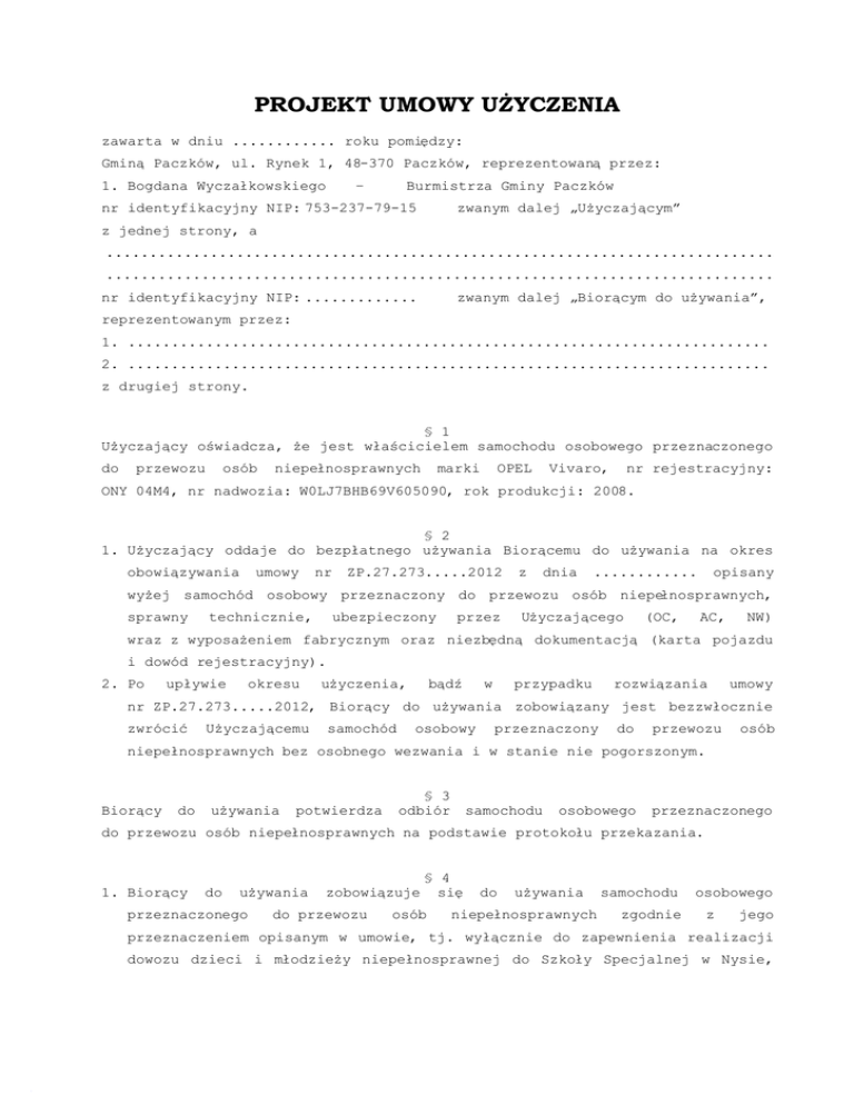 PROJEKT UMOWY UŻYCZENIA zawarta w dniu ............ roku pomiędzy: Gminą Paczków, ul. Rynek 1, 48-370 Paczków, reprezentowaną przez: 1. Bogdana Wyczałkowskiego – Burmistrza Gminy Paczków nr identyfikacyjny NIP: 753-237-79-15 zwanym dalej „Użyczającym” z jednej strony, a ............................................................................. ............................................................................. nr identyfikacyjny NIP: ............. zwanym dalej „Biorącym do używania”, reprezentowanym przez: 1. .......................................................................... 2. .......................................................................... z drugiej strony. § 1 Użyczający oświadcza, że jest właścicielem samochodu osobowego przeznaczonego do przewozu osób niepełnosprawnych marki OPEL Vivaro, nr rejestracyjny: ONY 04M4, nr nadwozia: W0LJ7BHB69V605090, rok produkcji: 2008. § 2 1. Użyczający oddaje do bezpłatnego używania Biorącemu do używania na okres obowiązywania umowy nr ZP.27.273.....2012 z dnia ............ opisany wyżej samochód osobowy przeznaczony do przewozu osób niepełnosprawnych, sprawny technicznie, ubezpieczony przez Użyczającego (OC, AC, NW) wraz z wyposażeniem fabrycznym oraz niezbędną dokumentacją (karta pojazdu i dowód rejestracyjny). 2. Po upływie okresu użyczenia, bądź w przypadku rozwiązania umowy nr ZP.27.273.....2012, Biorący do używania zobowiązany jest bezzwłocznie zwrócić Użyczającemu samochód osobowy przeznaczony do przewozu osób niepełnosprawnych bez osobnego wezwania i w stanie nie pogorszonym. Biorący do używania potwierdza § 3 odbiór samochodu osobowego przeznaczonego do przewozu osób niepełnosprawnych na podstawie protokołu przekazania. 1. Biorący do używania przeznaczonego zobowiązuje do przewozu § 4 się osób do używania niepełnosprawnych samochodu zgodnie osobowego z jego przeznaczeniem opisanym w umowie, tj. wyłącznie do zapewnienia realizacji dowozu dzieci i młodzieży niepełnosprawnej do Szkoły Specjalnej w Nysie, Gimnazjum Publicznego w Paczkowie, Szkoły Podstawowej w Kamienicy, Szkoły Podstawowej w Trzeboszowicach oraz Liceum Ogólnokształcącego w Paczkowie. 2. Biorącemu do używania nie wolno oddawać samochodu osobowego przeznaczonego do przewozu osób niepełnosprawnych do używania osobom trzecim. § 5 1. Wszystkie koszty z tytułu korzystania z samochodu osobowego przeznaczonego do przewozu osób niepełnosprawnych, m. in. opłaty z tytułu przeglądów technicznych, napraw, napraw eksploatacyjnych, zakupu paliwa przez czas trwania umowy będzie ponosił Biorący do używania. 2. Biorący do używania obowiązany jest na swój koszt utrzymywać pojazd w należytym stanie czystości (umyta karoseria i okna oraz czyste wnętrze). 1. Biorący do używania w razie § 6 potrzeby będzie udostępniać żądanie na Użyczającemu oddany w użyczenie samochód osobowy przeznaczony do przewozu osób niepełnosprawnych. 2. Koszty zużycia paliwa z tytułu udostępniania samochodu osobowego przeznaczonego do przewozu osób niepełnosprawnych dla potrzeb Użyczającego ponosić będzie Użyczający. § 7 Zmiana postanowień niniejszej umowy może nastąpić za zgodą obu stron wyrażoną na piśmie pod rygorem nieważności takiej zmiany. W sprawach nie uregulowanych § 8 niniejszą umową mają zastosowanie przepisy Kodeksu cywilnego. § 9 Niniejsza umowa sporządzona została w trzech jednobrzmiących egzemplarzach, z których dwa egzemplarze otrzymuje Użyczający i jeden egzemplarz Biorący do używania. UŻYCZAJĄCY: BIORĄCY DO UŻYWANIA: 1. .................... 1. ....................