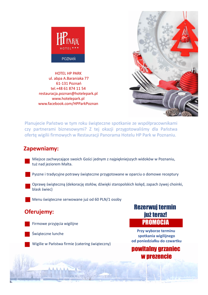 HOTEL HP PARK ul. abpa A.Baraniaka 77 61-131 Poznań tel.+48 61 874 11 54 [email protected] www.hotelepark.pl www.facebook.com/HPParkPoznan Planujecie Państwo w tym roku świąteczne spotkanie ze współpracownikami czy partnerami biznesowymi? Z tej okazji przygotowaliśmy dla Państwa ofertę wigilii firmowych w Restauracji Panorama Hotelu HP Park w Poznaniu. Zapewniamy: Miejsce zachwycające swoich Gości jednym z najpiękniejszych widoków w Poznaniu, tuż nad jeziorem Malta. Pyszne i tradycyjne potrawy świąteczne przygotowane w oparciu o domowe receptury Oprawę świąteczną (dekorację stołów, dźwięki staropolskich kolęd, zapach żywej choinki, blask świec) Menu świąteczne serwowane już od 60 PLN/1 osoby Oferujemy: Firmowe przyjęcia wigilijne Świąteczne lunche Wigilie w Państwa firmie (catering świąteczny) Rezerwuj termin już teraz! PROMOCJA Przy wyborze terminu spotkania wigilijnego od poniedziałku do czwartku powitalny grzaniec w prezencie MENU WIGILIJNE w Hotelu HP Park PROPOZYCJA 1 60 PLN/ 1 os. PROPOZYCJA 4 149 PLN/ 1 os. Zakąska – Poczęstunek Szefa kuchni Biała zupa rybna ze świeżym majerankiem i kluseczkami Karp smażony z kapustą i grzybami, ziemniaki pietruszkowe Sernik z brzoskwiniami Kawa, herbata Tuńczyk marynowany, olej sezamowy, rucola Zupa grzybowa z kluseczkami Sandacz na kapuście z sosem winno-maślanym Pierś kacza confit z modrą kapustą Pomarańczowy Bavarois, sos angielski Kawa, herbata PROPOZYCJA 2 PROPOZYCJA 5 85 PLN/ 1 os. Matias, ziemniaki, szczypiorek, jabłko Barszcz czysty Udko z kaczki, modra kapusta, ziemniaki fondant Świąteczny makowiec, piernik Kawa, herbata PROPOZYCJA 3 109 PLN/ 1 os. Wątróbki drobiowe, konfitura ze śliwki i moreli Bulion z borowikami i z kluseczkami Filet z łososia zapiekany z mozzarellą na szpinaku Creme Caramel Kawa, herbata 159 PLN/ 1 os. Łosoś marynowany, ser kozi, buraki, coulis z malin Zupa borowikowa z łazankami Faszerowany mostek cielęcy, boczniaki, sos z czerwonego wina Gruszka gotowana w czerwonym winie, lody piernikowe Praliny świąteczne Kawa, herbata Rezerwuj termin już teraz! PROMOCJA HOTEL HP PARK tel.+48 61 874 11 54 [email protected] MENU WIGILIJNE w Hotelu HP Park PROPOZYCJA 6 130 PLN/ 1 os. Carpaccio z łososia, rucola, Grana Padano Barszcz czysty z uszkami Polędwiczki wieprzowe, duxelles, wędzona szynka, topinambur Lub Sandacz duszony w śmietanie z porami, ziemniaki puree Świąteczne ciasto czekoladowe z wiśniami Bufet zakąsek zimnych 3 porcje/1 os. Świąteczny pasztet w cieście francuskim Śledź w śmietanie Okoń nilowy w zalewie słodko-kwaśniej Indyk pieczony z owocami Polędwiczka wieprzowa z jajkiem przepiórczym Galantyna z kurczaka Sos tatarski, żurawinowy Pieczywo, masło Kawa lub herbata Sok owocowy 20 cl /1 os. Woda mineralna PROPOZYCJA 7 185 PLN/ 1 os. Cielęcina gotowana z sosem z tuńczyka, kapary, wędzona papryka Zupa borowikowa z łazankami Gęś confit , ziemniaki fondant, sos z wiśniami Parfait miodowe, prażone migdały, sos waniliowy Bufet zakąsek zimnych 3 porcje/1 os. Małe paszteciki z dziczyzny Udka z kurczaka nadziewane bakaliami Ruloniki z rostbefu ze szparagami Paluszki z indyka w panierce migdałowej Polędwiczki wieprzowe z grillowanym ananasem Krewetki z melonem Sałatka z kurczaka Ruloniki z łososia i soli w marynacie Pieczywo, masło Trzy rodzaje zimnych sosów, marynaty Kawa lub herbata Sok owocowy 20 cl / 1 os. Woda mineralna Rezerwuj termin już teraz! PROMOCJA HOTEL HP PARK tel.+48 61 874 11 54 [email protected]
