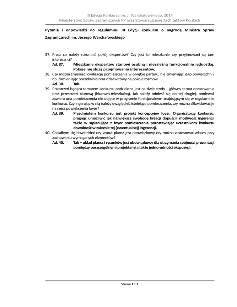 III Edycja Konkursu im. J. Warchałowskiego, 2014 Ministerstwo Spraw Zagranicznych RP oraz Stowarzyszenie Architektów Polskich Pytania i odpowiedzi do regulaminu III Edycji konkursu o nagrodę Ministra Spraw Zagranicznych im. Jerzego Warchałowskiego 37. Przez co należy rozumieć pokój ekspertów? Czy jest to mieszkanie czy przyjmowani są tam interesanci? Ad. 37. Mieszkanie ekspertów stanowi osobną i niezależną funkcjonalnie jednostkę. Pokoje nie służą przyjmowaniu interesantów. 38. Czy można zmieniać lokalizację pomieszczenia w obrębie parteru, nie zmieniając jego powierzchni? np. Zamieniając poczekalnie oraz dział wizowy na pokoje rozmów. Ad. 38. Tak. 39. Przestrzeń będąca tematem konkursu podzielona jest na dwie strefy – główny temat opracowania oraz przestrzeń biurową (biurowo‐mieszkalną). Jak należy odnieść się do tej drugiej, ponieważ zawiera ona pomieszczenia nie objęte w programie funkcjonalnym znajdującym się w regulaminie konkursu. Czy ingerując w nią należy uwzględnić istniejące pomieszczenia, czy można zlikwidować je na rzecz powiększenia foyer? Ad. 39. Przedmiotem konkursu jest projekt koncepcyjny foyer. Organizatorzy konkursu, pragnąc umożliwić jak największą swobodę kreacji dopuścili możliwość ingerencji także w sąsiadujące z foyer pomieszczenia pozostawiając uczestnikom konkursu dowolność w zakresie tej (ewentualnej) ingerencji. 40. Chciałbym się dowiedzieć czy layout plansz jest obowiązkowy czy można zastosować własny przy zachowaniu wymaganych elementów? Ad. 40. Tak – układ plansz i rysunków jest obowiązkowy dla utrzymania spójności prezentacji pomiędzy poszczególnymi projektami a także jednorodności ekspozycji. Strona 1 z 1