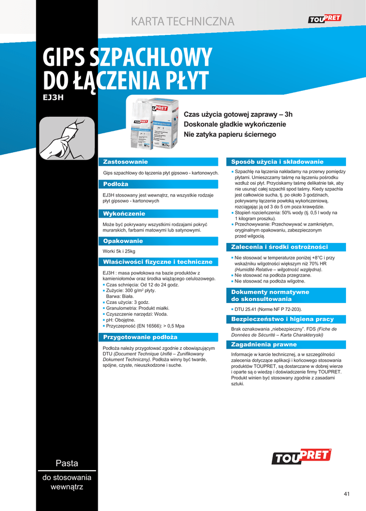 KARTA TECHNICZNA GIPS SZPACHLOWY DO ŁĄCZENIA PŁYT EJ3H Czas użycia gotowej zaprawy – 3h Doskonale gładkie wykończenie Nie zatyka papieru ściernego Zastosowanie Sposób użycia i składowanie Gips szpachlowy do łączenia płyt gipsowo - kartonowych. ■ Podłoża EJ3H stosowany jest wewnątrz, na wszystkie rodzaje płyt gipsowo - kartonowych Wykończenie Może być pokrywany wszystkimi rodzajami pokryć murarskich, farbami matowymi lub satynowymi. Opakowanie Worki 5k i 25kg Właściwości fizyczne i techniczne EJ3H : masa powłokowa na bazie produktów z kamieniołomów oraz środka wiążącego celulozowego. ■ Czas schnięcia: Od 12 do 24 godz. ■ Zużycie: 300 g/m2 płyty. Barwa: Biała. ■ Czas użycia: 3 godz. ■ Granulometria: Produkt miałki. ■ Czyszczenie narzędzi: Woda. ■ pH: Obojętne. ■ Przyczepność (EN 16566): > 0,5 Mpa Przygotowanie podłoża Podłoża należy przygotować zgodnie z obowiązującym DTU (Document Technique Unifié – Zunifikowany Dokument Techniczny). Podłoża winny być twarde, spójne, czyste, nieuszkodzone i suche. Szpachlę na łączenia nakładamy na przerwy pomiędzy płytami. Umieszczamy taśmę na łączeniu pośrodku wzdłuż osi płyt. Przyciskamy taśmę delikatnie tak, aby nie usunąć całej szpachli spod taśmy. Kiedy szpachla jest całkowicie sucha, tj. po około 3 godzinach, pokrywamy łączenie powłoką wykończeniową, rozciągając ją od 3 do 5 cm poza krawędzie. ■ Stopień rozcieńczenia: 50% wody (tj. 0,5 l wody na 1 kilogram proszku). ■ Przechowywanie: Przechowywać w zamkniętym, oryginalnym opakowaniu, zabezpieczonym przed wilgocią. Zalecenia i środki ostrożności Nie stosować w temperaturze poniżej +8°C i przy wskaźniku wilgotności większym niż 70% HR (Humidité Relative – wilgotność względna). ■ Nie stosować na podłoża przegrzane. ■ Nie stosować na podłoża wilgotne. ■ Dokumenty normatywne do skonsultowania ■ DTU 25.41 (Norme NF P 72-203). Bezpieczeństwo i higiena pracy Brak oznakowania „niebezpieczny”. FDS (Fiche de Données de Sécurité – Karta Charakteryski) Zagadnienia prawne Informacje w karcie technicznej, a w szczególności zalecenia dotyczące aplikacji i końcowego stosowania produktów TOUPRET, są dostarczane w dobrej wierze i oparte są o wiedzę i doświadczenie firmy TOUPRET. Produkt winien być stosowany zgodnie z zasadami sztuki. Pasta do stosowania wewnątrz TOUPRET POLSKA Sp. z o.o. ul. Przemysłowa 18, 62-069 Zakrzewo k/Poznania, [email protected], tel. 61 670 68 68 41