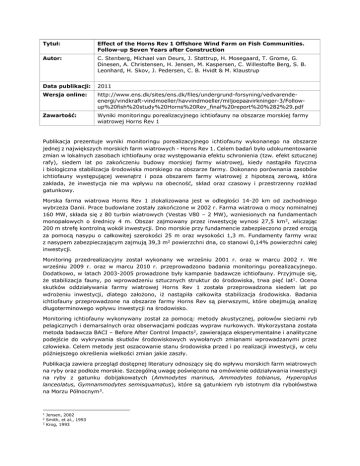 Tytuł: Effect of the Horns Rev 1 Offshore Wind Farm on Fish Communities. Follow-up Seven Years after Construction Autor: C. Stenberg, Michael van Deurs, J. Støttrup, H. Mosegaard, T. Grome, G. Dinesen, A. Christensen, H. Jensen, M. Kaspersen, C. Willestofte Berg, S. B. Leonhard, H. Skov, J. Pedersen, C. B. Hvidt & M. Klaustrup Data publikacji: 2011 Wersja online: http://www.ens.dk/sites/ens.dk/files/undergrund-forsyning/vedvarendeenergi/vindkraft-vindmoeller/havvindmoeller/miljoepaavirkninger-3/Followup%20fish%20study%20Horns%20Rev_final%20report%20%282%29.pdf Zawartość: Wyniki monitoringu porealizacyjnego ichtiofauny na obszarze morskiej farmy wiatrowej Horns Rev 1 Publikacja prezentuje wyniki monitoringu porealizacyjnego ichtiofauny wykonanego na obszarze jednej z największych morskich farm wiatrowych - Horns Rev 1. Celem badań było udokumentowanie zmian w lokalnych zasobach ichtiofauny oraz występowania efektu schronienia (tzw. efekt sztucznej rafy), siedem lat po zakończeniu budowy morskiej farmy wiatrowej, kiedy nastąpiła fizyczna i biologiczna stabilizacja środowiska morskiego na obszarze farmy. Dokonano porównania zasobów ichtiofauny występującej wewnątrz i poza obszarem farmy wiatrowej z hipotezą zerową, która zakłada, że inwestycja nie ma wpływu na obecność, skład oraz czasowy i przestrzenny rozkład gatunkowy. Morska farma wiatrowa Horns Rev 1 zlokalizowana jest w odległości 14-20 km od zachodniego wybrzeża Danii. Prace budowlane zostały zakończone w 2002 r. Farma wiatrowa o mocy nominalnej 160 MW, składa się z 80 turbin wiatrowych (Vestas V80 – 2 MW), wzniesionych na fundamentach monopalowych o średnicy 4 m. Obszar zajmowany przez inwestycję wynosi 27,5 km 2, wliczając 200 m strefę kontrolną wokół inwestycji. Dno morskie przy fundamencie zabezpieczono przed erozją za pomocą nasypu o całkowitej szerokości 25 m oraz wysokości 1,3 m. Fundamenty farmy wraz z nasypem zabezpieczającym zajmują 39,3 m2 powierzchni dna, co stanowi 0,14% powierzchni całej inwestycji. Monitoring przedrealizacyjny został wykonany we wrześniu 2001 r. oraz w marcu 2002 r. We wrześniu 2009 r. oraz w marcu 2010 r. przeprowadzono badania monitoringu porealizacyjnego. Dodatkowo, w latach 2003-2005 prowadzone były kampanie badawcze ichtiofauny. Przyjmuje się, że stabilizacja fauny, po wprowadzeniu sztucznych struktur do środowiska, trwa pięć lat1. Ocena skutków oddziaływania farmy wiatrowej Horns Rev 1 została przeprowadzona siedem lat po wdrożeniu inwestycji, dlatego założono, iż nastąpiła całkowita stabilizacja środowiska. Badania ichtiofauny przeprowadzone na obszarze farmy Horns Rev są pierwszymi, które obejmują analizę długoterminowego wpływu inwestycji na środowisko. Monitoring ichtiofauny wykonywany został za pomocą: metody akustycznej, połowów sieciami ryb pelagicznych i demarsalnych oraz obserwacjami podczas wypraw nurkowych. Wykorzystana została metoda badawcza BACI – Before After Control Impacts2, zawierająca eksperymentalne i analityczne podejście do wykrywania skutków środowiskowych wywołanych zmianami wprowadzanymi przez człowieka. Celem metody jest oszacowanie stanu środowiska przed i po realizacji inwestycji, w celu późniejszego określenia wielkości zmian jakie zaszły. Publikacja zawiera przegląd dostępnej literatury odnoszący się do wpływu morskich farm wiatrowych na ryby oraz podłoże morskie. Szczególną uwagę poświęcono na omówienie oddziaływania inwestycji na ryby z gatunku dobijakowatych (Ammodytes marinus, Ammodytes tobianus, Hyperoplus lanceolatus, Gymnammodytes semisquamatus), które są gatunkiem ryb istotnym dla rybołówstwa na Morzu Północnym3. 1 2 3 Jensen, 2002 Smith, et al., 1993 Krog, 1993 Na podstawie literatury wyszczególniono następujące czynniki mogące oddziaływać na ichtiofaunę: zmiana struktury dna4, zmiana warunków hydrologicznych5, pojawienie się nowych gatunków ryb i organizmów dennych – nowe ogniwa łańcucha pokarmowego6, wzrost biomasy omułka7, obecność elementów infrastruktury – schronienie8, nowe żerowiska9, nowe siedliska10, wzrost bioróżnorodności11, hałas12, wibracje13, pole elektromagnetyczne14, wykluczenie obszaru morskiej farmy wiatrowej z prowadzenia połowów. Wyniki kampanii badawczych, prowadzonych od jesieni 2001 r. do wiosny 2010 r., wskazują na obecność 45 różnych gatunków ryb na obszarze morskiej farmy wiatrowej Horns Rev 1. Na podstawie danych z połowów sieciami, różnorodność gatunków ryb wzrosła w czasie eksploatacji morskiej farmy wiatrowej. Na obszarze inwestycji zostało odnotowanych 41 gatunków ryb, w porównaniu do 30 gatunków zarejestrowanych na tym samym obszarze w okresie przedinwestycyjnym w 2003 r. oraz w strefie kontrolnej po zrealizowaniu inwestycji. Różnice w zasobach obserwowane były w różnych sezonach badawczych (wiosna, jesień). Większe zasoby odnotowane zostały jesienią, w szczególności po mroźnej zimnie w sezonie 2009-2010. Gatunkami dominującymi, których udział w połowach stanowił 77-84%, były witlinek (Merlangius merlangus), zimnica (Limanda limanda) oraz dobijakowate (Ammodytidae). Wprowadzenie struktur turbin wiatrowych do środowiska morskiego spowodowało czasowe zmiany w rozkładzie i zasobach ichtiofauny na obszarze inwestycji. Po stabilizacji warunków środowiskowych udział poszczególnych gatunków nieznacznie się zmienił poprzez pojawienie się nowych gatunków na obszarze farmy. Wystąpienie „efektu rafy” przyczyniło się do wzrostu obfitości ryb w pobliżu konstrukcji. Wszystkie cztery gatunki ryb z rodziny dobijakowatych występowały na obszarze inwestycji, z tym że dobijak (Hyperoplus lanceolatus) był gatunkiem o największej obfitości, zaś dobijak nagi (Gymnammodytes semisquamatus) występował sporadycznie. Dane z badań z 2004, 2009 i 2010 r. wskazują, iż na obszarze morskiej farmy wiatrowej nie występował spadek zasobności młodo