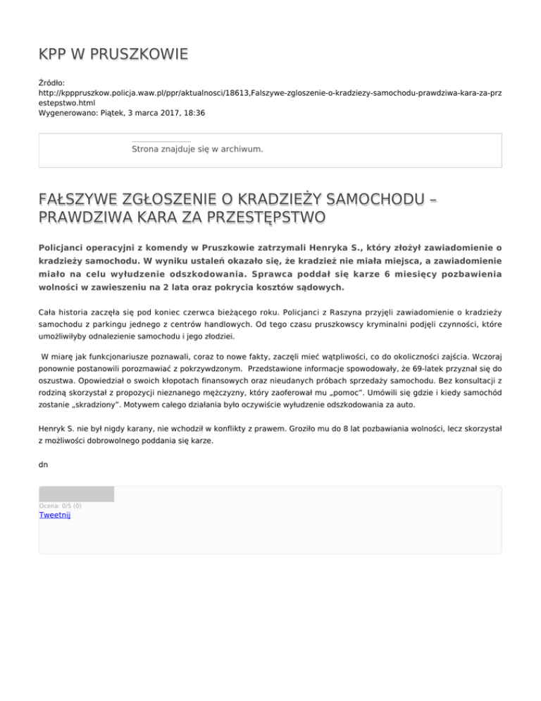 KPP W PRUSZKOWIE Źródło: http://kpppruszkow.policja.waw.pl/ppr/aktualnosci/18613,Falszywe-zgloszenie-o-kradziezy-samochodu-prawdziwa-kara-za-prz estepstwo.html Wygenerowano: Piątek, 3 marca 2017, 18:36 Strona znajduje się w archiwum. FAŁSZYWE ZGŁOSZENIE O KRADZIEŻY SAMOCHODU – PRAWDZIWA KARA ZA PRZESTĘPSTWO Policjanci operacyjni z komendy w Pruszkowie zatrzymali Henryka S., który złożył zawiadomienie o kradzieży samochodu. W wyniku ustaleń okazało się, że kradzież nie miała miejsca, a zawiadomienie miało na celu wyłudzenie odszkodowania. Sprawca poddał się karze 6 miesięcy pozbawienia wolności w zawieszeniu na 2 lata oraz pokrycia kosztów sądowych. Cała historia zaczęła się pod koniec czerwca bieżącego roku. Policjanci z Raszyna przyjęli zawiadomienie o kradzieży samochodu z parkingu jednego z centrów handlowych. Od tego czasu pruszkowscy kryminalni podjęli czynności, które umożliwiłyby odnalezienie samochodu i jego złodziei. W miarę jak funkcjonariusze poznawali, coraz to nowe fakty, zaczęli mieć wątpliwości, co do okoliczności zajścia. Wczoraj ponownie postanowili porozmawiać z pokrzywdzonym. Przedstawione informacje spowodowały, że 69-latek przyznał się do oszustwa. Opowiedział o swoich kłopotach finansowych oraz nieudanych próbach sprzedaży samochodu. Bez konsultacji z rodziną skorzystał z propozycji nieznanego mężczyzny, który zaoferował mu „pomoc”. Umówili się gdzie i kiedy samochód zostanie „skradziony”. Motywem całego działania było oczywiście wyłudzenie odszkodowania za auto. Henryk S. nie był nigdy karany, nie wchodził w konflikty z prawem. Groziło mu do 8 lat pozbawiania wolności, lecz skorzystał z możliwości dobrowolnego poddania się karze. dn Ocena: 0/5 (0) Tweetnij