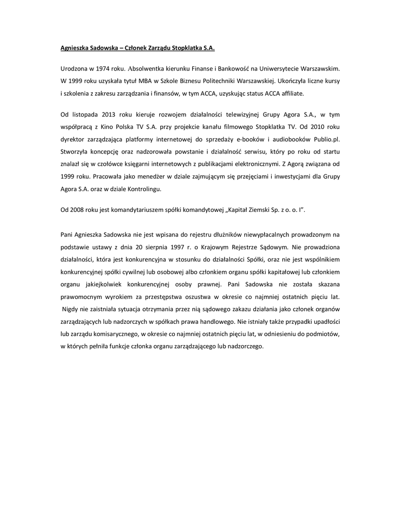 Agnieszka Sadowska – Członek Zarządu Stopklatka S.A. Urodzona w 1974 roku. Absolwentka kierunku Finanse i Bankowość na Uniwersytecie Warszawskim. W 1999 roku uzyskała tytuł MBA w Szkole Biznesu Politechniki Warszawskiej. Ukończyła liczne kursy i szkolenia z zakresu zarządzania i finansów, w tym ACCA, uzyskując status ACCA affiliate. Od listopada 2013 roku kieruje rozwojem działalności telewizyjnej Grupy Agora S.A., w tym współpracą z Kino Polska TV S.A. przy projekcie kanału filmowego Stopklatka TV. Od 2010 roku dyrektor zarządzająca platformy internetowej do sprzedaży e-booków i audiobooków Publio.pl. Stworzyła koncepcję oraz nadzorowała powstanie i działalność serwisu, który po roku od startu znalazł się w czołówce księgarni internetowych z publikacjami elektronicznymi. Z Agorą związana od 1999 roku. Pracowała jako menedżer w dziale zajmującym się przejęciami i inwestycjami dla Grupy Agora S.A. oraz w dziale Kontrolingu. Od 2008 roku jest komandytariuszem spółki komandytowej „Kapitał Ziemski Sp. z o. o. I”. Pani Agnieszka Sadowska nie jest wpisana do rejestru dłużników niewypłacalnych prowadzonym na podstawie ustawy z dnia 20 sierpnia 1997 r. o Krajowym Rejestrze Sądowym. Nie prowadziona działalności, która jest konkurencyjna w stosunku do działalności Spółki, oraz nie jest wspólnikiem konkurencyjnej spółki cywilnej lub osobowej albo członkiem organu spółki kapitałowej lub członkiem organu jakiejkolwiek konkurencyjnej osoby prawnej. Pani Sadowska nie została skazana prawomocnym wyrokiem za przestępstwa oszustwa w okresie co najmniej ostatnich pięciu lat. Nigdy nie zaistniała sytuacja otrzymania przez nią sądowego zakazu działania jako członek organów zarządzających lub nadzorczych w spółkach prawa handlowego. Nie istniały także przypadki upadłości lub zarządu komisarycznego, w okresie co najmniej ostatnich pięciu lat, w odniesieniu do podmiotów, w których pełniła funkcje członka organu zarządzającego lub nadzorczego.