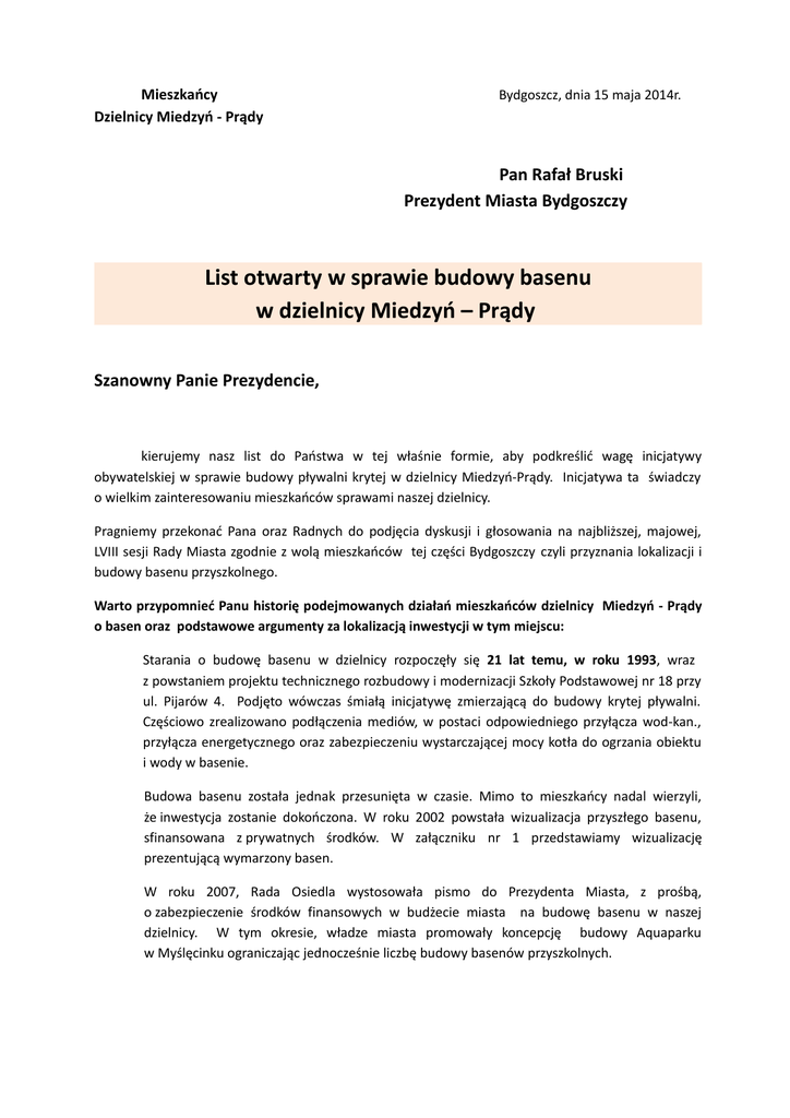 Mieszkańcy Dzielnicy Miedzyń - Prądy Bydgoszcz, dnia 15 maja 2014r. Pan Rafał Bruski Prezydent Miasta Bydgoszczy List otwarty w sprawie budowy basenu w dzielnicy Miedzyń – Prądy Szanowny Panie Prezydencie, kierujemy nasz list do Państwa w tej właśnie formie, aby podkreślić wagę inicjatywy obywatelskiej w sprawie budowy pływalni krytej w dzielnicy Miedzyń-Prądy. Inicjatywa ta świadczy o wielkim zainteresowaniu mieszkańców sprawami naszej dzielnicy. Pragniemy przekonać Pana oraz Radnych do podjęcia dyskusji i głosowania na najbliższej, majowej, LVIII sesji Rady Miasta zgodnie z wolą mieszkańców tej części Bydgoszczy czyli przyznania lokalizacji i budowy basenu przyszkolnego. Warto przypomnieć Panu historię podejmowanych działań mieszkańców dzielnicy Miedzyń - Prądy o basen oraz podstawowe argumenty za lokalizacją inwestycji w tym miejscu: Starania o budowę basenu w dzielnicy rozpoczęły się 21 lat temu, w roku 1993, wraz z powstaniem projektu technicznego rozbudowy i modernizacji Szkoły Podstawowej nr 18 przy ul. Pijarów 4. Podjęto wówczas śmiałą inicjatywę zmierzającą do budowy krytej pływalni. Częściowo zrealizowano podłączenia mediów, w postaci odpowiedniego przyłącza wod-kan., przyłącza energetycznego oraz zabezpieczeniu wystarczającej mocy kotła do ogrzania obiektu i wody w basenie. Budowa basenu została jednak przesunięta w czasie. Mimo to mieszkańcy nadal wierzyli, że inwestycja zostanie dokończona. W roku 2002 powstała wizualizacja przyszłego basenu, sfinansowana z prywatnych środków. W załączniku nr 1 przedstawiamy wizualizację prezentującą wymarzony basen. W roku 2007, Rada Osiedla wystosowała pismo do Prezydenta Miasta, z prośbą, o zabezpieczenie środków finansowych w budżecie miasta na budowę basenu w naszej dzielnicy. W tym okresie, władze miasta promowały koncepcję budowy Aquaparku w Myślęcinku ograniczając jednocześnie liczbę budowy basenów przyszkolnych. W obecnym roku, powstała Inicjatywa Obywatelska „Basen na Miedzyniu”, która przy pozytywnej opinii Rady Osiedla, w bardzo krótkim czasie zyskała poparcie: 4 276 pełnoletnich mieszkańców dzielnicy Miedzyń - Prądy co stanowi ok. 35% naszej społeczności! Należy tutaj wspomnieć, że gdyby podpisy pod petycją w sprawie budowy basenu składały również dzieci i młodzież – któż jak nie one bardziej pragną korzystać z basenu – wówczas poparcie dla tej inicjatywy wyniosłoby: 5 811 osób, a to odpowiadałoby ok. 50% naszej społeczności! Całkowita liczba dzieci i młodzieży ucząca się w szkołach i przedszkolach umiejscowionych w dzielnicy Miedzyń - Prądy to 1 535 osób. W Zespole Szkół nr 8 przy ul. Pijarów uczą się również osoby niepełnosprawne. Dla nich możliwość korzystania z takiej formy rehabilitacji byłaby nie do przecenienia. Przypomnieć należy, że łącznie dzielnice Miedzyń i Prądy liczy obecnie 12 180 osób, co plasuje nas pod względem liczby mieszkańców na 10 miejscu pośród wszystkich 41 dzielnic Bydgoszczy. Mamy świadomość, że siatka zbudowanych dotychczas basenów jest odzwierciedleniem mądrej polityki Miasta, tzn. usytuowania ich w miejscach, gdzie liczba mieszkańców jest największa: Dzielnica Liczba mieszkańców Liczba krytych pływalni 1. Fordon 69,71 tys. 4 baseny: “Ikar”, ZS nr 5, “Bajka”, Centrum Onkologii 2. Wyżyny 28,90 tys. „Perła” 3. Szwederowo 31,16 tys. „Bryza” 4. Kapuściska 23,46 tys. brak, (bliska lokalizacja basenów: „Laguna” i „Perła”) 5. Śródmieście 21,35 tys. basen w Pałacu Młodzieży 6. Bartodzieje 24,09 tys. 2 baseny: w Z.S. Medycznych, basen KS Polonia 7. Błonie 15,38 tys. trwa budowa basenu 8. Osowa Góra 14,04 tys. „Sardynka” 9. Bocianowo 11,82 tys. KS Astoria 10. MiedzyńPrądy 11, 53 tys. i Prądy 0,65 tys., łącznie 12,18 tys. Brak Lp. Potencjalna liczba mieszkańców Bydgoszczy i okolic, która skorzystałaby na lokalizacji basenu w dzielnicy Miedzyń - Prądy, to łącznie ok. 38 300 osób. To mieszkańcy, którzy zapewnią, że basen będzie w pełni wykorzystany, a ryzyko obciążenia budżetu Miasta będzie znikome. Wyliczenia przedstawiliśmy w naszej petycji, przekazanej Państwu w dniu 18 marca 2014 r. Szanowny Panie Prezydencie, podczas rozmów m.in. z przedstawicielami Rady Miasta, usłyszeliśmy twierdzenia, że „budowany jest przecież nieopodal basen na Błoniu”, „Czyżkówko również stara się o basen”. Prosimy w tym miejscu aby spojrzał Pan na schemat sieci komunikacyjnej naszego miasta. Przekona się Pan, że jedyna na osiedlu linia autobusowa nr 56 oraz problemy komunikacyjne ulicy Nakielskiej, łączącej dzielnicę z centrum, nie ułatwiają mieszkańcom dzielnicy Miedzyń - Prądy korzystania z pływalni w tych częściach miasta. To tylko pozorna bliskość tych lokalizacji, a nie rozwiązanie problemu. Pragniemy zwrócić uwagę na fakt, że nasze dzielnice są mocno niedoinwestowanie. Wieloletnie zaniedbania powodują, że najmłodsi mieszkańcy - poza przyszkolnymi placami zabaw i jednym orlikiem - nie mogą korzystać z innych form spędzania wolnego czasu. Nieformalnym miejscem spotkań młodzieży staje się parking marketu. Brakuje np. domu kultury, skateparku, ścieżek rowerowych, placów zabaw w innych częściach dzielnicy oraz miejsc gdzie młodzi i starsi mieszkańcy mogliby spędzać pożytecznie i bezpiecznie czas. Wierzymy, że wybrany przez społeczeństwo dzielnicy Miedzyń – Prądy, Prezydent Miasta wraz z Radnymi, uwzględnią wolę mieszkańców i podejmą, oczekiwaną przez kilkanaście tysięcy obywateli, decyzję o przyznaniu lokalizacji i budowie basenu w dzielnicy Miedzyń - Prądy, doceniając tym samym społeczne zaangażowanie tej społeczności. W imieniu mieszkańców dzielnicy Miedzyń – Prądy: Bydgoskie Stowarzyszenie Miedzyń i Prądy Stowarzyszenie „Dla Bydgoszczy!” Rada Osiedla Miedzyń – Prądy Załącznik: nr 1 Wizu