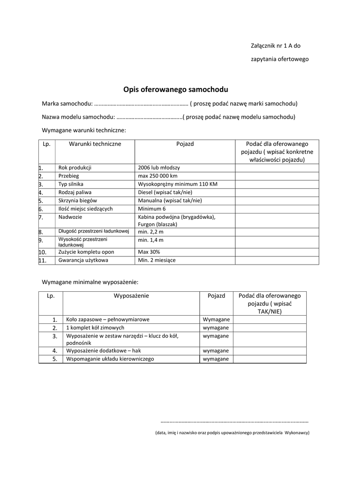 Załącznik nr 1 A do zapytania ofertowego Opis oferowanego samochodu Marka samochodu: ……………………………………………………… ( proszę podać nazwę marki samochodu) Nazwa modelu samochodu: ……………………………………..( proszę podać nazwę modelu samochodu) Wymagane warunki techniczne: Lp. Warunki techniczne 1. 2. 3. 4. 5. 6. 7. Rok produkcji Przebieg Typ silnika Rodzaj paliwa Skrzynia biegów Ilość miejsc siedzących Nadwozie 8. 9. Długość przestrzeni ładunkowej 10. 11. Zużycie kompletu opon Gwarancja użytkowa Wysokość przestrzeni ładunkowej Pojazd Podać dla oferowanego pojazdu ( wpisać konkretne właściwości pojazdu) 2006 lub młodszy max 250 000 km Wysokoprężny minimum 110 KM Diesel (wpisać tak/nie) Manualna (wpisać tak/nie) Minimum 6 Kabina podwójna (brygadówka), Furgon (blaszak) min. 2,2 m min. 1,4 m Max 30% Min. 2 miesiące Wymagane minimalne wyposażenie: Lp. 1. 2. 3. 4. 5. Wyposażenie Pojazd Koło zapasowe – pełnowymiarowe 1 komplet kół zimowych Wyposażenie w zestaw narzędzi – klucz do kół, podnośnik Wyposażenie dodatkowe – hak Wspomaganie układu kierowniczego Podać dla oferowanego pojazdu ( wpisać TAK/NIE) Wymagane wymagane wymagane wymagane wymagane ……………………………………………………………………………………… (data, imię i nazwisko oraz podpis upoważnionego przedstawiciela Wykonawcy)