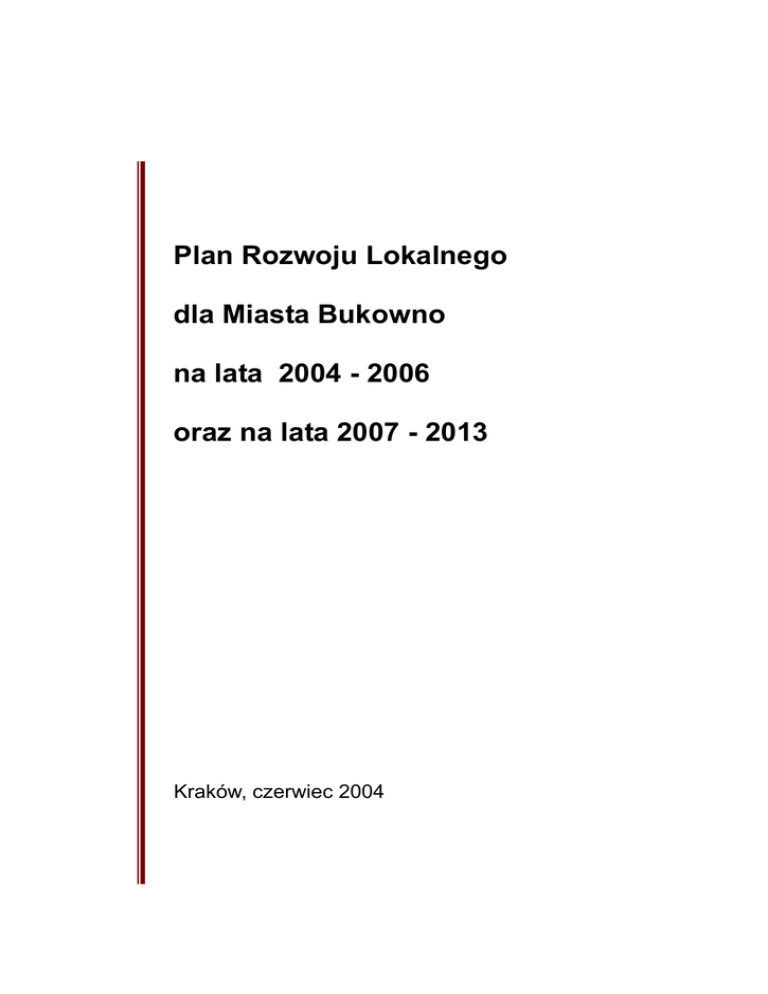 Plan Rozwoju Lokalnego dla Miasta Bukowno na lata 2004 - 2006 oraz na lata 2007 - 2013 Kraków, czerwiec 2004 Plan Rozwoju Lokalnego na lata 2004-2013 dla Miasta Bukowno 2 Opracowany przez: mgr inż. MBA Janusz Kusch mgr inż. Marek Darłak mgr inż. Sylwia Kot Akordbud-Consulting sp. z o.o. w Krakowie Plan Rozwoju Lokalnego na lata 2004-2013 dla Miasta Bukowno 3 Spis treści 1. AKTUALNA SYTUACJA SPOŁECZNO-GOSPODARCZA NA OBSZARZE OBJĘTYM WDRAŻANIEM PLANU ..................................................................................................................................... 6 1.1. POŁOŻENIE, POWIERZCHNIA, LUDNOŚĆ .................................................................................................. 6 1.2. RYNEK PRACY I BEZROBOCIE ................................................................................................................. 7 1.3. KULTURA, OŚWIATA I SPORT .................................................................................................................. 8 1.3.1 KULTURA ......................................................................................................................................... 8 1.3.2 SPORT ............................................................................................................................................... 8 1.3.3 OŚWIATA .......................................................................................................................................... 9 1.4. OCHRONA ZDROWIA ............................................................................................................................. 11 1.5. BEZPIECZEŃSTWO PUBLICZNE .............................................................................................................. 12 1.6. OCHRONA PRZECIWPOŻAROWA ............................................................................................................ 12 1.7. SFERA GOSPODARCZA .......................................................................................................................... 12 1.8. STRUKTURA MAŁYCH I ŚREDNICH FIRM W GMINIE BUKOWNO: ............................................................ 14 1.9. ROLNICTWO W BUKOWNIE: ................................................................................................................. 16 1.10. ŚRODOWISKO PRZYRODNICZE .............................................................................................................. 18 1.11. TURYSTYKA ......................................................................................................................................... 19 1.12. INFRASTRUKTURA ................................................................................................................................ 20 1.12.1 SIEĆ WODOCIĄGOWA ............................................................................................................. 20 1.12.2 SIEĆ KANALIZACYJNA ............................................................................................................. 20 1.12.3 GOSPODARKA ODPADAMI ..................................................................................................... 20 1.12.4 ENERGIA ELEKTRYCZNA ........................................................................................................ 21 1.12.5 SIEĆ GAZOWA ........................................................................................................................... 21 1.12.6 SIEĆ TELEKOMUNIKACYJNA ................................................................................................. 21 1.12.7 UKŁAD DROGOWY ................................................................................................................... 21 1.12.8 KOMUNIKACJA ZBIOROWA .................................................................................................... 21 1.13. ANALIZA .............................................................................................................................................. 23 1.13.1 Finanse gminy ............................................................................................................................. 23 1.13.2 Budżet gminy 2003 ...................................................................................................................... 23 1.13.3 Budżet gminy 2004 ...................................................................................................................... 24 1.13.4 Finanse publiczne w 2004 roku .................................................................................................. 24 1.13.5 Przewidywany budżet na lata 2004 – 2006 ................................................................................ 24 1.13.6 Mienie gminy .............................................................................................................................. 25 1.13.7 Lokale Socjalne ........................................................................................................................... 27 2. STRATEGICZNE CELE ROZWOJU GMINY BUKOWNO ............................................................... 29 3. CELE OPERACYJNE ............................................................................................................................... 30 Akordbud-Consulting sp. z o.o. w Krakowie Plan Rozwoju Lokalnego na lata 2004-2013 dla Miasta Bukowno 4 4. ZADANIA REALIZACYJNE ................................................................................................................... 32 5. KATALOG ZADAŃ REALIZACYJNYCH ............................................................................................ 33 5.1. CEL OPERACYJNY CO1:........................................................................................................................ 33 5.2. CEL OPERACYJNY CO2:.........................................................................................................