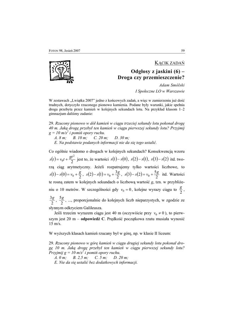 FOTON 98, Jesień 2007 59 KĄCIK ZADAŃ Odgłosy z jaskini (6) – Droga czy przemieszczenie? Adam Smólski I Społeczne LO w Warszawie W zestawach „Lwiątka 2007” jedno z końcowych zadań, a więc w zamierzeniu już dość trudnych, dotyczyło rzuconego pionowo kamienia. Podane były warunki, jakie spełnia droga przebyta przez kamień w kolejnych sekundach lotu. Na przykład klasom 1–2 gimnazjum daliśmy zadanie: 29. Rzucony pionowo w dół kamień w ciągu trzeciej sekundy lotu pokonał drogę 40 m. Jaką drogę przebył ten kamień w ciągu pierwszej sekundy lotu? Przyjmij g = 10 m/s2 i pomiń opory ruchu. A. 8 m; B. 10 m; C. 20 m; D. 30 m; E. Na podstawie podanych informacji nie da się tego ustalić. Co ogólnie wiadomo o drogach w kolejnych sekundach? Konsekwencją wzoru gt 2 jest to, że wartości s (1) − s (0 ) , s (2 ) − s (1) , s (3) − s (2 ) itd. twos (t ) = v0t + 2 rzą ciąg arytmetyczny. Jeżeli rozpatrujemy tylko wartości liczbowe, to 3g 5g g , s (3) − s (2 ) = v0 + itd. Wartości s (1) − s (0 ) = v0 + , s (2 ) − s (1) = v0 + 2 2 2 te rosną zatem w kolejnych sekundach o liczbową wartość g, tzn. w przybliżeg niu o 10 metrów. W szczególności gdy v0 = 0 , kolejne wyrazy ciągu to , 2 3g 5g , , ..., proporcjonalnie do kolejnych liczb nieparzystych, w zgodzie ze 2 2 słynnym odkryciem Galileusza. Jeśli trzecim wyrazem ciągu jest 40 m (oczywiście przy v0 ≠ 0 ), to pierwszym jest 20 m – odpowiedź C. Prędkość początkowa rzutu musiała wynosić 15 m/s. W wyższych klasach kamień rzucany był w górę, np. w klasie II liceum: 29. Rzucony pionowo w górę kamień w ciągu drugiej sekundy lotu pokonał drogę 10 m. Jaką drogę przebył ten kamień w ciągu pierwszej sekundy lotu? Przyjmij g = 10 m/s2 i pomiń opory ruchu. A. 0 m; B. 2,5 m; C. 5 m; D. 20 m; E. Nie da się ustalić bez dodatkowych informacji. 60 FOTON 98, Jesień 2007 Wspomniana wyżej zasada ciągu arytmetycznego o różnicy 10 daje się i tutaj zastosować. W drugiej sekundzie 10 m, to w pierwszej zero.... Zaraz, droga zero przy niewątpliwym ruchu? Nie droga, przemieszczenie! W ruchu, w którym gt 2 możliwe jest zawracanie, wzór s (t ) = v0t + nie jest wzorem na drogę rozu2 mianą tak, jak to tradycyjnie wykładamy w szkole. To wzór na przemieszczenie (liczone od chwili 0) lub jak kto woli na współrzędną położenia na pionowej osi współrzędnych, zwróconej w dół. Przemieszczenie zero podczas pierwszej sekundy ruchu oznacza, że punkt największego wzniesienia nastąpił w połowie tej pierwszej sekundy. W ciągu pierwszej połowy tej sekundy kamień przeleciałby 1,25 m w górę, a w ciągu drugiej 1,25 m w dół, droga wyniosłaby zatem 2,5 m. Ale to cały czas nie jest poprawna odpowiedź. Podana droga 10 m w ciągu drugiej sekundy może oznaczać przemieszczenie minus 10 metrów, czyli lot 10 m jeszcze cały czas pod górę. Wtedy w pierwszej sekundzie byłoby minus 20 metrów czyli 20 m pod górę, przy prędkości początkowej 25 m/s. Wybieramy w takim razie odpowiedź E. Tak w zacytowanych dwóch jak i w pozostałych trzech zadaniach tej „serii” zadbaliśmy o to, by konflikt „droga czy przemieszczenie” nie utrudniał rozwiązania, bo gdyby zamiast „pokonał drogę” powiedzieć „przemieścił się o”, niczego by to nie zmieniło. Że konflikt realnie zagraża, przekonali nas recenzenci, którzy oprotestowali poniższe zadanie, szykowane wstępnie do zestawu dla I klasy liceum: 29. Rzucony pionowo w górę kamień w ciągu drugiej sekundy lotu pokonał drogę 2,5 m. Jaką drogę przebył ten kamień w ciągu pierwszej sekundy lotu? Przyjmij g = 10 m/s2 i pomiń opory ruchu. A. 15 m; B. 10 m; C. 7,5 m; D. 5 m; E. Dane są sprzeczne. Zauważmy, że przy locie wyłącznie w górę lub wyłącznie w dół nie jest możliwe przebycie w ciągu jednej sekundy drogi mniejszej niż 5 m. Tyle wynigt 2 na wartość przemieszczenia podczas spadku bez prędkości ka ze wzoru 2 początkowej (możemy stosować ten wzór także dla rzutu w górę, rozpatrywanego „wstecz w czasie”). Oznacza to, że kamień osiągnął maksymalne wzniesienie w ciągu drugiej sekundy lotu. Rozróżnienie droga–przemieszczenie ma teraz zasadniczy wpływ na rozumienie zadania. Nam oczywiście chodziło o drogę w sensie używanym powszechnie, jak się zdaje, w nauczaniu szkolnym. Recenzenci jednak nie byli przekonani co do jednoznaczności tego terminu. FOTON 98, Jesień 2007 61 Rozwiążmy nasze zadanie do końca. Zauważyliśmy już wyżej, że 2,5 m to gt 2 dla t = 0,5 s. Zatem momentem akurat dwa razy 1,25 m, co jest wartością 2 maksymalnego wzniesienia kamienia była połowa drugiej sekundy lotu: hh,[m] m 11,25 10 5 tt,[s]s 1 1,5 2 3 gt 2 2 dla t = 1,5 s i t = 0,5 s. Ta różnica wynosi 10 m. Odpowiedź B. Warto przy okazji zauważyć, że 2,5 m to minimalna wartość drogi, jaką pionowo rzucone ciało może przybyć w ciągu jednej sekundy. Jeśli ktoś nie zauważył od razu owego szczególnego układu danych, musiał rozwiązać układ równań Droga przebyta w ciągu pierwszej sekundy to zatem różnica wartości tg + td = 1 s , gt 2 2 g + gt d = 2,5 m 2 2 gdzie tg, td oznaczają części drugiej sekundy odpowiadające ruchowi „jeszcze” w górę i „już” w dół. Tak czy owak, wychodzi tg = td = 0,5 s. W zadaniu należało zatem koniecznie odróżnić drogę jako długość śladu od wartości przemieszczenia, czyli odległości pomiędzy punktem początkowym a końcowym danej fazy ruchu. Zauważmy, że nawet popularne określenie drogi jako „długości toru” jest nieprecyzyjne i wymaga właściwego rozumienia, bo przecież gdy ciało robi dwa okrążenia kołowego toru o promieniu r, to droga wynosi 4πr, a długość toru 2πr. 62 FOTON 98, Jesień 2007 Wracając do naszego zadania, próbowaliśmy (bezskutecznie) przebłagać naszych recenzentów dodatkiem „Uwaga: pojęcia drogi i przemieszczenia należy odróżnić”. Ale tak naprawdę istnia