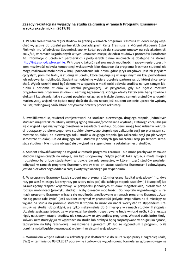 Zasady rekrutacji na wyjazdy na studia za granicą w ramach Programu Erasmus+ w roku akademickim 2017/18 1. W celu zrealizowania części studiów za granicą w ramach programu Erasmus+ studenci mogą wyjechać wyłącznie do uczelni partnerskich posiadających Kartę Erasmusa, z którymi Akademia Sztuk Pięknych im. Władysława Strzemińskiego w Łodzi podpisała stosowne umowy na rok akademicki 2017/18, w ramach uzgodnionych w tych umowach miejsc, dziedzin studiów i poziomów kształcenia itd. Informacje o uczelniach partnerskich i podpisanych z nimi umowach są dostępne na stronie: http://int.asp.lodz.pl/uczelnie. W trosce o jakość realizowanych mobilności i zapewnienie uczestnikom możliwości nabycia kompetencji wskazanych jako kluczowe dla programu Erasmus+ studenci nie mogą realizować mobilności w kraju pochodzenia lub innym, gdzie język urzędowy jest ich językiem ojczystym, pomimo faktu, iż studiują w uczelni, która znajduje się w kraju innym niż kraj pochodzenia lub odbywania mobilności. Student samodzielnie wybiera uczelnię partnerską, do której chce wyjechać. Wybór uczelni musi być dokonany w oparciu o możliwość odbycia studiów na tym samym kierunku i poziomie studiów w uczelni przyjmującej. W przypadku, gdy nie będzie możliwe przygotowanie programu studiów (Learning Agreement), którego efekty kształcenia będą zbieżne z efektami kształcenia, jakie student powinien osiągnąć w trakcie danego semestru studiów w uczelni macierzystej, wyjazd nie będzie mógł dojść do skutku nawet jeśli student zostanie uprzednio wpisany na listę rankingową osób, które pozytywnie przeszły proces rekrutacji. 2. Kwalifikowani są studenci zarejestrowani na studiach pierwszego, drugiego stopnia, jednolitych studiach magisterskich, którzy uzyskają zgodę dziekana/prodziekana wydziału, z którego chcą ubiegać się o wyjazd i spełnią wymogi określone w zasadach rekrutacji. Studenci mogą brać udział w rekrutacji począwszy od pierwszego roku studiów pierwszego stopnia (po zaliczeniu sesji po pierwszym semestrze studiów), od pierwszego roku studiów drugiego stopnia (po zaliczeniu sesji po pierwszym semestrze studiów) lub od drugiego roku studiów jednolitych (po zaliczeniu sesji po trzecim semestrze studiów). Nie można ubiegać się o wyjazd na stypendium na ostatni semestr studiów. 3. Student zakwalifikowany na wyjazd w ramach programu Erasmus+ nie może przebywać w trakcie studiów zagranicznych na urlopie, ani być urlopowany. Gdyby jednak taka sytuacja miała miejsce i udzielono by urlopu studentowi, w trakcie trwania semestru, w którym część studiów powinien odbywać w ramach programu Erasmus+, wtedy traci on status studenta Erasmusa+ i zobowiązany jest do niezwłocznego oddania całej kwoty wypłaconego już stypendium. 4. W programie Erasmus+ każdy student ma przyznany 12-miesięczny ‘kapitał wyjazdowy’ (np. dwa razy po sześć miesięcy lub trzy razy po cztery miesiące) dla każdego stopnia studiów (I i II stopień) lub 24-miesięczny ‘kapitał wyjazdowy’ w przypadku jednolitych studiów magisterskich, niezależnie od rodzaju mobilności (praktyki, studia) i liczby okresów mobilności. Do ‘kapitału wyjazdowego’ w ramach programu Erasmus+ wliczają się mobilności zrealizowane w ramach programu Erasmus „Uczenie się przez całe życie” (jeśli student otrzymał w przeszłości jedynie stypendium na 6 miesięcy na wyjazd na studia na poziomie studiów II stopnia to może on nadal skorzystać ze stypendium Erasmus+ na studia lub praktyki, ale tylko maksymalnie do 6 miesięcy w ramach studiów II stopnia). Uczelnia zastrzega jednak, że w pierwszej kolejności rozpatrywane będą wnioski osób, które jeszcze nigdy na żadnym etapie studiów nie skorzystały ze stypendiów programu. Wnioski osób, które kiedykolwiek uczestniczyły już w wyjazdach na studia lub praktyki będą rozpatrywane w drugiej kolejności, zapisywane na listę rezerwową i realizowane z grantem „0” lub ze stypendium z programu o ile uczelnia nadal będzie dysponować wolnymi miejscami wyjazdowymi. 5. Warunkiem wzięcia udziału w rekrutacji jest dostarczenie do Biura Współpracy z Zagranicą (dalej BWZ) w terminie do 03.03.2017 poprawnie i całkowicie wypełnionego formularza zgłoszeniowego na 1 rok 2017/2018 (załącznik 1) wraz z jego integralną częścią: zaświadczeniem pracownika dziekanatu z opinią dziekana/prodziekana (załącznik nr 2) oraz portfolio w wersji drukowanej przygotowanego w odpowiednich wersjach językowych i zapis dokładnie tego samego portfolio w wersji cyfrowej na płycie CD. Rekrutacja będzie odbywała się do 03.03.2017. Dokumenty należy składać w BWZ od 27.02.2017 do 03.03.2017 w godzinach 9.00-11.00 i 13.00-14.00, we wszystkie dni pracujące poza środami. Lista rankingowa kandydatów będzie opublikowana na stronie internetowej BWZ (www.int.asp.lodz.pl) nie później niż do dnia 07.04.2017. Za prawidłowe i kompletne złożenie dokumentacji odpowiada student uczestniczący w rekrutacji i zobowiązany jest do sprawdzenia i upewnienia się, że składa prawidłowo przygotowaną dokumentację. Dokumenty przygotowane na niewłaściwych formularzach (innych niż te przygotowane dla rekrutacji na rok 2017/18) zostaną odrzucone ze względów formalnych i nie będą podlegały ocenie. Uczelnia zastrzega sobie prawo do wyznaczania kolejnych terminów rekrutacji, która każdorazowo prowadzona będzie w oparciu o te same zasady. 6. Kryteria oceny zgłoszeń kandydatów to: – poprawnie przygotowane wszystkie dokumenty wymagane do rekrutacji, czytelnie wypełnione wszystkie pola formularza, bez skreśleń i korekt uniemożliwiających jednoznaczne odczytanie zamieszczonych informacji; – średnia ocen za ostatni semestr bezpośrednio poprzedzający rekrutację do programu Erasmus+ (semestr studiów tego samego stopnia, na którym jest student w momencie udziału w rekrutacji); o udział w progra