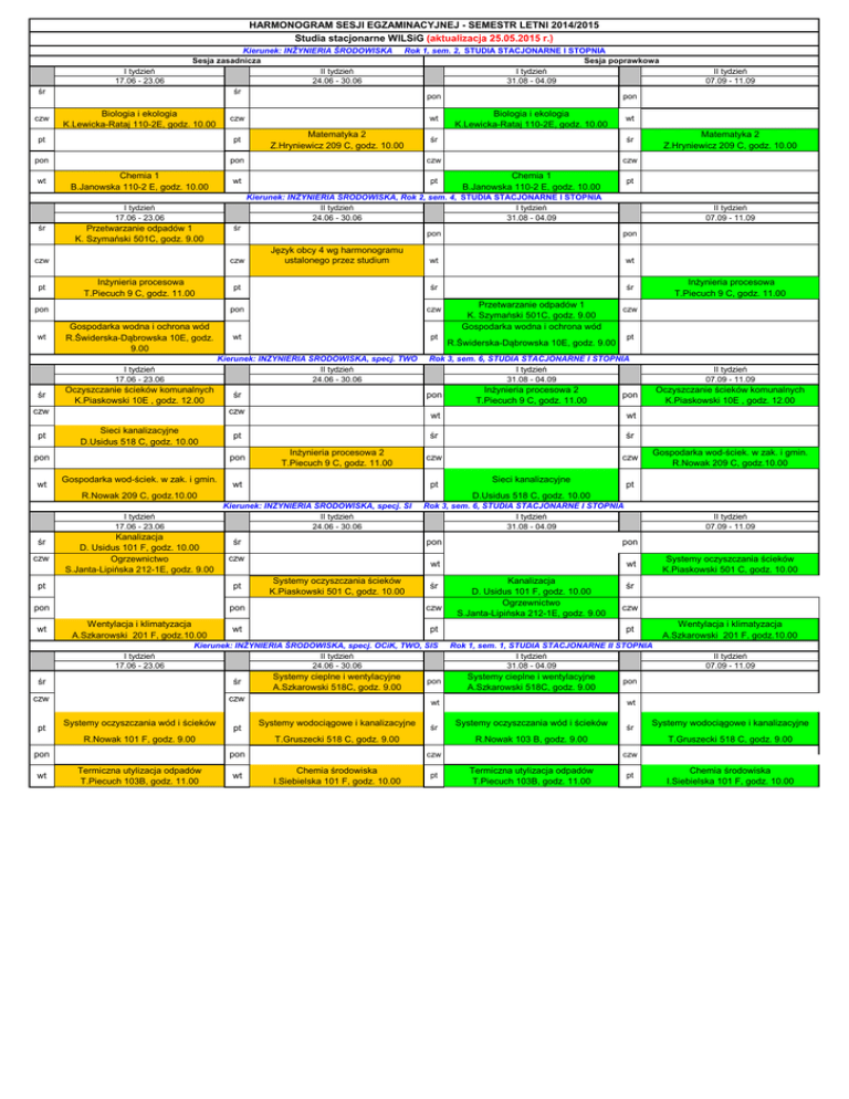 HARMONOGRAM SESJI EGZAMINACYJNEJ - SEMESTR LETNI 2014/2015 Studia stacjonarne WILSiG (aktualizacja 25.05.2015 r.) I tydzień 17.06 - 23.06 śr czw Kierunek: INŻYNIERIA ŚRODOWISKA Sesja zasadnicza II tydzień 24.06 - 30.06 śr Biologia i ekologia K.Lewicka-Rataj 110-2E, godz. 10.00 pt czw pt Chemia 1 B.Janowska 110-2 E, godz. 10.00 Przetwarzanie odpadów 1 K. Szymański 501C, godz. 9.00 Inżynieria procesowa T.Piecuch 9 C, godz. 11.00 Gospodarka wodna i ochrona wód R.Świderska-Dąbrowska 10E, godz. 9.00 Oczyszczanie ścieków komunalnych K.Piaskowski 10E , godz. 12.00 czw pt Sieci kanalizacyjne D.Usidus 518 C, godz. 10.00 pon wt Gospodarka wod-ściek. w zak. i gmin. wt pt śr śr pon czw wt pt pt wt Wentylacja i klimatyzacja A.Szkarowski 201 F, godz.10.00 I tydzień 17.06 - 23.06 Rok 3, sem. 6, STUDIA STACJONARNE I STOPNIA I tydzień 31.08 - 04.09 II tydzień 07.09 - 11.09 Inżynieria procesowa 2 T.Piecuch 9 C, godz. 11.00 Oczyszczanie ścieków komunalnych K.Piaskowski 10E , godz. 12.00 wt wt śr śr czw czw Inżynieria procesowa 2 T.Piecuch 9 C, godz. 11.00 wt pt śr czw Systemy oczyszczania ścieków K.Piaskowski 501 C, godz. 10.00 wt wt śr wt pt czw pt R.Nowak 101 F, godz. 9.00 Systemy cieplne i wentylacyjne A.Szkarowski 518C, godz. 9.00 śr T.Gruszecki 518 C, godz. 9.00 pon Termiczna utylizacja odpadów T.Piecuch 103B, godz. 11.00 pon wt Kanalizacja D. Usidus 101 F, godz. 10.00 Ogrzewnictwo S.Janta-Lipińska 212-1E, godz. 9.00 śr czw Systemy cieplne i wentylacyjne A.Szkarowski 518C, godz. 9.00 II tydzień 07.09 - 11.09 pon wt Systemy oczyszczania wód i ścieków śr R.Nowak 103 B, godz. 9.00 pt Wentylacja i klimatyzacja A.Szkarowski 201 F, godz.10.00 Rok 1, sem. 1, STUDIA STACJONARNE II STOPNIA I tydzień 31.08 - 04.09 czw Chemia środowiska I.Siebielska 101 F, godz. 10.00 Systemy oczyszczania ścieków K.Piaskowski 501 C, godz. 10.00 pt wt Systemy wodociągowe i kanalizacyjne II tydzień 07.09 - 11.09 pon czw czw wt pt pon pon śr pon Sieci kanalizacyjne Gospodarka wod-ściek. w zak. i gmin. R.Nowak 209 C, godz.10.00 Rok 3, sem. 6, STUDIA STACJONARNE I STOPNIA I tydzień 31.08 - 04.09 Kierunek: INŻYNIERIA ŚRODOWISKA, specj. OCiK, TWO, SIS II tydzień 24.06 - 30.06 Systemy oczyszczania wód i ścieków pon D.Usidus 518 C, godz. 10.00 śr pt pt R.Świderska-Dąbrowska 10E, godz. 9.00 czw pt Inżynieria procesowa T.Piecuch 9 C, godz. 11.00 czw pon pt pon Przetwarzanie odpadów 1 K. Szymański 501C, godz. 9.00 Gospodarka wodna i ochrona wód śr Kierunek: INŻYNIERIA ŚRODOWISKA, specj. SI II tydzień 24.06 - 30.06 Kanalizacja D. Usidus 101 F, godz. 10.00 Ogrzewnictwo S.Janta-Lipińska 212-1E, godz. 9.00 II tydzień 07.09 - 11.09 wt pon I tydzień 17.06 - 23.06 czw pt pon R.Nowak 209 C, godz.10.00 śr czw Chemia 1 B.Janowska 110-2 E, godz. 10.00 pon Język obcy 4 wg harmonogramu ustalonego przez studium Kierunek: INŻYNIERIA ŚRODOWISKA, specj. TWO II tydzień 24.06 - 30.06 I tydzień 17.06 - 23.06 śr śr czw pon wt Matematyka 2 Z.Hryniewicz 209 C, godz. 10.00 śr Kierunek: INŻYNIERIA ŚRODOWISKA, Rok 2, sem. 4, STUDIA STACJONARNE I STOPNIA II tydzień I tydzień 24.06 - 30.06 31.08 - 04.09 czw pt wt śr pt II tydzień 07.09 - 11.09 pon Biologia i ekologia K.Lewicka-Rataj 110-2E, godz. 10.00 czw wt I tydzień 17.06 - 23.06 śr pon wt Matematyka 2 Z.Hryniewicz 209 C, godz. 10.00 pon pon wt Rok 1, sem. 2, STUDIA STACJONARNE I STOPNIA Sesja poprawkowa I tydzień 31.08 - 04.09 Systemy wodociągowe i kanalizacyjne T.Gruszecki 518 C, godz. 9.00 czw Termiczna utylizacja odpadów T.Piecuch 103B, godz. 11.00 pt Chemia środowiska I.Siebielska 101 F, godz. 10.00