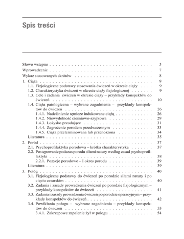 Spis treści Słowo wstępne . . . . . . . . . . . . . . . . . . . . . . . . . . . . . . . . Wprowadzenie . . . . . . . . . . . . . . . . . . . . . . . . . . . . . . . . Wykaz stosowanych skrótów . . . . . . . . . . . . . . . . . . . . . . . . . 1. Ciąża . . . . . . . . . . . . . . . . . . . . . . . . . . . . . . . . . . . . 1.1. Fizjologiczne podstawy stosowania ćwiczeń w okresie ciąży . . . . 1.2. Charakterystyka ćwiczeń w okresie ciąży fizjologicznej . . . . . . . 1.3. Cele i zadania ćwiczeń w okresie ciąży – przykłady konspektów do ćwiczeń . . . . . . . . . . . . . . . . . . . . . . . . . . . . . . . . 1.4. Ciąża patologiczna – wybrane zagadnienia – przykłady konspek tów do ćwiczeń . . . . . . . . . . . . . . . . . . . . . . . . . . . . 1.4.1. Nadciśnienie tętnicze indukowane ciążą . . . . . . . . . . . 1.4.2. Niewydolność cieśniowo-szyjkowa . . . . . . . . . . . . . . 1.4.3. Łożysko przodujące . . . . . . . . . . . . . . . . . . . . . . 1.4.4. Zagrożenie porodem przedwczesnym . . . . . . . . . . . . 1.4.5. Ciąża przeterminowana lub przenoszona . . . . . . . . . . Literatura . . . . . . . . . . . . . . . . . . . . . . . . . . . . . . . . . 2. Poród . . . . . . . . . . . . . . . . . . . . . . . . . . . . . . . . . . . . 2.1. Psychoprofilaktyka porodowa – krótka charakterystyka . . . . . . . 2.2. Postępowanie podczas porodu siłami natury według zasad psychoprofi laktyki . . . . . . . . . . . . . . . . . . . . . . . . . . . . . . . . . 2.2.1. Pozycje porodowe – I okres porodu . . . . . . . . . . . . . . Literatura . . . . . . . . . . . . . . . . . . . . . . . . . . . . . . . . . 3. Połóg . . . . . . . . . . . . . . . . . . . . . . . . . . . . . . . . . . . . 3.1. Fizjologiczne podstawy do ćwiczeń po porodzie siłami natury i po cięciu cesarskim . . . . . . . . . . . . . . . . . . . . . . . . . . . 3.2. Zadania i zasady prowadzenia ćwiczeń po porodzie fizjologicznym – przykłady konspektów do ćwiczeń . . . . . . . . . . . . . . . . . . 3.3. Zadania i zasady prowadzenia ćwiczeń po porodzie operacyjnym – przy kłady konspektów do ćwiczeń . . . . . . . . . . . . . . . . . . . . 3.4. Powikłania połogu – wybrane zagadnienia – przykłady konspek tów do ćwiczeń . . . . . . . . . . . . . . . . . . . . . . . . . . . . 3.4.1. Zakrzepowe zapalenie żył w połogu . . . . . . . . . . . . . 5 7 8 9 9 9 10 26 26 29 31 33 34 35 37 37 38 39 39 40 40 41 42 53 54 4 Spis treści 3.4.2. Rozejście się spojenia łonowego i stawów krzyżowo-biodro wych . . . . . . . . . . . . . . . . . . . . . . . . . . . . . . Literatura . . . . . . . . . . . . . . . . . . . . . . . . . . . . . . . . . 4. Ginekologia operacyjna . . . . . . . . . . . . . . . . . . . . . . . . . . 4.1. Cele postępowania rehabilitacyjnego w ginekologii operacyjnej . . 4.2. Zadania ćwiczeń oraz zasady postępowania po operacjach przez powłoki brzuszne – przykład konspektu do ćwiczeń . . . . . . . . . 4.3. Zadania ćwiczeń oraz zasady postępowania po operacjach przez pochwę – przykład konspektu do ćwiczeń . . . . . . . . . . . . . . Literatura . . . . . . . . . . . . . . . . . . . . . . . . . . . . . . . . . 5. Ginekologia zachowawcza – wybrane zagadnienia – przykłady konspektów do ćwiczeń . . . . . . . . . . . . . . . . . . . . . . . . . . . . . . . . . 5.1. Zaburzenia w miesiączkowaniu . . . . . . . . . . . . . . . . . . . 5.1.1. Zespół napięcia przedmiesiączkowego oraz bolesne miesiącz kowanie . . . . . . . . . . . . . . . . . . . . . . . . . . . . 5.1.2. Rzadko występujące miesiączkowanie oraz skąpe miesiączko wanie . . . . . . . . . . . . . . . . . . . . . . . . . . . . . . 5.1.3. Wtórny brak miesiączki . . . . . . . . . . . . . . . . . . . . 5.2. Niewydolność przepony moczowo-płciowej . . . . . . . . . . . . . 5.2.1. Wysiłkowe nietrzymanie moczu – profilaktyka oraz metody postępowania zachowawczego . . . . . . . . . . . . . . . . Literatura . . . . . . . . . . . . . . . . . . . . . . . . . . . . . . . . . 57 62 63 63 64 67 71 72 72 72 75 76 78 79 86