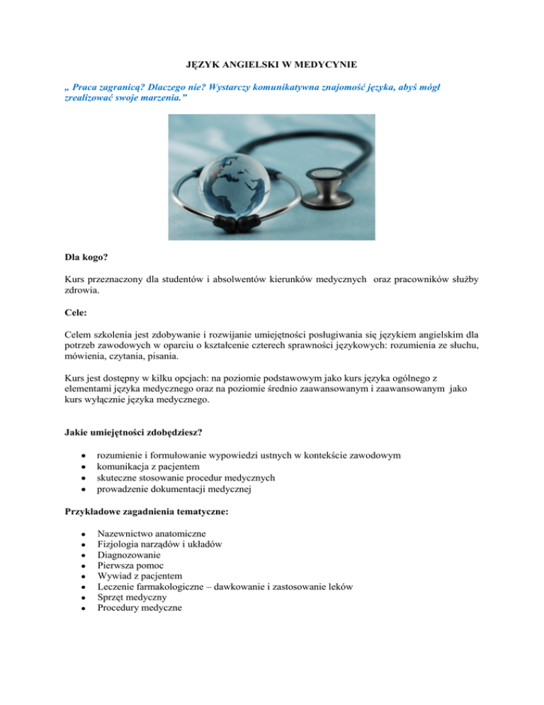 JĘZYK ANGIELSKI W MEDYCYNIE „ Praca zagranicą? Dlaczego nie? Wystarczy komunikatywna znajomość języka, abyś mógł zrealizować swoje marzenia.” Dla kogo? Kurs przeznaczony dla studentów i absolwentów kierunków medycznych oraz pracowników służby zdrowia. Cele: Celem szkolenia jest zdobywanie i rozwijanie umiejętności posługiwania się językiem angielskim dla potrzeb zawodowych w oparciu o kształcenie czterech sprawności językowych: rozumienia ze słuchu, mówienia, czytania, pisania. Kurs jest dostępny w kilku opcjach: na poziomie podstawowym jako kurs języka ogólnego z elementami języka medycznego oraz na poziomie średnio zaawansowanym i zaawansowanym jako kurs wyłącznie języka medycznego. Jakie umiejętności zdobędziesz? rozumienie i formułowanie wypowiedzi ustnych w kontekście zawodowym komunikacja z pacjentem skuteczne stosowanie procedur medycznych prowadzenie dokumentacji medycznej Przykładowe zagadnienia tematyczne: Nazewnictwo anatomiczne Fizjologia narządów i układów Diagnozowanie Pierwsza pomoc Wywiad z pacjentem Leczenie farmakologiczne – dawkowanie i zastosowanie leków Sprzęt medyczny Procedury medyczne