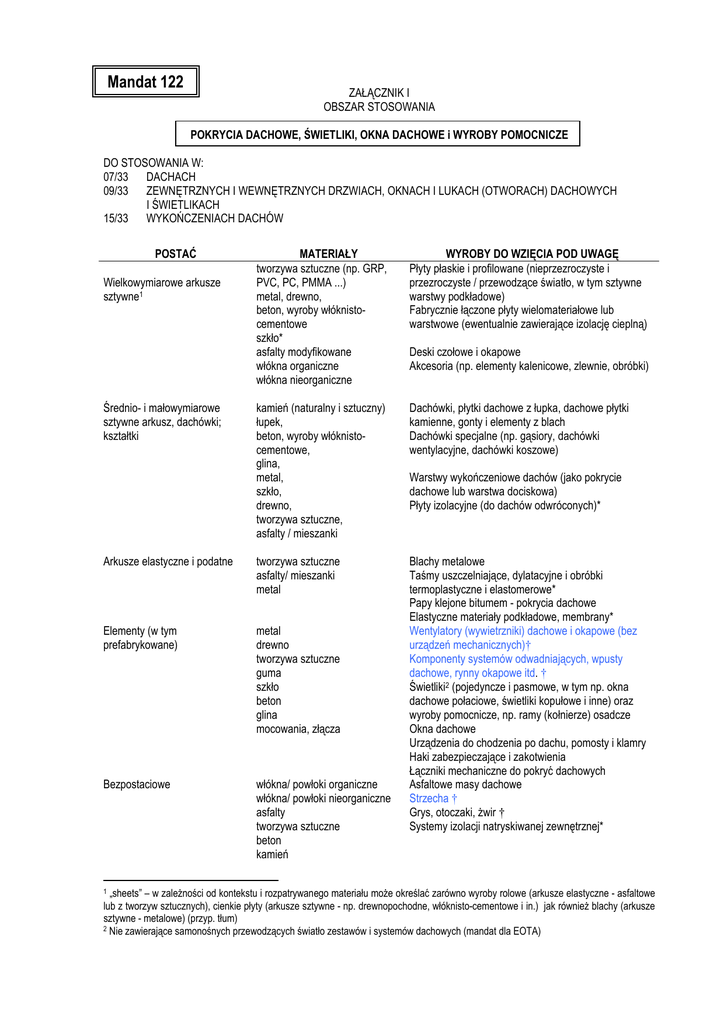 Mandat 122 ZAŁĄCZNIK I OBSZAR STOSOWANIA POKRYCIA DACHOWE, ŚWIETLIKI, OKNA DACHOWE i WYROBY POMOCNICZE DO STOSOWANIA W: 07/33 DACHACH 09/33 ZEWNĘTRZNYCH I WEWNĘTRZNYCH DRZWIACH, OKNACH I LUKACH (OTWORACH) DACHOWYCH I ŚWIETLIKACH 15/33 WYKOŃCZENIACH DACHÓW POSTAĆ Wielkowymiarowe arkusze sztywne1 Średnio- i małowymiarowe sztywne arkusz, dachówki; kształtki MATERIAŁY tworzywa sztuczne (np. GRP, PVC, PC, PMMA ...) metal, drewno, beton, wyroby włóknistocementowe szkło* asfalty modyfikowane włókna organiczne włókna nieorganiczne WYROBY DO WZIĘCIA POD UWAGĘ Płyty płaskie i profilowane (nieprzezroczyste i przezroczyste / przewodzące światło, w tym sztywne warstwy podkładowe) Fabrycznie łączone płyty wielomateriałowe lub warstwowe (ewentualnie zawierające izolację cieplną) Deski czołowe i okapowe Akcesoria (np. elementy kalenicowe, zlewnie, obróbki) kamień (naturalny i sztuczny) łupek, beton, wyroby włóknistocementowe, glina, metal, szkło, drewno, tworzywa sztuczne, asfalty / mieszanki Dachówki, płytki dachowe z łupka, dachowe płytki kamienne, gonty i elementy z blach Dachówki specjalne (np. gąsiory, dachówki wentylacyjne, dachówki koszowe) Arkusze elastyczne i podatne tworzywa sztuczne asfalty/ mieszanki metal Elementy (w tym prefabrykowane) metal drewno tworzywa sztuczne guma szkło beton glina mocowania, złącza Bezpostaciowe włókna/ powłoki organiczne włókna/ powłoki nieorganiczne asfalty tworzywa sztuczne beton kamień Blachy metalowe Taśmy uszczelniające, dylatacyjne i obróbki termoplastyczne i elastomerowe* Papy klejone bitumem - pokrycia dachowe Elastyczne materiały podkładowe, membrany* Wentylatory (wywietrzniki) dachowe i okapowe (bez urządzeń mechanicznych)† Komponenty systemów odwadniających, wpusty dachowe, rynny okapowe itd. † Świetliki2 (pojedyncze i pasmowe, w tym np. okna dachowe połaciowe, świetliki kopułowe i inne) oraz wyroby pomocnicze, np. ramy (kołnierze) osadcze Okna dachowe Urządzenia do chodzenia po dachu, pomosty i klamry Haki zabezpieczające i zakotwienia Łączniki mechaniczne do pokryć dachowych Asfaltowe masy dachowe Strzecha † Grys, otoczaki, Ŝwir † Systemy izolacji natryskiwanej zewnętrznej* 1 Warstwy wykończeniowe dachów (jako pokrycie dachowe lub warstwa dociskowa) Płyty izolacyjne (do dachów odwróconych)* „sheets” – w zaleŜności od kontekstu i rozpatrywanego materiału moŜe określać zarówno wyroby rolowe (arkusze elastyczne - asfaltowe lub z tworzyw sztucznych), cienkie płyty (arkusze sztywne - np. drewnopochodne, włóknisto-cementowe i in.) jak równieŜ blachy (arkusze sztywne - metalowe) (przyp. tłum) 2 Nie zawierające samonośnych przewodzących światło zestawów i systemów dachowych (mandat dla EOTA) POSTAĆ MATERIAŁY WYROBY DO WZIĘCIA POD UWAGĘ * zawarte w innych mandatach i nie rozpatrywane tutaj; † Ŝadna z cech nie ma związku z wymaganiami podstawowymi ZAŁĄCZNIK 2 WARUNKI TECHNICZNE ODNIESIENIA Uwaga: nie wszystkie cechy wskazane w poniŜszych tablicach mają związek ze wszystkimi wyrobami danej grupy lub podgrupy. CEN/CENELEC powinny wybrać podzbiór cech mających zastosowanie w odniesieniu do określonego wyrobu z całego zestawu. POKRYCIA DACHOWE, ŚWIETLIKI, OKNA DACHOWE I WYROBY POMOCNICZE DO STOSOWANIA W: 7/33 DACHACH 9/33 ZEWNĘTRZNYCH I WEWNĘTRZNYCH DRZWIACH, OKNACH i LUKACH (OTWORACH) DACHOWYCH I ŚWIETLIKACH 15/33 WYKOŃCZENIACH DACHÓW Grupa i podgrupy A - POKRYCIA DACHOWE (I) Wyroby do krycia dachów układane z pojedynczych elementów (w sposób nieciągły), tworzące ciągłą część dachu. Dostarczane w postaci elementów wyprodukowanych fabrycznie lub arkuszy elastycznych, odgrywają podstawową rolę w zapobieganiu przenikania wody oraz ewentualnie mogą przyczyniać się do wytrzymałości mechanicznej dachu. 1. ARKUSZE3 PŁASKIE I PROFILOWANE (sztywne lub elastyczne, nieprzezroczyste lub przezroczyste / półprzezroczyste (przeświecające), w tym sztywne materiały podkładowe) 2. DACHÓWKI, PŁYTKI Z ŁUPKA, PŁYTKI KAMIENNE i GONTY 3. FABRYCZNIE ŁĄCZONE PŁYTY WIELOMATERIAŁOWE LUB WARSTWOWE (ewentualnie zawierające izolację) Cechy, które powinny być objęte normą zharmonizowaną: WP 1, 4 2 3 4 5 3 WŁAŚCIWOŚĆ UśYTKOWA Trwałość Odporność zamocowania na działanie sił poziomych (w przypadku gdy pokrycie pełni funkcję usztywniającą) Wytrzymałość mechaniczna (np. wytrzymałość na działanie wiatru, śniegu, obciąŜeń stałych, termicznych i zmiennych, wytrzymałość na zginanie, ... odpowiednio do rodzaju wyrobu) Oddziaływanie ognia zewnętrznego TAK Odporność ogniowa (od wewnątrz, jeŜeli dotyczy) Reakcja na ogień (w przypadku naraŜenia na ogień wewnętrzny) (odpowiednio np. na Wodoszczelność (samego wyrobu) zamraŜanie i Zmiana wymiarów (związana z penetracją wody) rozmraŜanie, korozję, Przepuszczalność pary wodnej (odpowiednio do rodzaju wyrobu) temperaturę...) Wydzielanie azbestu [zawartość] Wydzielanie innych niebezpiecznych substancji* (w uzasadnionych przypadkach) Odporność na uderzenie (odpowiednio do rodzaju wyrobu) Izolacyjność od bezpośrednich dźwięków powietrznych (odpowiednio do rodzaju wyrobu) „sheets” – w zaleŜności od kontekstu i rozpatrywanego materiału moŜe określać zarówno wyroby rolowe (arkusze elastyczne - asfaltowe lub z tworzyw sztucznych), cienkie płyty (arkusze sztywne - np. drewnopochodne, włóknisto-cementowe i in.) jak równieŜ blachy (arkusze sztywne - metalowe) (przyp. tłum) 6 Właściwości cieplne (odpowiednio do rodzaju wyrobu) Przepuszczalność powietrza (odpowiednio do rodzaju wyrobu) * w szczególności te niebezpieczne substancje, które zdefiniowano w dyrektywie Rady nr 76.769/EWG (ze zmianami). Grupa i podgrupy B - POKRYCIA DACHOWE (II) Wyroby dachowe w postaci mas asfaltowych, odgrywające podstawową rolę w zapobieganiu przenikania wody ale nie przyczyniające się do wytrzymałości mechanicznej d