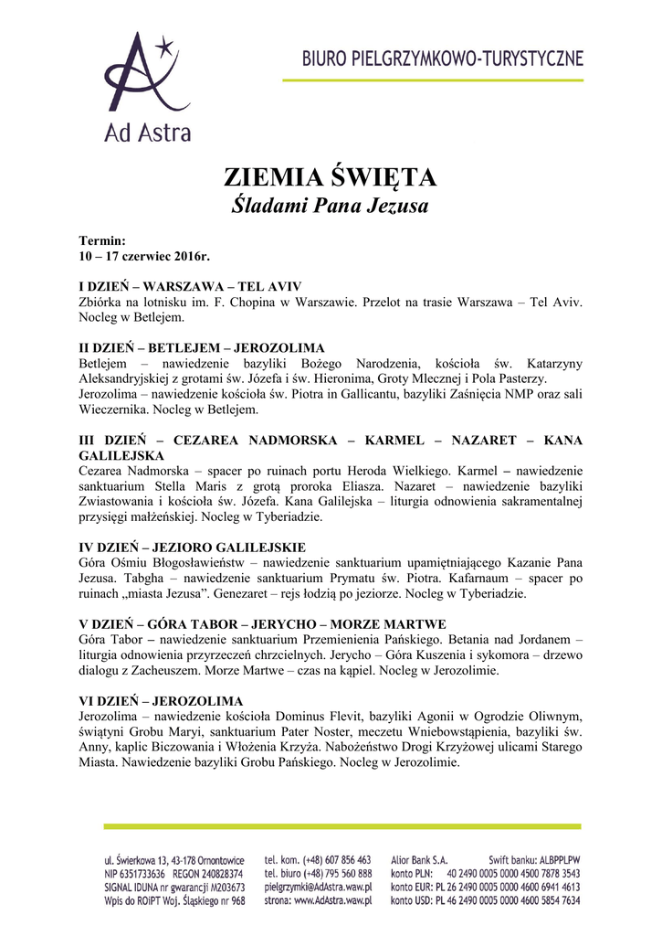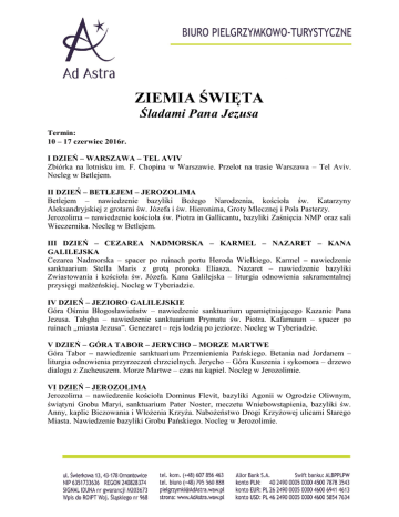 ZIEMIA ŚWIĘTA Śladami Pana Jezusa Termin: 10 – 17 czerwiec 2016r. I DZIEŃ – WARSZAWA – TEL AVIV Zbiórka na lotnisku im. F. Chopina w Warszawie. Przelot na trasie Warszawa – Tel Aviv. Nocleg w Betlejem. II DZIEŃ – BETLEJEM – JEROZOLIMA Betlejem – nawiedzenie bazyliki Bożego Narodzenia, kościoła św. Katarzyny Aleksandryjskiej z grotami św. Józefa i św. Hieronima, Groty Mlecznej i Pola Pasterzy. Jerozolima – nawiedzenie kościoła św. Piotra in Gallicantu, bazyliki Zaśnięcia NMP oraz sali Wieczernika. Nocleg w Betlejem. III DZIEŃ – CEZAREA NADMORSKA – KARMEL – NAZARET – KANA GALILEJSKA Cezarea Nadmorska – spacer po ruinach portu Heroda Wielkiego. Karmel – nawiedzenie sanktuarium Stella Maris z grotą proroka Eliasza. Nazaret – nawiedzenie bazyliki Zwiastowania i kościoła św. Józefa. Kana Galilejska – liturgia odnowienia sakramentalnej przysięgi małżeńskiej. Nocleg w Tyberiadzie. IV DZIEŃ – JEZIORO GALILEJSKIE Góra Ośmiu Błogosławieństw – nawiedzenie sanktuarium upamiętniającego Kazanie Pana Jezusa. Tabgha – nawiedzenie sanktuarium Prymatu św. Piotra. Kafarnaum – spacer po ruinach „miasta Jezusa”. Genezaret – rejs łodzią po jeziorze. Nocleg w Tyberiadzie. V DZIEŃ – GÓRA TABOR – JERYCHO – MORZE MARTWE Góra Tabor – nawiedzenie sanktuarium Przemienienia Pańskiego. Betania nad Jordanem – liturgia odnowienia przyrzeczeń chrzcielnych. Jerycho – Góra Kuszenia i sykomora – drzewo dialogu z Zacheuszem. Morze Martwe – czas na kąpiel. Nocleg w Jerozolimie. VI DZIEŃ – JEROZOLIMA Jerozolima – nawiedzenie kościoła Dominus Flevit, bazyliki Agonii w Ogrodzie Oliwnym, świątyni Grobu Maryi, sanktuarium Pater Noster, meczetu Wniebowstąpienia, bazyliki św. Anny, kaplic Biczowania i Włożenia Krzyża. Nabożeństwo Drogi Krzyżowej ulicami Starego Miasta. Nawiedzenie bazyliki Grobu Pańskiego. Nocleg w Jerozolimie. VII DZIEŃ – JEROZOLIMA – EIN KAREM Jerozolima – wizyta pod Ścianą Płaczu i w Instytucie Pamięci Yad Vashem, dzielnica żydowska Starego Miasta. Ein Karem – nawiedzenie sanktuarium narodzenia św. Jana Chrzciciela i nawiedzenia św. Elżbiety. Nocleg w Jerozolimie. VIII DZIEŃ – TEL AVIV – WARSZAWA Przelot na trasie Tel Aviv – Warszawa. Organizator zastrzega sobie możliwość zmiany kolejności zwiedzania CENA: 1990 PLN + 735 USD – dla grupy liczącej 20 – 24 osoby (+1 miejsce gratis) 1930 PLN + 680 USD – dla grupy liczącej 25 – 29 osób (+1 miejsce gratis) 1890 PLN + 645 USD – dla grupy liczącej 30 – 34 osoby (+1 miejsce gratis) 1850 PLN + 620 USD – dla grupy liczącej 35 – 39 osób (+1 miejsce gratis) 1850 PLN + 595 USD – dla grupy liczącej 40 – 44 osoby (+2 miejsca gratis) 1850 PLN + 580 USD – dla grupy liczącej 45 – 49 osób (+2 miejsca gratis) CENA ZAWIERA: - przelot na trasie Warszawa – Tel Aviv – Warszawa /izraelskie linie lotnicze EL AL/ - noclegi w hotelach 3* /pokoje dwuosobowe, dopłata do pokoju jednoosobowego 240 USD/ - wyżywienie 3 razy dziennie /śniadanie, lunch, obiadokolacja/ - przejazdy autokarem wg programu - bilety wstępu do zwiedzanych obiektów - opiekę polskojęzycznego pilota - opiekę lokalnego przewodnika - opiekę duchową kapłana - napiewki dla lokalnej obsługi - ubezpieczenie KL i NNW /zawiera ubezpieczenie od chorób przewlekłych/