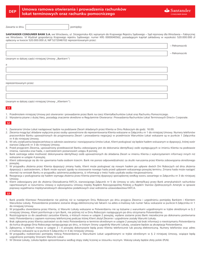 DEP Umowa ramowa otwierania i prowadzenia rachunków lokat terminowych oraz rachunku pomocniczego Zawarta w dniu pomiędzy: SANTANDER CONSUMER BANK S.A. we Wrocławiu, ul. Strzegomska 42c wpisanym do Krajowego Rejestru Sądowego – Sąd rejonowy dla Wrocławia – Fabrycznej we Wrocławiu. VI Wydział gospodarczy Krajowego rejestru Sądowego: numer KRS 0000040562, posiadającym kapitał zakładowy w wysokości 520.000.000 zł opłacony w kwocie 520.000.000 zł, NIP 5272046102 reprezentowanym przez: – Pełnomocnik – Pełnomocnik (zwanym w dalszej części niniejszej Umowy „Bankiem”) a reprezentowanym przez: (zwanym w dalszej części niniejszej Umowy „Klientem”). §1 1. Przedmiotem niniejszej Umowy jest otwieranie i prowadzenie przez Bank na rzecz KlientaRachunków Lokat oraz Rachunku Pomocniczego. 2. Wyrażenia pisane z dużej litery, posiadają znaczenie określone w Regulaminie Otwierania i Prowadzenia Rachunków Lokat Terminowych Direct+ Corporate. §2 1. Zawieranie Umów Lokat następować będzie na podstawie Zleceń składanych przez Klienta w Dniu Roboczym do godz. 16:00. 2. Zlecenia mogą być składane wyłącznie przez osoby upoważnione do reprezentowania Klienta wskazane w Załączniku nr 1 do niniejszej Umowy. Numery telefonów pracowników Banku upoważnionych do przyjmowania Zleceń i prowadzenia negocjacji w przedmiocie Warunków Lokat wskazane są w punkcie 1 Załącznika nr 4 do niniejszej Umowy. 3. W celu zwiększenia bezpieczeństwa w zakresie zawierania i rozwiązywania Umów Lokat, Klient posługiwać się będzie hasłem wskazanym w dyspozycji, której wzór stanowi Załącznik nr 3 do niniejszej Umowy. 4. Przed przyjęciem Zlecenia, upoważniony przedstawiciel Banku zobowiązany jest do dokonania identyfikacji osób występujących w imieniu Klienta na podstawie imienia, nazwiska oraz hasła, z zastrzeżeniem postanowień ustępu 8 poniżej. 5. Bank zastrzega sobie możliwość dokonywania identyfikacji osób upoważnionych do składania Zleceń w imieniu Klienta z wykorzystaniem informacji innych niż wskazane w ustępie 4 powyżej. 6. Klient zobowiązuje się do nie ujawniania hasła osobom trzecim. Bank nie ponosi odpowiedzialności za skutki naruszenia przez Klienta zobowiązania określonego powyżej. 7. W przypadku złożenia przez Klienta dyspozycji zmiany hasła, Klient może posługiwać się nowym hasłem po upływie dwóch Dni Roboczych od dnia złożenia dyspozycji z zastrzeżeniem, iż Bank może wyrazić zgodę na stosowanie nowego hasła przed upływem wskazanego powyżej terminu. Zmiana hasła może nastąpić również na wniosek Banku w przypadku zaistnienia podejrzenia, iż informację o treści hasła uzyskała osoba nieupoważniona. 8. Rezygnacja z posługiwania się hasłem wymaga złożenia przez Klienta pisemnej dyspozycji sporządzonej według wzoru zawartego w Załączniku nr 3 do niniejszej Umowy. 9. Klient zobowiązany jest do złożenia Oświadczenia FATCA, stanowiącego Załącznik nr 5 do Umowy w celu identyfikacji przez Bank amerykańskich rachunków raportowanych w rozumieniu Ustawy o wykonywaniu Umowy między Rządem Rzeczypospolitej Polskiej a Rządem Stanów Zjednoczonych Ameryki w sprawie poprawy wypełniania międzynarodowych obowiązków podatkowych oraz wdrożenia ustawodawstwa FATCA. §3 1. Bank prześle Klientowi Potwierdzenie nie później niż w następnym Dniu Roboczym po dniu przyjęcia Zlecenia i uzgodnieniu pomiędzy Bankiem i Klientem Warunków Lokaty. Potwierdzenie przesłane zostanie drogą elektroniczną lub faksem na adres e-mailowy lub numer faksu wskazane w punkcie II Załącznika nr 1 do niniejszej Umowy. 2. W przypadku stwierdzenia przez Klienta, iż Warunki Lokaty wskazane w Potwierdzeniu nie są tożsame z warunkami uzgodnionymi w trybie określonym w § 2 niniejszej Umowy, Klient poinformuje o tym Bank, nie później niż w Dniu Roboczym następującym po dniu otrzymania Potwierdzenia. 3. Rozstrzygnięcie co do zasadności zarzutów Klienta, o których mowa w ustępie 2 powyżej, wydane zostanie przez Bank niezwłocznie po dokonaniu porównania treści Potwierdzenia z zapisem rozmowy telefonicznej podczas której Klient złożył Zlecenie i uzgodnione zostały Warunki Lokaty. 4. Brak zgłoszenia przez Klienta zastrzeżeń co do treści Potwierdzenia w terminie określonym w ustępie 2 powyżej lub brak informacji o nieotrzymaniu Potwierdzenia do końca drugiego Dnia Roboczego następującego po dniu, w którym Strony uzgodniły Warunki Lokaty, uważane będzie za akceptację Potwierdzenia. 5. Zgłoszenia, o których mowa w ustępie 2 i 4 powyżej dokonywane będą przez Klienta telefonicznie lub pocztą elektroniczną. Numery telefonów oraz adres e-mailowy wskazane są w punkcie II Załącznika nr 4 do niniejszej Umowy. 6. W przypadku rozbieżności pomiędzy treścią Potwierdzenia a Warunkami Lokat uzgodnionymi w trybie określonym w § 2 niniejszej Umowy, wiążące będą uzgodnione pomiędzy Stronami Warunki Lokat. 7. W Okresie Lokaty, Lokata będzie oprocentowana według stopy stałej liczonej w stosunku rocznym. Walutą Lokaty będzie złoty polski (PLN). §4 1. W Dniu Zapadalności Bank przeleje kwotę Lokaty powiększoną o należne odsetki na Rachunek Rozliczeniowy. 2. Klientowi przysługuje prawo zmiany dyspozycji płatniczej opisanej w ustępie 1 powyżej do godz. 16:00 Dnia Roboczego poprzedzającego Dzień Zapadalności. 3. Klient wskazuje następujący Rachunek Rozliczeniowy: §5 1. Klient może rozwiązać Umowę Lokaty przed upływem Okresu Lokaty w trybie telefonicznej dyspozycji złożonej przez osoby upoważnione do reprezentowania Klienta wskazane w Załączniku nr 1 do niniejszej Umowy. 2. W Dniu Roboczym następującym po dniu złożenia telefonicznej dyspozycji, o której mowa w ustępie 1 powyżej, Bank przeleje na Rachunek Rozliczeniowy kwotę Lokaty powiększoną o odsetki naliczone wg stopy procentowej obowiązującej w Banku w dniu rozwiązania Umowy Lokaty dla r