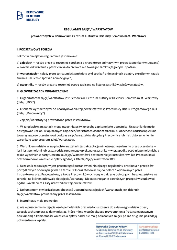 REGULAMIN ZAJĘĆ / WARSZTATÓW prowadzonych w Bemowskim Centrum Kultury w Dzielnicy Bemowo m.st. Warszawy I. PODSTAWOWE POJĘCIA Ilekroć w niniejszym regulaminie jest mowa o: a) zajęciach – należy przez to rozumieć spotkania o charakterze animacyjnym prowadzone (kontynuowane) w okresie od września / października do czerwca nie tworzące zamkniętego cyklu spotkań, b) warsztatach – należy przez to rozumieć zamknięty cykl spotkań animacyjnych o z góry określonym czasie trwania lub liczbie spotkań animacyjnych, c) uczestniku – należy przez to rozumieć osobę zapisaną na listę uczestników zajęć/warsztatów. II. GŁÓWNE ZASADY ORGANIZACYJNE 1. Organizatorem zajęć/warsztatów jest Bemowskie Centrum Kultury w Dzielnicy Bemowo m.st. Warszawy (dalej: „BCK”). 2. Osobami wyznaczonymi do koordynowania zajęć/warsztatów są Pracownicy Działu Programowego BCK (dalej: „Pracownicy”). 3. Zajęcia/warsztaty są prowadzone przez Instruktorów. 4. W zajęciach/warsztatach mogą uczestniczyć tylko osoby zapisane jako uczestnicy. Uczestnik nie może odstępować udziału w opłaconych zajęciach/warsztatach osobom trzecim. O obecności rodzica/opiekuna towarzyszącego uczestnikowi podczas zajęć/warsztatów decydują Pracownicy lub Instruktorzy, o ile nie warunkuje tego program zajęć/warsztatów. 5. Warunkiem udziału w zajęciach/warsztatach jest akceptacja niniejszego regulaminu przez uczestnika – jeśli jest pełnoletni lub przez rodzica/prawnego opiekuna uczestnika – w przypadku osób niepełnoletnich, a także wypełnienie Karty Uczestnika Zajęć/Warsztatów i dostarczenie jej Instruktorowi lub Pracownikowi oraz terminowe wniesienie opłaty zgodnej z Ofertą Zajęć/Warsztatów BCK. 6. Uczestnik zobowiązany jest przestrzegać postanowień niniejszego regulaminu oraz innych przepisów porządkowych obowiązujących na ternie BCK oraz stosować się do poleceń wydawanych przez Instruktorów oraz Pracowników, a także Pracowników ochrony w zakresie dotyczącym bezpieczeństwa na terenie, na którym odbywają się zajęcia/warsztaty. Nieprzestrzeganie powyższych przepisów skutkować będzie skreśleniem z listy uczestników zajęć/warsztatów. 7. Dokumentem stwierdzającym obecność uczestnika na zajęciach/warsztatach jest dziennik zajęć/warsztatów prowadzony przez Instruktora. 8. Instruktorzy mają prawo do: a) nie wpuszczenia na zajęcia osób pełnoletnich oraz niedopuszczenia do aktywnego udziału dzieci, zalegających z opłatą za dany miesiąc, które mimo wcześniejszego przypomnienia (rodzicom/prawnym opiekunom) o konieczności wniesienia opłaty nadal nie mają opłaconych zajęć i po raz drugi nie posiadają potwierdzenia wpłaty, b) w uzgodnieniu z Pracownikiem, dokonywania skreśleń z lity uczestników zajęć/warsztatów. 9. Instruktorzy nie mają prawa pobierania od uczestników opłat za udział w zajęciach/warsztatach. 10. Uczestnik jest zobowiązany do przedłożenia Instruktorowi dowodu wpłaty za zajęcia/warsztaty podczas pierwszych zajęć w miesiącu/pierwszych zajęć warsztatowych. 11. Nie dokonanie wpłaty za zajęcia przez dwa kolejne spotkania skutkuje wykreśleniem z listy uczestników zajęć i uruchomieniem procesu windykacji zaległych zobowiązań. 12. Niedokonanie wpłaty za warsztat w terminie wyznaczonym przez BCK skutkuje skreśleniem z lity uczestników warsztatów. 13. Minimalną liczbę uczestników zajęć grupowych, niezbędną do rozpoczęcia zajęć dla danej grupy zajęciowej ustala BCK. 14. Zmniejszenie liczby uczestników zajęć poniżej ustalonego minimum może skutkować likwidacją grupy zajęciowej. 15. Powstanie grupy warsztatowej warunkuje zapisanie się określonego przez BCK minimum uczestników oraz dokonanie przez uczestników wpłaty pełnej kwoty za warsztat w wyznaczonym przez BCK terminie. 16. O ewentualnych uszkodzeniach sprzętu lub elementów wyposażenia pracowni, w której odbywają się zajęcia/warsztaty należy niezwłocznie poinformować Instruktora lub Pracownika. 17. Zabrania się przebywania na ternie BCK osobom znajdującym się pod wpływem alkoholu oraz innych środków odurzających. 18. Na terenie BCK obowiązuje całkowity zakaz palenia tytoniu oraz spożywania alkoholu i innych środków odurzających. 19. W przypadku rezygnacji z uczestnictwa w zajęciach/warsztatach, uczestnik lub rodzic/opiekun prawny uczestnika, w przypadku osób niepełnoletnich, obowiązany jest niezwłocznie o tym fakcie powiadomić Pracownika lub Instruktora zajęć/warsztatów, przed ich rozpoczęciem. 20. W przypadku rezygnacji z uczestnictwa w zajęciach/warsztatach i skreślenia z listy uczestników zajęć/warsztatów, BCK zwróci uczestnikowi zajęć/warsztatów uiszczoną część opłaty za niewykorzystane zajęcia/warsztaty po dniu rezygnacji/skreślenia z listy uczestników zajęć/warsztatów. III. MIEJSCE I CZAS ZAJĘĆ/WARSZTATÓW 1. Zajęcia/warsztaty odbywają się na terenie BCK w godzinach od 8:00 do 22:00. 2. Czas trwania i terminy zajęć/warsztatów ustala BCK. 3. Z ważnych powodów BCK ma prawo wyznaczyć inny czas, termin i miejsce odbywania się warsztatów/zajęć, o czym poinformuje uczestników za pomocą informacji pisemnej na tablicy ogłoszeń BCK, stronie www.bemowskie.pl lub na profilu facebook.pl. IV. PŁATNOŚCI ZA ZAJĘCIA/WARSZTATY 1. Wysokość opłat za zajęcia/warsztaty w BCK reguluje Oferta Zajęć/Warsztatów BCK, ustalana przez Dyrektora BCK. 2. Opłaty za zajęcia należy wnosić z góry do dnia, w którym rozpoczynają się pierwsze zajęcia w danym miesiącu. 3. Opłaty za warsztaty należy wnosić z góry w całości (za warsztat) w terminie wyznaczonym przez BCK. 4. W przypadku osób, które w chwili zapisu na zajęcia grupowe, odbywające się w cyklu 2 razy w tygodniu, deklarują chęć uczęszczania tylko 1 raz tygodniowo, opłata za miesiąc wynosi 50 % stawki miesięcznej. Warunkiem koniecznym dla zastosowania takiej stawki jest wolne mi