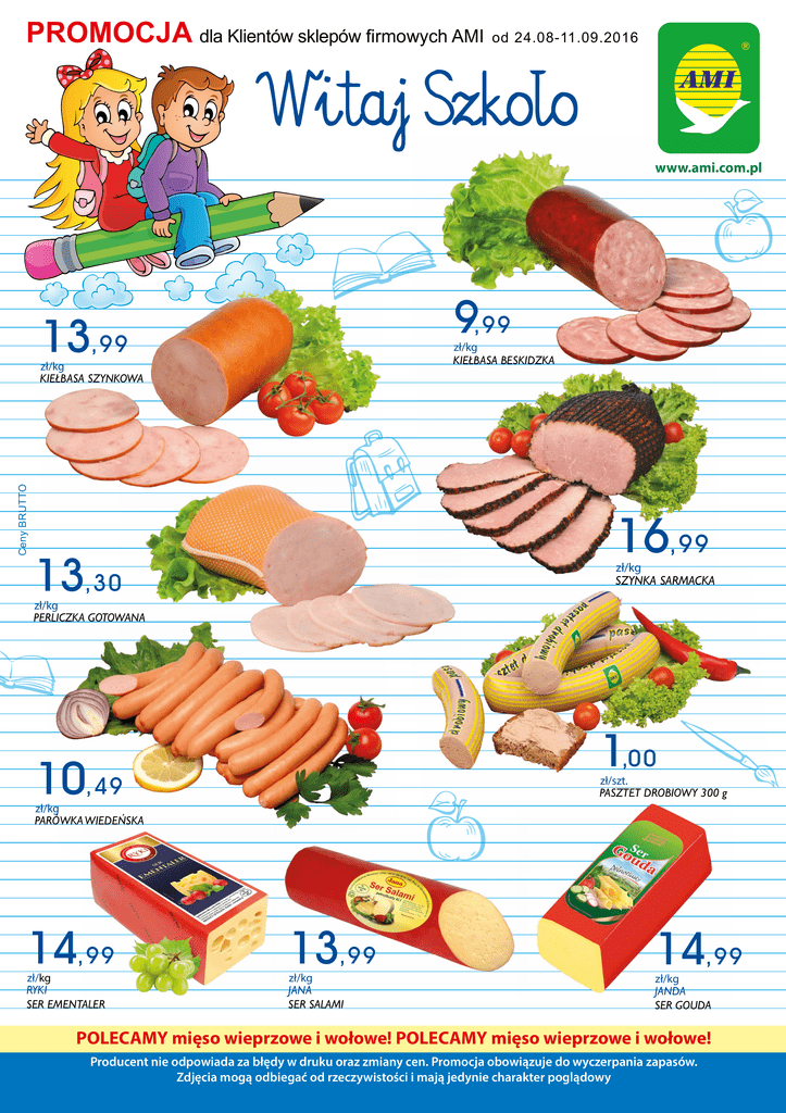 PROMOCJA dla Klientów sklepów firmowych AMI od 24.08-11.09.2016 Witaj Szkoło www.ami.com.pl 9,99 13,99 zł/kg KIEŁBASA BESKIDZKA Ceny BRUTTO zł/kg KIEŁBASA SZYNKOWA 16,99 13,30 zł/kg SZYNKA SARMACKA zł/kg PERLICZKA GOTOWANA 1,00 10,49 zł/szt. PASZTET DROBIOWY 300 g zł/kg PARÓWKA WIEDEŃSKA 14,99 zł/kg RYKI SER EMENTALER 13,99 zł/kg JANA SER SALAMI 14,99 zł/kg JANDA SER GOUDA POLECAMY mięso wieprzowe i wołowe! POLECAMY mięso wieprzowe i wołowe! Producent nie odpowiada za błędy w druku oraz zmiany cen. Promocja obowiązuje do wyczerpania zapasów. Zdjęcia mogą odbiegać od rzeczywistości i mają jedynie charakter poglądowy