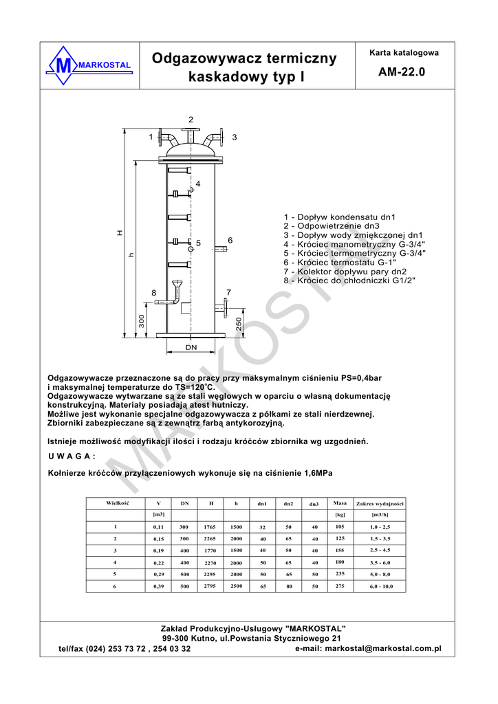 M Karta katalogowa Odgazowywacz termiczny kaskadowy typ I MARKOSTAL AM-22.0 2 1 3 4 6 h 5 7 Dopływ kondensatu dn1 Odpowietrzenie dn3 Dopływ wody zmiękczonej dn1 Króciec manometryczny G-3/4" Króciec termometryczny G-3/4" Króciec termostatu G-1" Kolektor dopływu pary dn2 Króciec do chłodniczki G1/2" M AR KO 250 300 8 - ST AL H 1 2 3 4 5 6 7 8 DN Odgazowywacze przeznaczone są do pracy przy maksymalnym ciśnieniu PS=0,4bar o i maksymalnej temperaturze do TS=120 C. Odgazowywacze wytwarzane są ze stali węglowych w oparciu o własną dokumentację konstrukcyjną. Materiały posiadają atest hutniczy. MoŜliwe jest wykonanie specjalne odgazowywacza z półkami ze stali nierdzewnej. Zbiorniki zabezpieczane są z zewnątrz farbą antykorozyjną. Istnieje moŜliwość modyfikacji ilości i rodzaju króćców zbiornika wg uzgodnień. UWAGA: Kołnierze króćców przyłączeniowych wykonuje się na ciśnienie 1,6MPa Wielkość V DN H h dn1 dn2 dn3 [m3] Masa Zakres wydajności [kg] [m3/h] 1 0,11 300 1765 1500 32 50 40 105 1,0 - 2,5 2 0,15 300 2265 2000 40 65 40 125 1,5 - 3,5 3 0,19 400 1770 1500 40 50 40 155 2,5 - 4,5 4 0,22 400 2270 2000 50 65 40 180 3,5 - 6,0 5 0,29 500 2295 2000 50 65 50 235 5,0 - 8,0 6 0,39 500 2795 2500 65 80 50 275 6,0 - 10,0 Zakład Produkcyjno-Usługowy "MARKOSTAL" 99-300 Kutno, ul.Powstania Styczniowego 21 e-mail: [email protected] tel/fax (024) 253 73 72 , 254 03 32