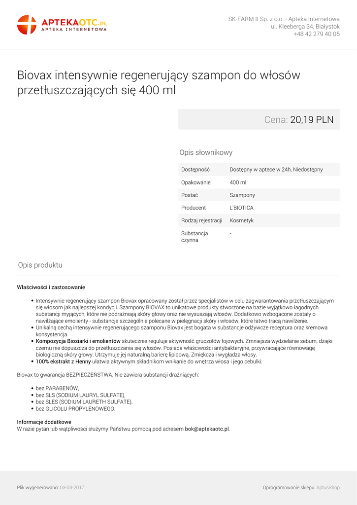 SK-FARM II Sp. z o.o. - Apteka Internetowa ul. Kleeberga 34, Białystok +48 42 279 40 05 Biovax intensywnie regenerujący szampon do włosów przetłuszczających się 400 ml Cena: 20,19 PLN Opis słownikowy Dostępność Dostępny w aptece w 24h, Niedostępny Opakowanie 400 ml Postać Szampony Producent L'BIOTICA Rodzaj rejestracji Kosmetyk Substancja czynna - Opis produktu Właściwości i zastosowanie Intensywnie regenerujący szampon Biovax opracowany został przez specjalistów w celu zagwarantowania przetłuszczającym się włosom jak najlepszej kondycji. Szampony BIOVAX to unikatowe produkty stworzone na bazie wyjątkowo łagodnych substancji myjących, które nie podrażniają skóry głowy oraz nie wysuszają włosów. Dodatkowo wzbogacone zostały o nawilżające emolienty - substancje szczególnie polecane w pielęgnacji skóry i włosów, które łatwo tracą nawilżenie. Unikalną cechą intensywnie regenerującego szamponu Biovax jest bogata w substancje odżywcze receptura oraz kremowa konsystencja. Kompozycja Biosiarki i emolientów skutecznie reguluje aktywność gruczołów łojowych. Zmniejsza wydzielanie sebum, dzięki czemu nie dopuszcza do przetłuszczania się włosów. Posiada właściwości antybakteryjne, przywracające równowagę biologiczną skóry głowy. Utrzymuje jej naturalną barierę lipidową. Zmiękcza i wygładza włosy. 100% ekstrakt z Henny ułatwia aktywnym składnikom wnikanie do wnętrza włosa i jego cebulki. Biovax to gwarancja BEZPIECZEŃSTWA. Nie zawiera substancji drażniących: bez PARABENÓW, bez SLS (SODIUM LAURYL SULFATE), bez SLES (SODIUM LAURETH SULFATE), bez GLICOLU PROPYLENOWEGO. Informacje dodatkowe W razie pytań lub wątpliwości służymy Państwu pomocą pod adresem [email protected]. Plik wygenerowano: 03-03-2017 Powered by TCPDF (www.tcpdf.org) Oprogramowanie sklepu: AptusShop