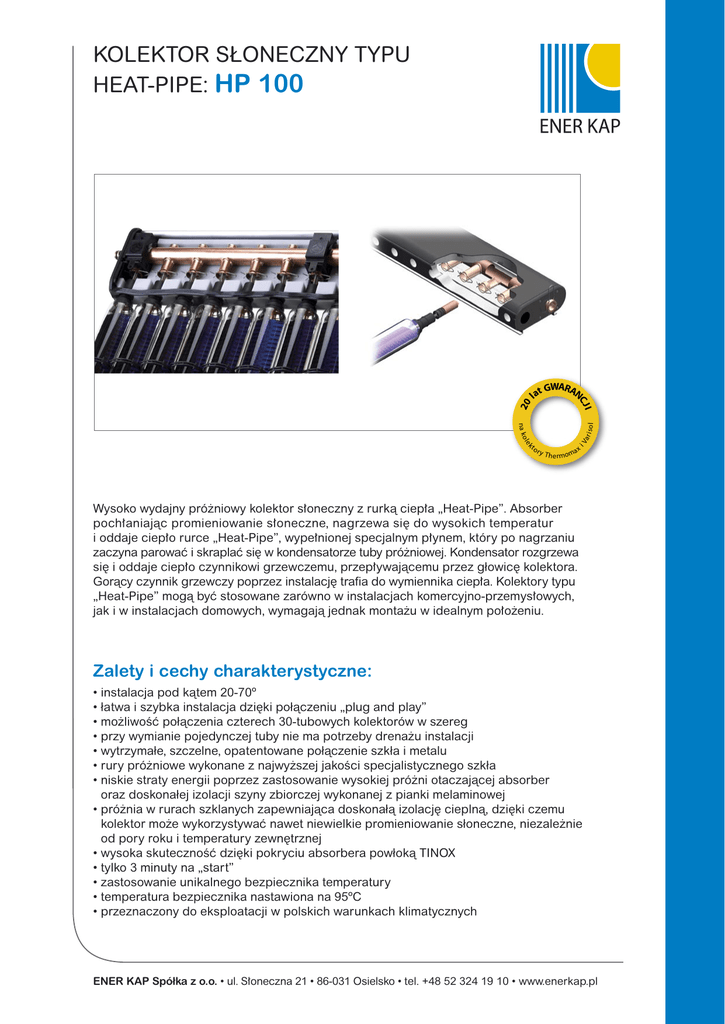 KOLEKTOR SŁONECZNY TYPU HEAT-PIPE: HP 100 ���� � �� �� � ������� ��� ��� � �� � ��� � �� �� � �� � �� �� � � � � �� �� �� Wysoko wydajny pró˝niowy kolektor s∏oneczny z rurkà ciep∏a „Heat-Pipe”. Absorber poch∏aniajàc promieniowanie s∏oneczne, nagrzewa si´ do wysokich temperatur i oddaje ciep∏o rurce „Heat-Pipe”, wype∏nionej specjalnym p∏ynem, który po nagrzaniu zaczyna parowaç i skraplaç si´ w kondensatorze tuby pró˝niowej. Kondensator rozgrzewa si´ i oddaje ciep∏o czynnikowi grzewczemu, przep∏ywajàcemu przez głowic´ kolektora. Goràcy czynnik grzewczy poprzez instalacj´ trafia do wymiennika ciep∏a. Kolektory typu „Heat-Pipe” mogà byç stosowane zarówno w instalacjach komercyjno-przemys∏owych, jak i w instalacjach domowych, wymagajà jednak monta˝u w idealnym po∏o˝eniu. Zalety i cechy charakterystyczne: • instalacja pod kàtem 20-70º • łatwa i szybka instalacja dzi´ki połàczeniu „plug and play” • mo˝liwoÊç połàczenia czterech 30-tubowych kolektorów w szereg • przy wymianie pojedynczej tuby nie ma potrzeby drena˝u instalacji • wytrzymałe, szczelne, opatentowane połàczenie szkła i metalu • rury pró˝niowe wykonane z najwy˝szej jakoÊci specjalistycznego szkła • niskie straty energii poprzez zastosowanie wysokiej pró˝ni otaczajàcej absorber oraz doskonałej izolacji szyny zbiorczej wykonanej z pianki melaminowej • pró˝nia w rurach szklanych zapewniajàca doskonałà izolacj´ cieplnà, dzi´ki czemu kolektor mo˝e wykorzystywaç nawet niewielkie promieniowanie słoneczne, niezale˝nie od pory roku i temperatury zewn´trznej • wysoka skutecznoÊç dzi´ki pokryciu absorbera powłokà TINOX • tylko 3 minuty na „start” • zastosowanie unikalnego bezpiecznika temperatury • temperatura bezpiecznika nastawiona na 95ºC • przeznaczony do eksploatacji w polskich warunkach klimatycznych ENER KAP Spółka z o.o. • ul. S∏oneczna 21 • 86-031 Osielsko • tel. +48 52 324 19 10 • www.enerkap.pl KOLEKTOR SŁONECZNY TYPU HEAT-PIPE: HP 100 SPECYFIKACJA TECHNICZNA HP 100 HP100 - 2 m2 (20 rur) HP100 - 3 m2 (30 rur) Powierzchnia absorbera 2,006 m2 3,009 m2 Ca∏kowite wymiary 2005 x 1418 x 97 mm 2005 x 2127 x 97 mm Powierzchnia ca∏kowita 2,843 m2 4,265 m2 SzerokoÊç g∏owicy 1418 mm 2127 mm D∏ugoÊç (tuba z g∏owicà) 2005 mm 2005 mm G∏´bokoÊç 97 mm 97 mm m2 3,24 m2 ZawartoÊç p∏ynu (w g∏owicy) 1,2 litra 1,7 litra Przy∏àcze (miedê) 22 mm 22 mm Waga 47,2 kg 70,5 kg 20÷70° 20÷70° Wymiary Powierzchnia apertury 2,16 Monta˝ Zalecana instalacja Absorber i hydraulika EfektywnoÊç w odniesieniu Apertura Absorber Apertura Absorber eta 0 0,758 0,815 0,739 0,795 k1 [W/m2K] 1,02 1,10 1,0 1,07 k2 [W/m2K] 0,0067 0,0106 0,0074 0,0080 Wskaênik przep∏ywu Zalecany (l/h) 160 240 Minimalny (l/h) 120 180 Maksymalny (l/h) 300 480 Maksymalne ciÊnienie robocze 8 bar 8 bar Temperatura stagnacji 166°C 166°C Cieplny transfer ciep∏a Glikol Glikol Absorber Miedê Miedê Warstwa pokrycia Selektywne pokrycie - Tinox Selektywne pokrycie - Tinox Apsorbcja 95% 95% Materia∏y Emisja 5% 5% Rama mocujàca i uchwyty Stal nierdzewna, Alu, EPDM Stal nierdzewna, Alu, EPDM Szk∏o solarne Z wapna sodowanego o niskiej zawartoÊci ˝elaza - transm. 0,92 Z wapna sodowanego o niskiej zawartoÊci ˝elaza - transm. 0,92 Pró˝nia Wy˝sza ni˝ 10-6 bar Wy˝sza ni˝ 10-6 bar Ogranicznik temperatury 95°C 95°C Quality Certific/Solar Keymark Tak Tak ENER KAP Spółka z o.o. • ul. S∏oneczna 21 • 86-031 Osielsko • tel. +48 52 324 19 10 • www.enerkap.pl