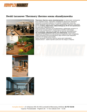Deski tarasowe Thermory thermo sosna skandynawska Thermory thermo sosna skandynawska to doskonałe rozwiązanie przy budowie tarasu. Specjalna modyfikacja termiczna Thermory niezwykle korzystnie wpływa na trwałość i stabilność materiału. Deska tarasowa thermo sosna z gamy produktów Thermory zaliczana jest do 2 klasy odporności odpowiadającej 20-25 lat żywotności bez potrzeby zabezpieczania. Deski tarasowe Thermory są produkowane z głównego surowca co gwarantuje wysoką jakość uzyskanego produktu końcowego. Deski tarasowe Thermory są odporne na warunki atmosferyczne nie wymagają zabezpieczania ani olejowania. Ewentualne olejowanie ma jedynie na celu utrzymać oryginalny kolor osiągnięty dzięki procesowi thermomodyfikacji gdyż drewno pod wpływem promieni UV będzie patynowało. Deska tarasowa Thermory thermo sosna jest materiałem odżywiczonym - żadne wycieki żywiczne nie mają tu miejsca. Dane ogólne NA DESKI TARASOWE THERMORY WYKONANE Z THERMO SOSNY SKANDYNAWSKIEJ UDZIELANA JEST 5 LETNIA GWARANCJA PRODUCENTA Wykończenie: ● ● ● obustronnie gruboryflowana gładka Montaż: deska tarasowa thermo sosna wyposażona w boczne wcięcia dzięki czemu jest przystosowana pod ukryty montaż na specjalne klipy z tworzywa Właściwości: ● ● ● ● ● ● drewno iglaste poddane thermomodyfikacji Thermory piękna miodowa barwa w całym przekroju deski stabilność wymiarowa - deski nie kręcą się nie wypaczają materiał odżywiczony klasa odporności 2 ( żywotności bez zabezpieczania wynosi 20-25 lat) Pochodzenie: firma Brenstol - NAJWIĘKSZA fabryka thermo drewna NA ŚWIECIE Produkcja drewna thermowanego od 1997 roku. Produkty dostępne w 48 krajach. Główne rynki zbytu: Stany Zjednoczone, Kanada, Niemcy, Austria, Włochy, Iran, Japonia. ● ● ● Certyfikaty: CE CATAS EPH Wymiary Deski tarasowe Thermory thermo sosna skandynawska Materiał profil Thermory thermo sosna skandynawska D30sg Thermory thermo sosna skandynawska D4 Thermory thermo sosna skandynawska PacSystem grubość szerokość długość 26 mm 115 mm 3,9m/4,2m/ NATUR 5,1m 26 mm 115 mm NATUR 26 mm 118 mm Legary Do desek tarasowych Thermory oferujemy specjalne legary drewniane wykonane z thermo świerku. Legary te nie wymagają zabezpieczania co jest ich dodatkowym atutem. Żywotność legarów z Thermory thermo świerku wynosi 25 lat+. Legary drewniane Thermory to produkt stabilny i odporny na warunki atmosferyczne. Materiał grubość szerokość długość klasa jakości klasa jakości 4,2m 3,9m NATUR KUP ONLINE KUP ONLINE KUP ONLINE Materiał Thermory thermo świerk grubość szerokość długość 42 68 3/4m klasa jakości NATUR