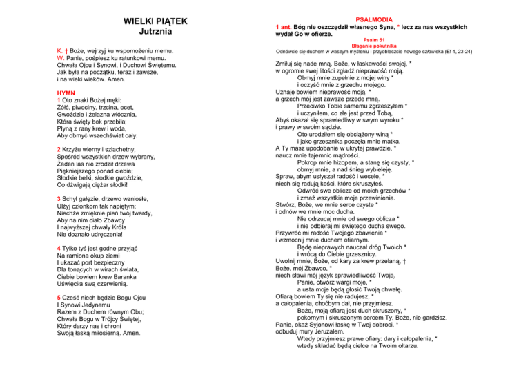 WIELKI PIĄTEK Jutrznia K. † BoŜe, wejrzyj ku wspomoŜeniu memu. W. Panie, pośpiesz ku ratunkowi memu. Chwała Ojcu i Synowi, i Duchowi Świętemu. Jak była na początku, teraz i zawsze, i na wieki wieków. Amen. HYMN 1 Oto znaki BoŜej męki: śółć, plwociny, trzcina, ocet, Gwoździe i Ŝelazna włócznia, Która święty bok przebiła; Płyną z rany krew i woda, Aby obmyć wszechświat cały. 2 KrzyŜu wierny i szlachetny, Spośród wszystkich drzew wybrany, śaden las nie zrodził drzewa Piękniejszego ponad ciebie; Słodkie belki, słodkie gwoździe, Co dźwigają cięŜar słodki! 3 Schyl gałęzie, drzewo wzniosłe, UlŜyj członkom tak napiętym; NiechŜe zmięknie pień twój twardy, Aby na nim ciało Zbawcy I najwyŜszej chwały Króla Nie doznało udręczenia! 4 Tylko tyś jest godne przyjąć Na ramiona okup ziemi I ukazać port bezpieczny Dla tonących w wirach świata, Ciebie bowiem krew Baranka Uświęciła swą czerwienią. 5 Cześć niech będzie Bogu Ojcu I Synowi Jedynemu Razem z Duchem równym Obu; Chwała Bogu w Trójcy Świętej, Który darzy nas i chroni Swoją łaską miłosierną. Amen. PSALMODIA 1 ant. Bóg nie oszczędził własnego Syna, * lecz za nas wszystkich wydał Go w ofierze. Psalm 51 Błaganie pokutnika Odnówcie się duchem w waszym myśleniu i przyobleczcie nowego człowieka (Ef 4, 23-24) Zmiłuj się nade mną, BoŜe, w łaskawości swojej, * w ogromie swej litości zgładź nieprawość moją. Obmyj mnie zupełnie z mojej winy * i oczyść mnie z grzechu mojego. Uznaję bowiem nieprawość moją, * a grzech mój jest zawsze przede mną. Przeciwko Tobie samemu zgrzeszyłem * i uczyniłem, co złe jest przed Tobą, Abyś okazał się sprawiedliwy w swym wyroku * i prawy w swoim sądzie. Oto urodziłem się obciąŜony winą * i jako grzesznika poczęła mnie matka. A Ty masz upodobanie w ukrytej prawdzie, * naucz mnie tajemnic mądrości. Pokrop mnie hizopem, a stanę się czysty, * obmyj mnie, a nad śnieg wybieleję. Spraw, abym usłyszał radość i wesele, * niech się radują kości, które skruszyłeś. Odwróć swe oblicze od moich grzechów * i zmaŜ wszystkie moje przewinienia. Stwórz, BoŜe, we mnie serce czyste * i odnów we mnie moc ducha. Nie odrzucaj mnie od swego oblicza * i nie odbieraj mi świętego ducha swego. Przywróć mi radość Twojego zbawienia * i wzmocnij mnie duchem ofiarnym. Będę nieprawych nauczał dróg Twoich * i wrócą do Ciebie grzesznicy. Uwolnij mnie, BoŜe, od kary za krew przelaną, † BoŜe, mój Zbawco, * niech sławi mój język sprawiedliwość Twoją. Panie, otwórz wargi moje, * a usta moje będą głosić Twoją chwałę. Ofiarą bowiem Ty się nie radujesz, * a całopalenia, choćbym dał, nie przyjmiesz. BoŜe, moją ofiarą jest duch skruszony, * pokornym i skruszonym sercem Ty, BoŜe, nie gardzisz. Panie, okaŜ Syjonowi łaskę w Twej dobroci, * odbuduj mury Jeruzalem. Wtedy przyjmiesz prawe ofiary: dary i całopalenia, * wtedy składać będą cielce na Twoim ołtarzu. Chwała Ojcu i Synowi, * i Duchowi Świętemu. Jak była na początku, teraz i zawsze, * i na wieki wieków. Amen. Chwała Ojcu i Synowi, * i Duchowi Świętemu. Jak była na początku, teraz i zawsze, * i na wieki wieków. Amen. Ant. Bóg nie oszczędził własnego Syna, / lecz za nas wszystkich wydał Go w ofierze. Ant. Jezus Chrystus nas umiłował / i obmył nas krwią swoją z naszych grzechów. 2 ant. Jezus Chrystus nas umiłował * i obmył nas krwią swoją z naszych grzechów. Pieśń (Ha 3, 2-4. 13a. 15-19) Bóg przychodzi na sąd Podnieście głowy, poniewaŜ zbliŜa się wasze odkupienie (Łk 21, 28) Usłyszałem, Panie, Twoje orędzie, * zobaczyłem, Panie, Twoje dzieło. Gdy czas nadejdzie, niech ono odŜyje, † pozwól nam je poznać, gdy zbliŜy się pora, * w gniewnym zapale wspomnij na swą litość! Bóg przychodzi z Temanu, * Święty z góry Paran. Jego majestat okrywa niebiosa, * a Jego chwały pełna jest ziemia. Jego wspaniałość podobna do światła, † z Jego rąk tryskają promienie, * moc Jego w nich jest ukryta. Wyszedłeś, aby lud swój ocalić * i wybawić Twego pomazańca. Konie bezboŜnika wdeptałeś w morze, * w kipiącą topiel wód ogromnych. Usłyszałem, i me serce struchlało, * na ten głos moje wargi zadrŜały, Moje kości przeniknęła trwoga, * zachwiały się moje kroki. Jednak w spokoju czekam na klęskę, * która spotka lud naszych gnębicieli. Choć drzewo figowe nie rozwija pąków * i winnice nie wydają plonów, ChociaŜ zawiodły zbiory oliwek, * a pola nie przynoszą Ŝywności, Choć stada owiec znikają z owczarni * i nie ma wołów w zagrodach, Ja się jednak rozraduję w Panu * i rozweselę w Bogu, moim Zbawicielu. Pan, który jest moją siłą, † uczyni me nogi jak nogi jelenia * i na wyŜyny mnie wyprowadzi. 3 ant. Wielbimy krzyŜ Twój, Panie Jezu, * wysławiamy Twoje święte zmartwychwstanie, / bo przez drzewo krzyŜa przyszła radość dla całego świata. Psalm 147 B Jeruzalem wielbi Boga Chodź, ukaŜę Ci Oblubienicę, MałŜonkę Baranka (Ap 21, 9) Chwal, Jeruzalem, Pana, * wysławiaj twego Boga, Syjonie! Umacnia bowiem zawory bram twoich * i błogosławi synom twoim w tobie. Zapewnia pokój twoim granicom * i wyborną pszenicą ciebie darzy. Zsyła na ziemię swoje polecenia, * a szybko mknie Jego słowo. On prószy śniegiem jak wełną * i szron jak popiół rozsypuje. On grad rozrzuca jak okruchy chleba, * od Jego mrozu ścinają się wody. Posyła słowo, i lód topnieje, * powieje wiatrem, i rzeki płyną. Oznajmił swoje słowo Jakubowi, * Izraelowi ustawy swe i wyroki. Nie uczynił tego dla innych narodów, * nie oznajmił im swoich wyroków. Chwała Ojcu i Synowi, * i Duchowi Świętemu. Jak była na początku, teraz i zawsze, * i na wieki wieków. Amen. Ant. Wielbimy krzyŜ Twój, Panie Jezu, / wysławiamy Twoje święte zmartwychwstanie, / bo przez drzewo krzyŜa przyszła radość dla całego świata. CZYTANIE Iz 52, 13-15 Oto się powie