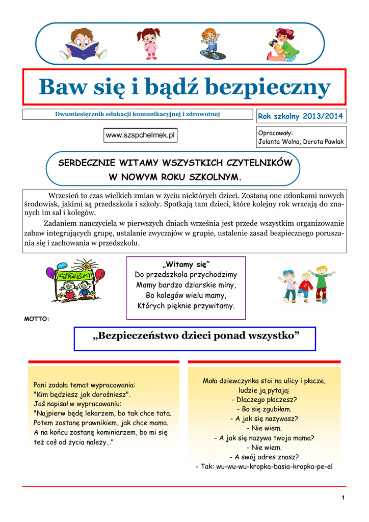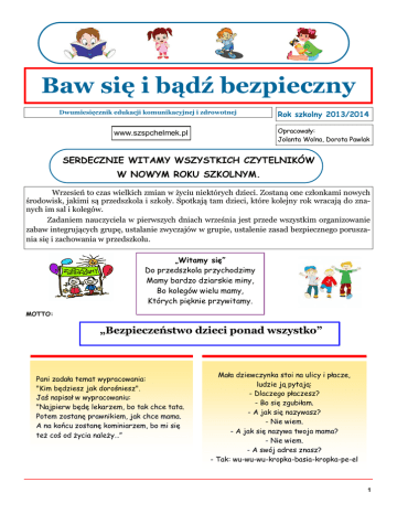 Baw się i bądź bezpieczny Dwumiesięcznik edukacji komunikacyjnej i zdrowotnej Rok szkolny 2013/2014 Opracowały: Jolanta Wolna, Dorota Pawlak www.szspchelmek.pl SERDECZNIE WITAMY WSZYSTKICH CZYTELNIKÓW W NOWYM ROKU SZKOLNYM. Wrzesień to czas wielkich zmian w życiu niektórych dzieci. Zostaną one członkami nowych środowisk, jakimi są przedszkola i szkoły. Spotkają tam dzieci, które kolejny rok wracają do znanych im sal i kolegów. Zadaniem nauczyciela w pierwszych dniach września jest przede wszystkim organizowanie zabaw integrujących grupę, ustalanie zwyczajów w grupie, ustalenie zasad bezpiecznego poruszania się i zachowania w przedszkolu. „Witamy się” Do przedszkola przychodzimy Mamy bardzo dziarskie miny, Bo kolegów wielu mamy, Których pięknie przywitamy. MOTTO: „Bezpieczeństwo dzieci ponad wszystko” Pani zadała temat wypracowania: "Kim będziesz jak dorośniesz". Jaś napisał w wypracowaniu: "Najpierw będę lekarzem, bo tak chce tata. Potem zostanę prawnikiem, jak chce mama. A na końcu zostanę kominiarzem, bo mi się też coś od życia należy…” Mała dziewczynka stoi na ulicy i płacze, ludzie ją pytają: - Dlaczego płaczesz? - Bo się zgubiłam. - A jak się nazywasz? - Nie wiem. - A jak się nazywa twoja mama? - Nie wiem. - A swój adres znasz? - Tak: wu-wu-wu-kropka-basia-kropka-pe-el 1 Zdrowie i bezpieczeństwo przedszkolaka Bezpieczeństwo dzieci przebywających w przedszkolu jest bardzo ważne, ponieważ bezpieczne dziecko to dziecko szczęśliwe, uśmiechnięte i ufne. Przedszkole wyposaża dzieci w nawyki unikania, zapobiegania i możliwie szybkiego pokonywania niebezpieczeństw. Zajęcia i zabawy realizowane są w oparciu o metody aktywizujące myślenie dzieci, np.: zabawy edukacyjne, inscenizacje teatralne, konkursy plastyczne, wycieczki, spotkania z policjantem, strażakiem, pielęgniarką czy lekarzem. Nauczyciel w przedszkolu czuwa nad bezpieczeństwem dzieci, ustala normy postępowania związane z ich bezpieczeństwem: - Regulamin w sali i pomieszczeniach przedszkolnych: korytarz, jadalnia, toalety. - Regulamin zachowania się w ogrodzie przedszkolnym. - Regulamin wyjść na spacer, wycieczkę, wyjazdy autokarowe. Działania profilaktyczne przedszkola to: Bezpieczne przedszkole to: Przybliżenie dzieciom zagrożeń, na które może być narażone. Piękne, czyste, przestronne sale. Nauka odpowiedzialności za swoje czyny, przewidywanie skutków. Wykwalifikowana kadra pedagogiczna. Bezpieczny plac zabaw. Nauka radzenia sobie w różnych sytuacjach. Uśmiechnięty personel. Nauka podejmowania właściwych decyzji Pomoc dziecku w każdej sytuacji. ZABAWY DLA DZIECI I RODZICÓW Zabawa pozwala na poznanie Zabawa z dzieckiem jest świetną okazją do wzajemnego poznania się. Dziecko ma szansę obserwować rodzica, uczyć się od niego, zobaczyć, w jaki sposób dorosły rozwiązuje problemy. Rodzic ma możliwość sprawdzenia, z czym dziecko sobie nie radzi, a w czym jest dobre. Ma szansę dowiedzieć się, jakie są zainteresowania dziecka, by potem móc je rozwijać. Maluch natomiast może uczyć się zasad fair-play. Zabawa jest świetnym czasem na rozmowę. Luźna atmosfera i relaks sprzyjają zwierzaniu się, zadawaniu pytań, mogą być idealnym momentem na wyjaśnienie trudnych dla dziecka spraw. Zabawa "Kot w worku" Zabawa dmuchane obrazki Do nieprzezroczystej torby, worka, reklamówki wrzućcie kilkanaście różnych przedmiotów i zabawek. Zadaniem dziecka jest włożenie rąk do torby i jedynie za pomo- Potrzebujecie: - kartki papieru - farby - odrobiny wody - pędzle - słomki Na czystą kartkę nakładacie za pomocą pędzla odrobinę wody z farbami. Następnie za pomocą słomki rozdmuchujecie plamę z farby w co tylko Wam się zamarzy… cą dotyku odgadnięcie co znajduje się w środku. Dziecko może opisać to co czuje, kształt, wielkość, konsystencję przedmiotu. Baw się i bądź bezpieczny 2 BEZPIECZEŃSTWO W DRODZE DO PRZESZKOLA Wiadomości i umiejętności, jakie powinien posiąść przedszkolak z zakresu bezpieczeństwa: 1) wie, jak trzeba zachować się w sytuacji zagrożenia i gdzie można otrzymać pomoc, umie o nią poprosić; 2) orientuje się w bezpiecznym poruszaniu się po drogach i korzystaniu ze środków transportu; 3) zna zagrożenia płynące ze świata ludzi, roślin oraz zwierząt i unika ich; 4) wie, że nie może samodzielnie zażywać lekarstw i stosować środków chemicznych (np. środków czystości); 5) próbuje samodzielnie i bezpiecznie organizować sobie czas wolny w przedszkolu i w domu; ma rozeznanie, gdzie można się bezpiecznie bawić, a gdzie nie. Przechodzimy przez ulicę Anielewska W. Na chodniku przystań bokiem, raz, dwa, trzy. Popatrz w lewo bystrym wzrokiem, raz, dwa, trzy. Skieruj w prawo wzrok sokoli, znów na lewo spójrz powoli, jezdnia wolna, więc swobodnie mogą przez nią przejść przechodnie, raz, dwa, raz, dwa, raz, dwa, raz. WAŻNE NUMERY 999 997 POGOTOWIE RATUNKOWE POLICJA 998 STRAŻ POZARNA 992 POGOTOWIE GAZOWE 112 NUMER ALARMOWY UŻYWANY W SIECI KOMÓRKOWEJ Baw się i bądź bezpieczny 3 10 PRZYKAZAŃ BEZPIECZNEGO PRZEDSZKOLAKA Każdy przedszkolak powinien bawić się bezpiecznie i działać rozsądnie. Przykazanie 1- „UWAGA PALI SIĘ” kiedy przedszkolak zauważy pożar w okolicy, u sąsiada, w swoim domu, to dzwoni do straży pożarnej, podając numer 998, albo dzwoniąc z telefonu komórkowego podaje numer 112. Przykazanie 2- „BIEDNE ZWIERZĘTA”- bezpieczny przedszkolak nie dotyka obcych zwierząt, bo wie, że mogą być chore, groźne dla otoczenia. Przykazanie 3- „STRZELAJ GOLA”- każdy wie, ze gra w piłkę jest świetną zabawą, ale jeśli będzie bawił się zbyt blisko drogi może być przyczyną wypadku lub sam ulegnie wypadkowi. Bezpieczne przedszkolaki bawią się na placu zabaw lub boisku szkolnym. Przykazanie 4- „PAŁKA ZAPAŁKA DWA KIJE”- każdy przedszkolak wie, że nie należy się bawić zapałkami, bo można spowodo