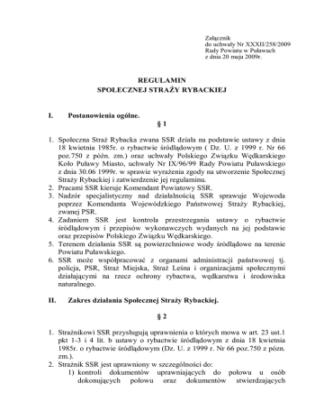 Załącznik do uchwały Nr XXXII/258/2009 Rady Powiatu w Puławach z dnia 20 maja 2009r. REGULAMIN SPOŁECZNEJ STRAŹY RYBACKIEJ I. Postanowienia ogólne. §1 1. Społeczna Straż Rybacka zwana SSR działa na podstawie ustawy z dnia 18 kwietnia 1985r. o rybactwie śródlądowym ( Dz. U. z 1999 r. Nr 66 poz.750 z późn. zm.) oraz uchwały Polskiego Związku Wędkarskiego Koło Puławy Miasto, uchwały Nr IX/96/99 Rady Powiatu Puławskiego z dnia 30.06 1999r. w sprawie wyrażenia zgody na utworzenie Społecznej Straży Rybackiej i zatwierdzenie jej regulaminu. 2. Pracami SSR kieruje Komendant Powiatowy SSR. 3. Nadzór specjalistyczny nad działalnością SSR sprawuje Wojewoda poprzez Komendanta Wojewódzkiego Państwowej Straży Rybackiej, zwanej PSR. 4. Zadaniem SSR jest kontrola przestrzegania ustawy o rybactwie śródlądowym i przepisów wykonawczych wydanych na jej podstawie oraz przepisów Polskiego Związku Wędkarskiego. 5. Terenem działania SSR są powierzchniowe wody śródlądowe na terenie Powiatu Puławskiego. 6. SSR może współpracować z organami administracji państwowej tj. policja, PSR, Straż Miejska, Straż Leśna i organizacjami społecznymi działającymi na rzecz ochrony rybactwa, wędkarstwa i środowiska naturalnego. II. Zakres działania Społecznej Straży Rybackiej. §2 1. Strażnikowi SSR przysługują uprawnienia o których mowa w art. 23 ust.1 pkt 1-3 i 4 lit. b ustawy o rybactwie śródlądowym z dnia 18 kwietnia 1985r. o rybactwie śródlądowym (Dz. U. z 1999 r. Nr 66 poz.750 z pózn. zm.). 2. Strażnik SSR jest uprawniony w szczególności do: 1) kontroli dokumentów uprawniających do połowu u osób dokonujących połowu oraz dokumentów stwierdzających pochodzenie ryb u osób przetwarzających lub wprowadzających ryby do obrotu, 2) kontroli ilości masy i gatunków odłowionych ryb, przetwarzanych lub wprowadzanych do obrotu oraz przedmiotów służących do ich połowu, 3) zabezpieczania porzuconych ryb i przedmiotów służących do ich połowu w przypadku niemożności ustalenia ich posiadacza, 4) żądanie wyjaśnień i wykonywanie czynności niezbędnych do przeprowadzenia kontroli, a w przypadku uzasadnionego podejrzenia o popełnienie przestępstwa lub wykroczenia odebranie za pokwitowaniem ryb i przedmiotów służących do ich połowu, z tym że ryby należy przekazać za pokwitowaniem uprawnionemu do rybactwa lub na cele charytatywne, a przedmioty zabezpieczyć i przekazać do Zarządu Okręgu PZW w Lublinie w ciągu 30 dni. III. Organizacja Społecznej straży Rybackiej. §3 1. W skład SSR wchodzą: 1. Komendant Powiatowy Społecznej Straży Rybackiej, 2. Komendanci oraz zastępcy komendantów grup terenowych SSR, 3. Strażnicy SSR 2. SSR na terenie Powiatu działa zorganizowanych przy kołach PZW. w ramach grup terenowych 3. W skład grupy terenowej wchodzą strażnicy 1. będący członkami koła, przy którym grupa jest zorganizowana, 2. członkowie innych kół, w których nie utworzono grupy terenowej SSR, 3. członkowie innych kół zainteresowani działaniem w SSR na terenie powiatu 4. chętni do pracy w SSR nie zrzeszeni w PZW. 4. Komendantem Grupy terenowej, Zastępcą komendanta grupy terenowej, strażnikiem SSR może być osoba, która: 1) posiada kwalifikacje strażnika PSR, 2) jest obywatelem polskim, 3) wyraziła zgodę na pełnienie funkcji społecznego strażnika rybackiego poświadczoną własnoręcznym podpisem, 4) ukończyła 21 lat i ma pełną zdolność do wykonywania czynności prawnych oraz korzysta z pełni praw publicznych, 2 5) posiada odpowiedni stan zdrowia do wykonywania czynności patrolowych w terenie, 6) złożyła pisemne oświadczenie że nie była karana, 7) posiada znajomość przepisów w zakresie ochrony i połowu ryb, 8) odbyła minimum 3 miesięczny staż w grupie terenowej (potwierdzony przez komendanta grupy terenowej) oraz posiada rekomendację Zarządu Koła PZW właściwego dla grupy terenowej. 9) została zatwierdzona przez komendanta Powiatowego SSR na wniosek Zarządu Koła które rekomenduje osobę chętną zostać strażnikiem SSR. 5. Komendantem Powiatowym SSR może być osoba, która: 1) posiada kwalifikacje strażnika PSR, 2) jest obywatelem polskim, 3) wyraziła zgodę na pełnienie funkcji społecznego strażnika rybackiego poświadczoną własnoręcznym podpisem, 4) ukończyła 21 lat i ma pełną zdolność do wykonywania czynności prawnych oraz korzysta z pełni praw publicznych, 5) posiada odpowiedni stan zdrowia do wykonywania czynności patrolowych w terenie, 6) złożyła pisemne oświadczenie że nie była karana, 7) posiada znajomość przepisów w zakresie ochrony i połowu ryb, 8) posiada rekomendację Zarządów Kół PZW działających na terenie powiatu puławskiego. 6. Posiadanie uprawnień strażnika dokumentowane jest legitymacją i odznaką, których wzór ustala Rozporządzenie Ministra Rolnictwa i Gospodarki Żywnościowej z dnia 9 maja 1997r. w sprawie praw i obowiązków pracowniczych, zasad wynagradzania, wzorów oznak, legitymacji służbowej, odznaki służbowej i umundurowania strażników Państwowej Straży Rybackiej oraz wzoru odznaki i legitymacji strażnika Społecznej Straży Rybackiej. ( Dz. U. Nr 55 poz. 354 z póz. zm.). 7. Starosta Powiatu powołuje Komendanta Powiatowego Społecznej Straży Rybackiej na wniosek Zarządu Koła PZW działającego na terenie Powiatu na 4 letnią kadencję po zasięgnięciu opinii Zarządów Kół PZW z terenu powiatu. 8. Starosta Powiatu może odwołać Komendanta Powiatowego Społecznej Straży Rybackiej przed upływem kadencji na wniosek Zarządu Koła PZW działającego na terenie Powiatu na oraz po zasięgnięciu opinii Zarządów Kół PZW z terenu powiatu. 3 9. Komendantów grup terenowych oraz ich zastępców powołuje i odwołuje Zarząd Koła do którego przyporządkowana jest grupa terenowa. 10. Strażnicy SSR mogą działać samodzielnie w składzie patrolu PSR lub innych organizacji zainteresowanych 